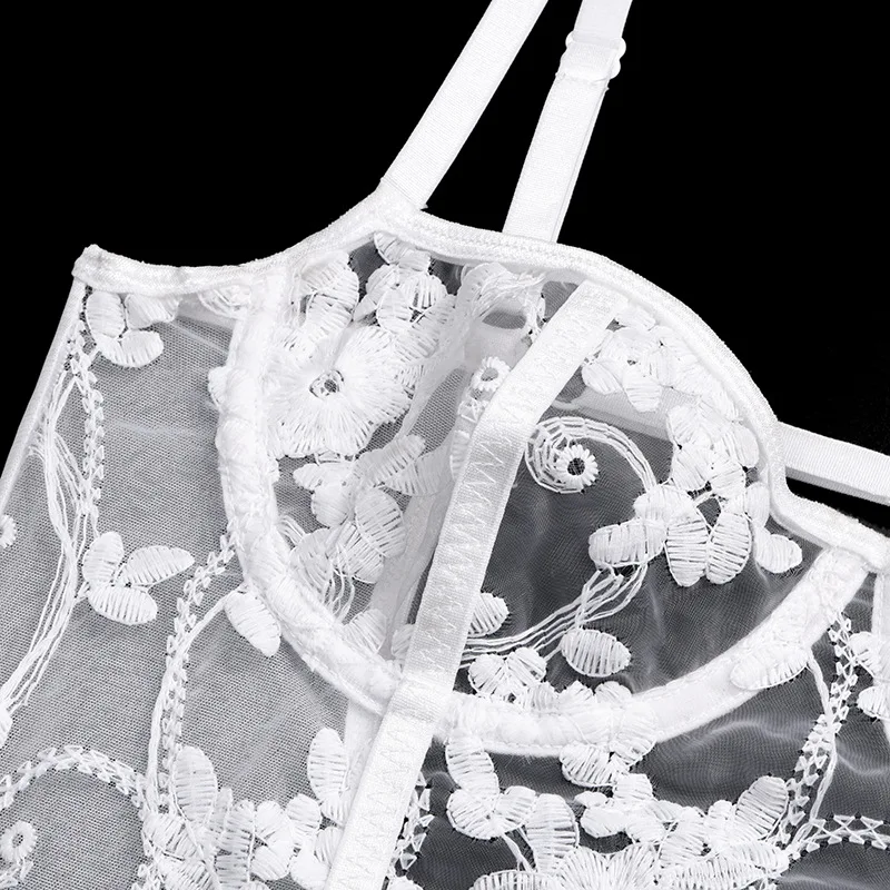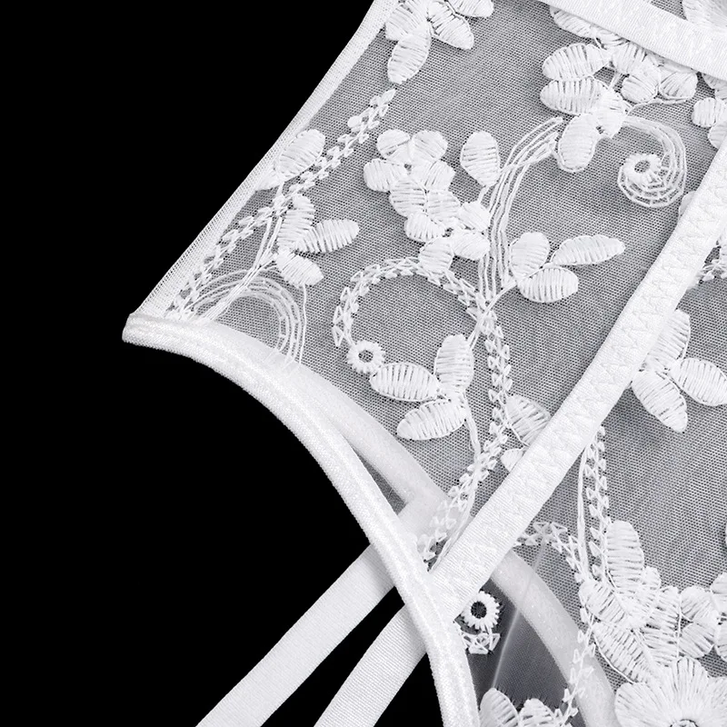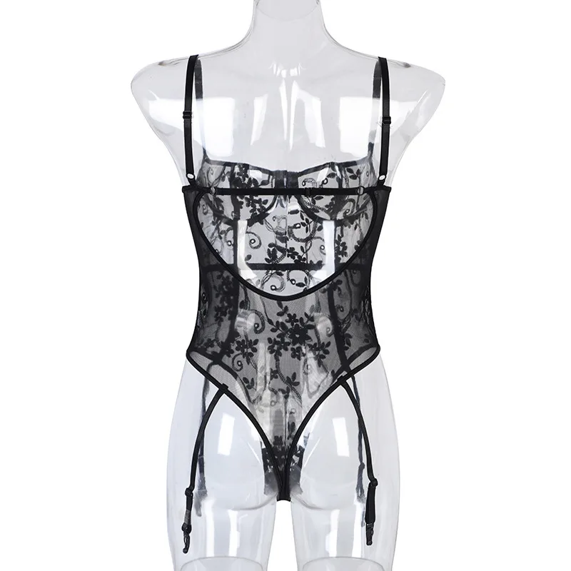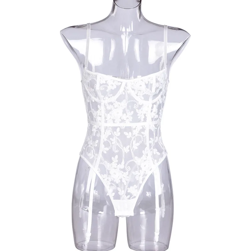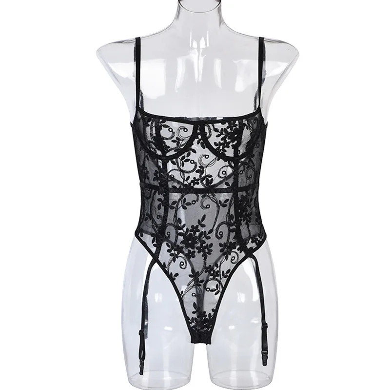 Floral Embroidery Sexy Lingerie Sling Bodysuit Lace Straps Women Mesh See-Through Sensual Lingerie Exotic Garters Underwear Set