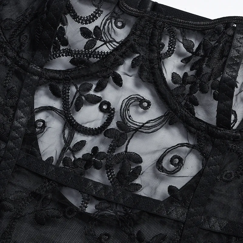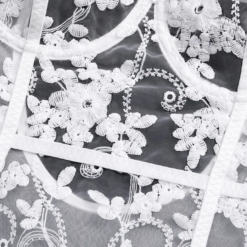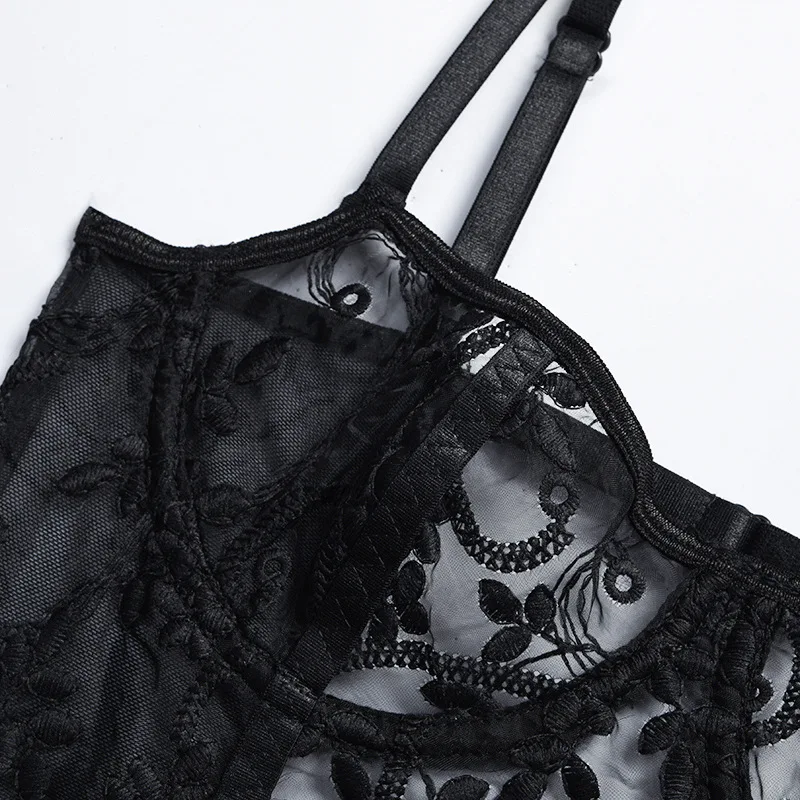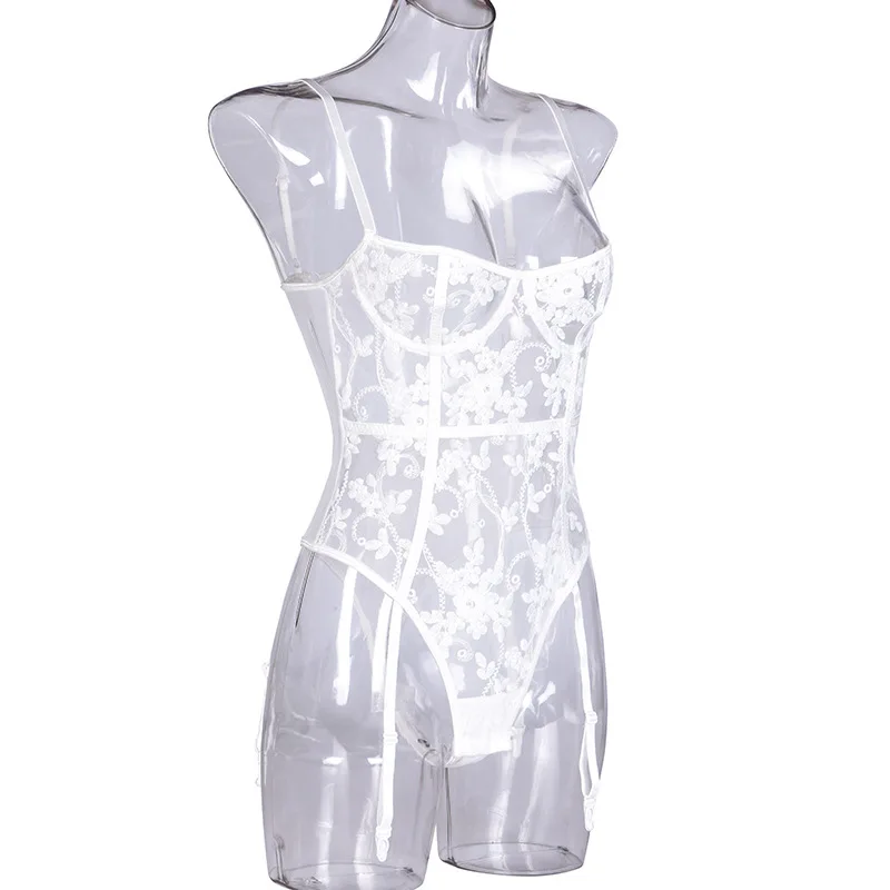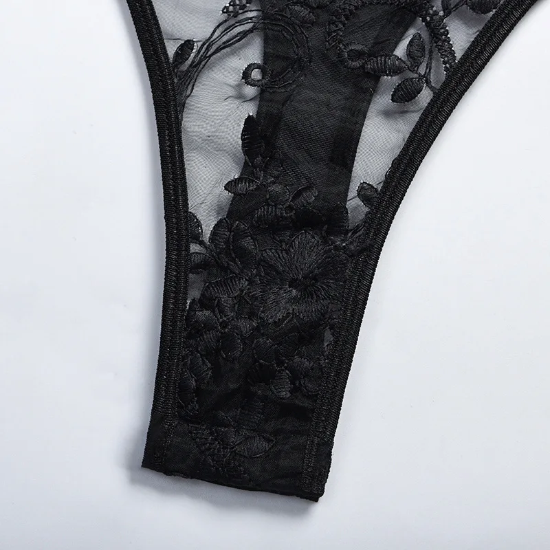 Floral Embroidery Sexy Lingerie Sling Bodysuit Lace Straps Women Mesh See-Through Sensual Lingerie Exotic Garters Underwear Set