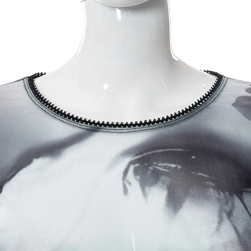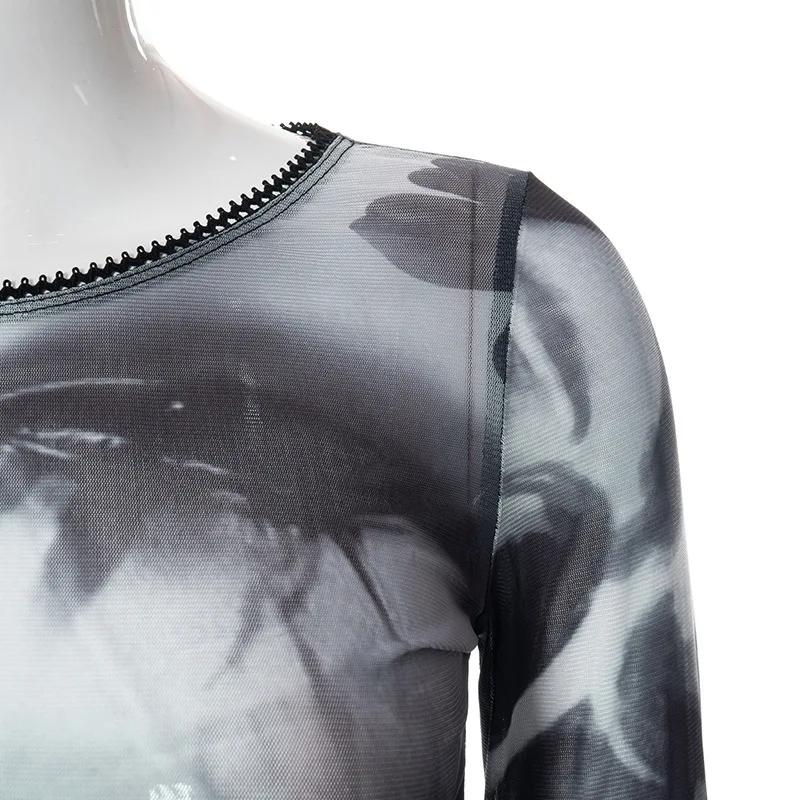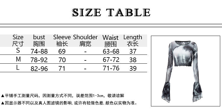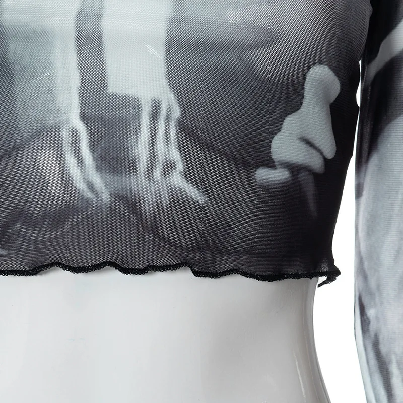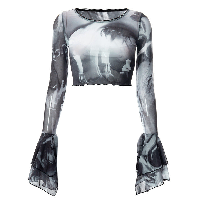 Ins Fashion 2022 Summer Chic Print Mesh Women's Clothing Crop Top Rave Festival Sexy Trumpet Long Sleeves Tops Streetwear