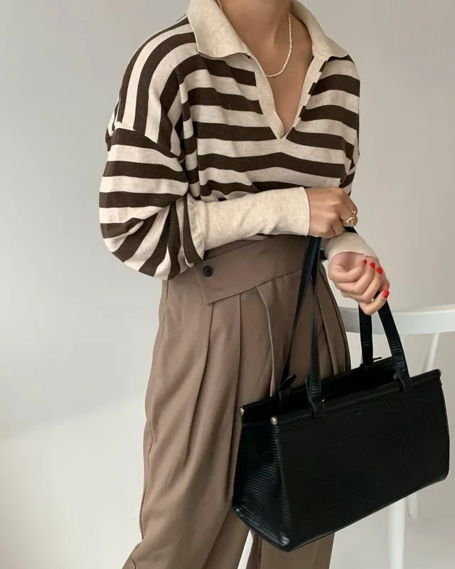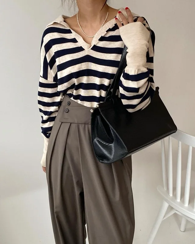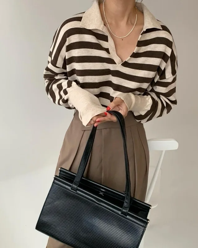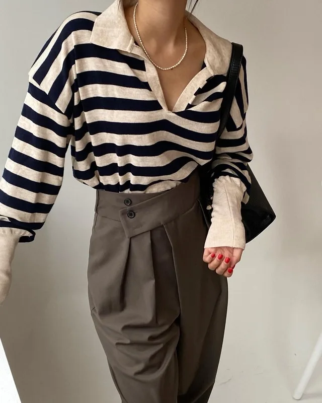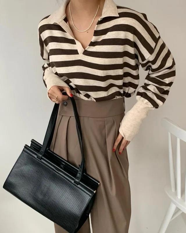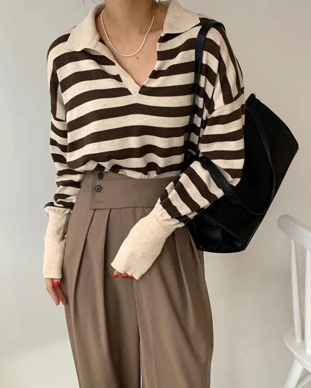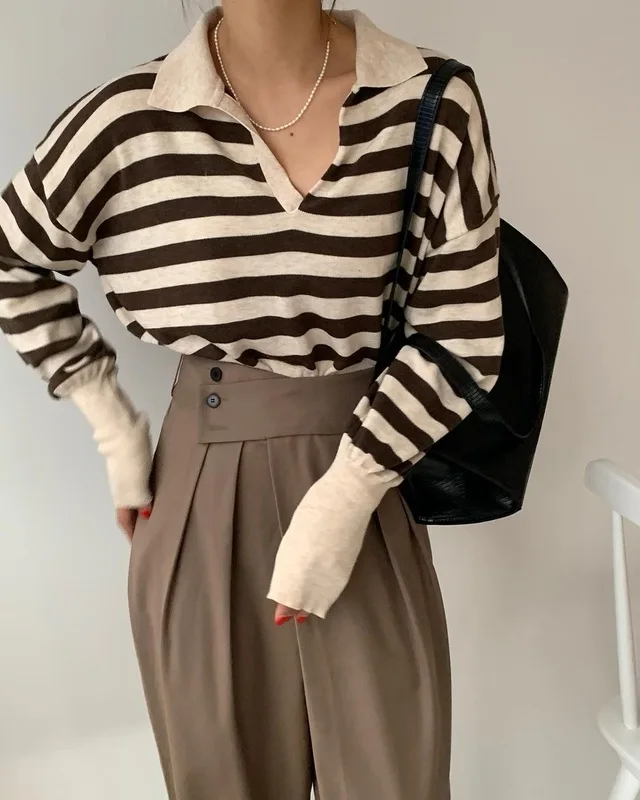Korean Chic Contrast Stripe Loose Knitted Pullovers Women All Match Casual Turn Down Collar Loose Sweater Women Autumn 2022 Tops