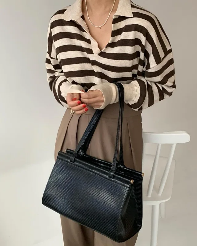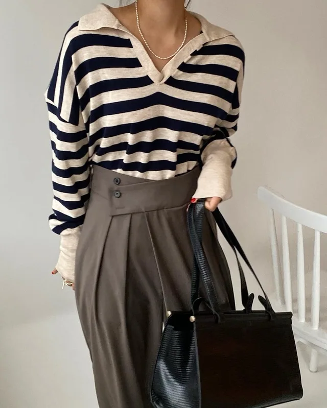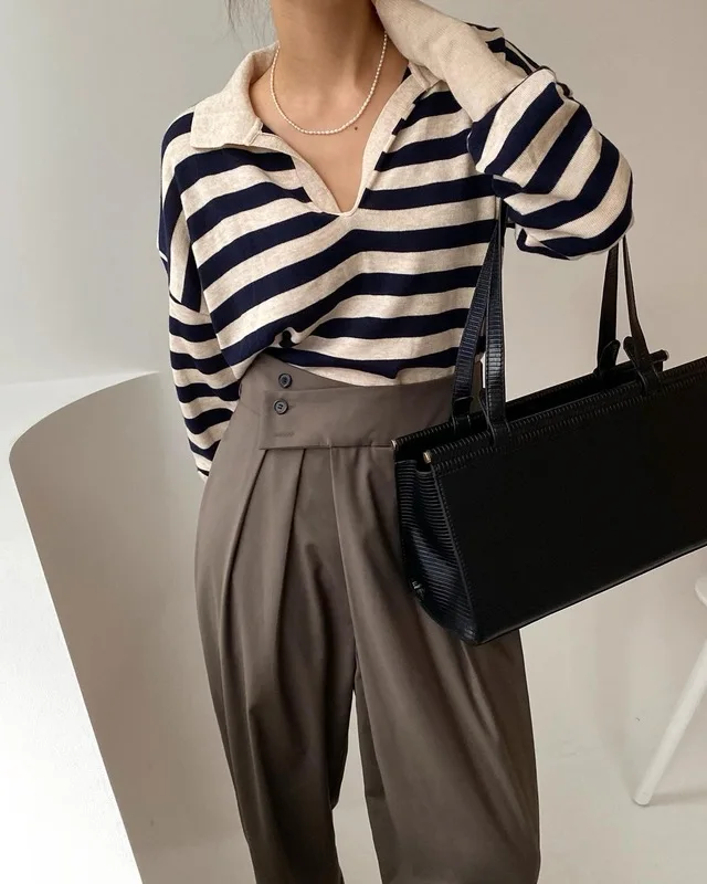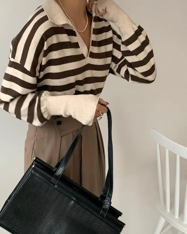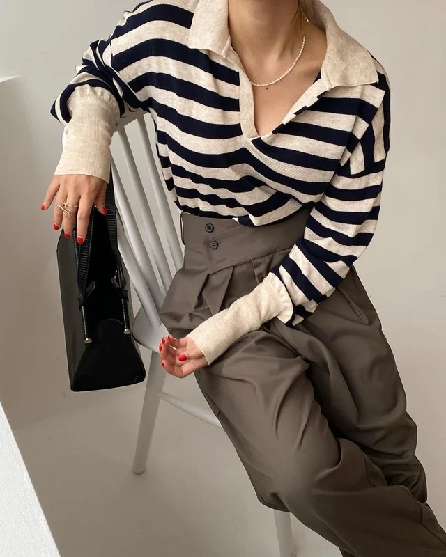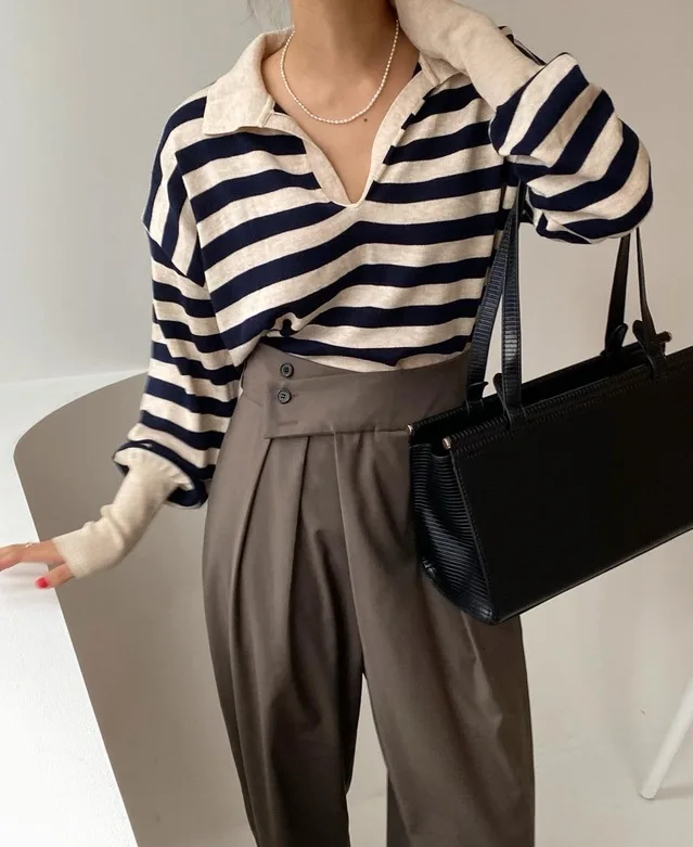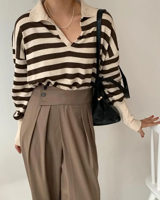 Korean Chic Contrast Stripe Loose Knitted Pullovers Women All Match Casual Turn Down Collar Loose Sweater Women Autumn 2022 Tops
