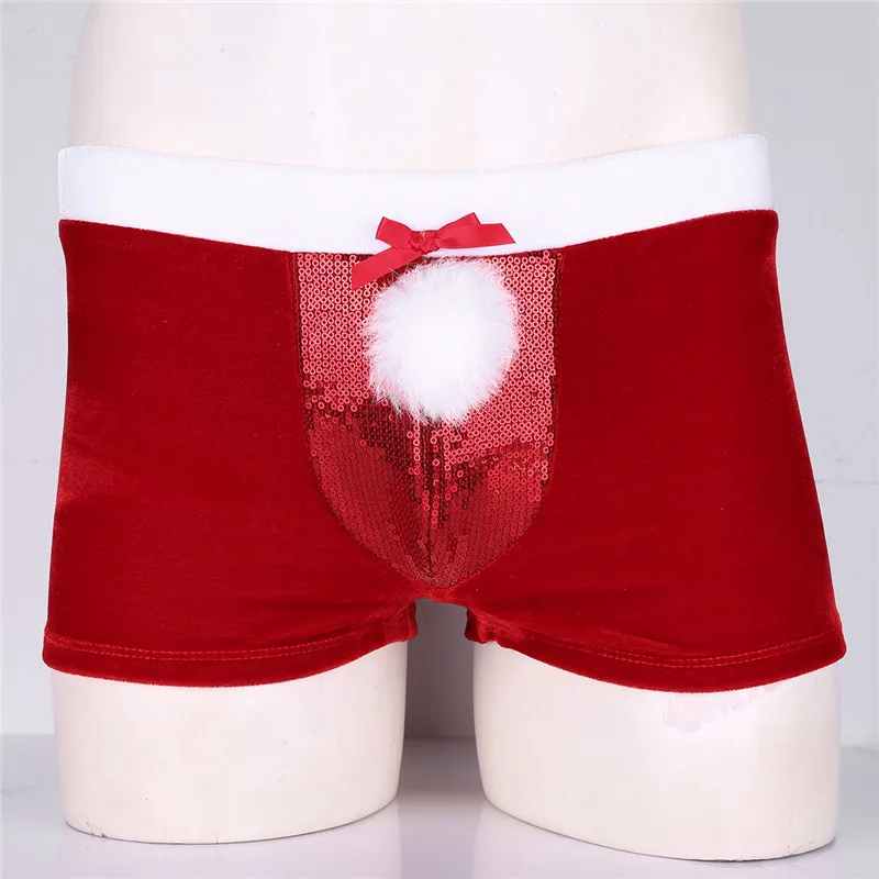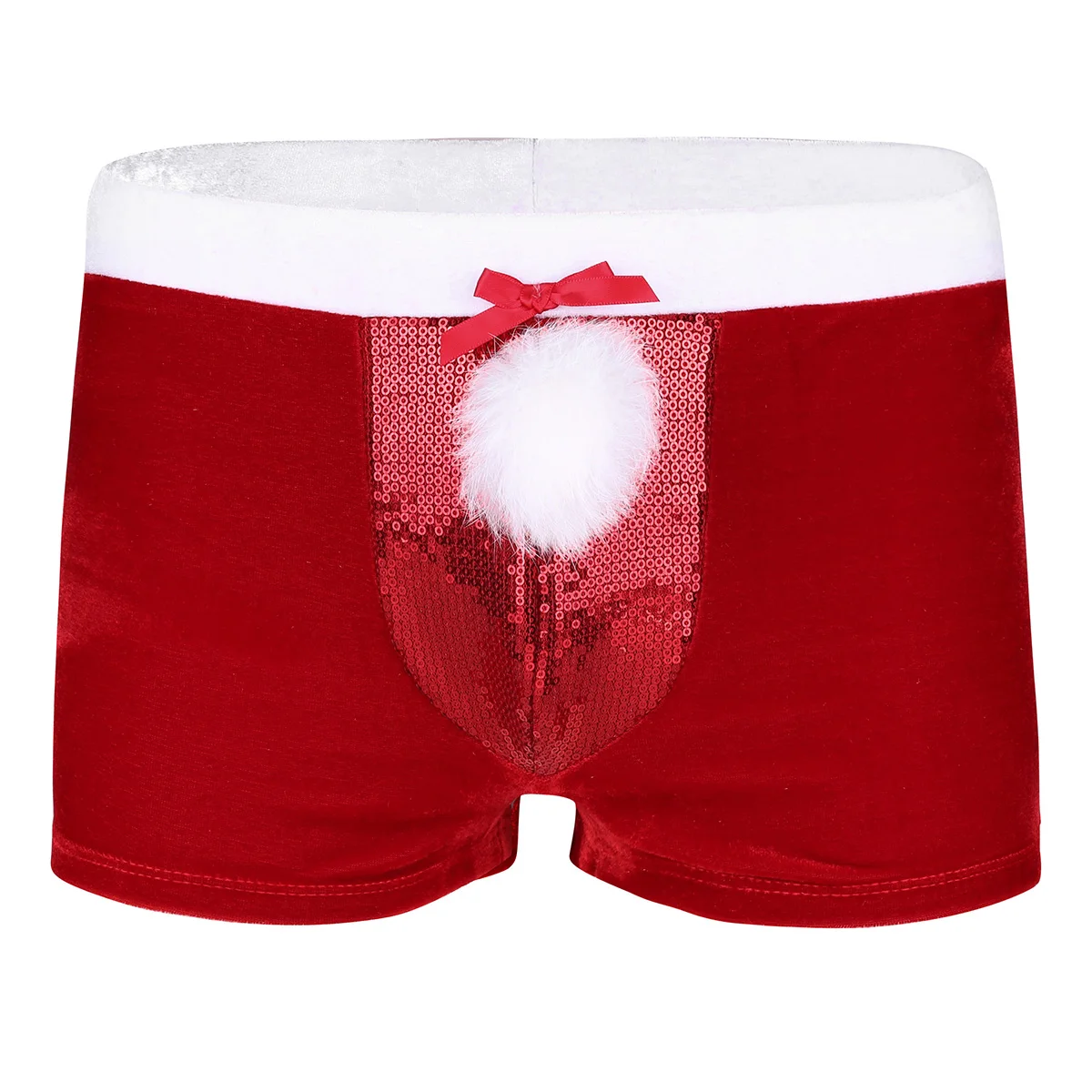 Mens Red Lingerie Velvet Funny Christmas Boxer Shorts Santa Claus Underwear Low Rise Shiny Sequins Bulge Pouch with a Plush Ball