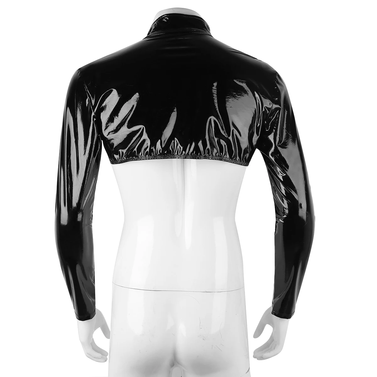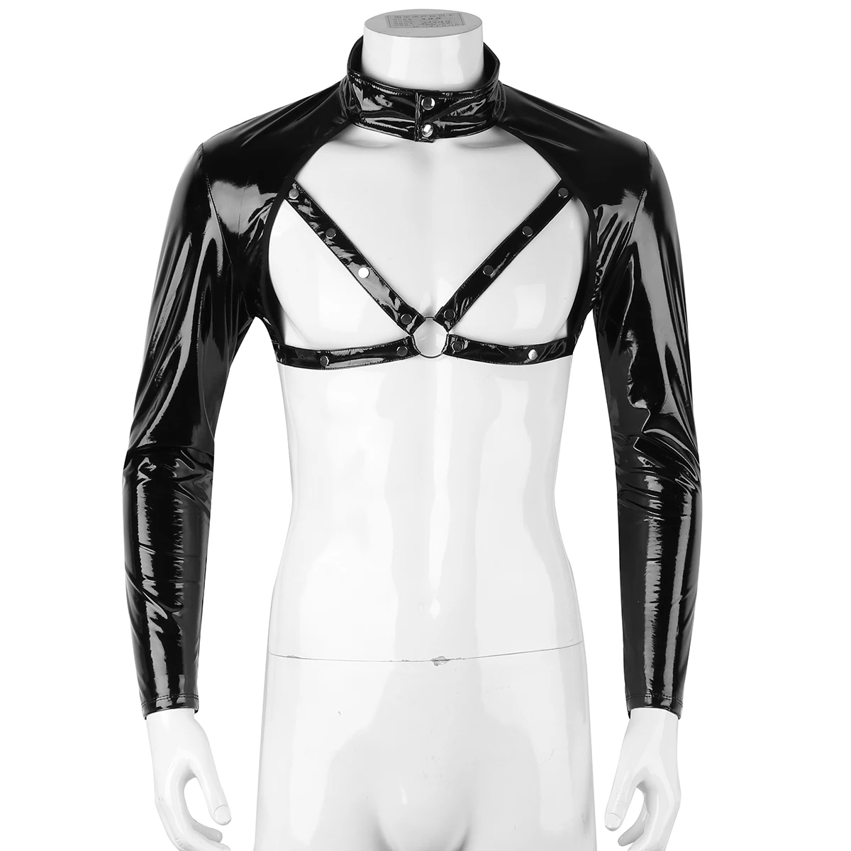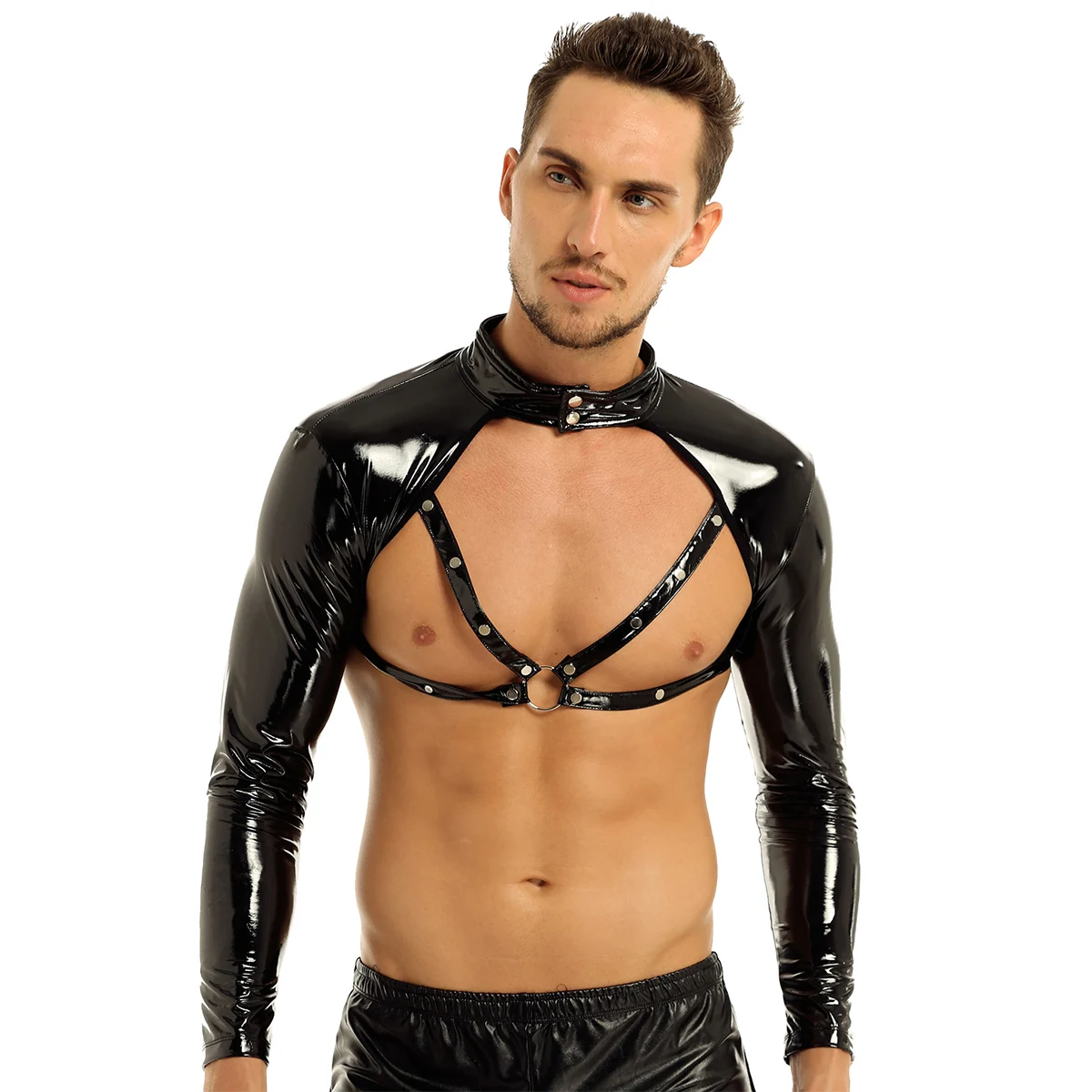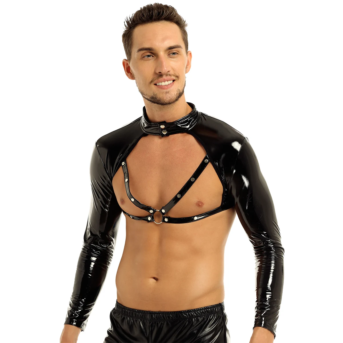 Men’s wet look faux leather half tank crop tops, good stretchy fabric.