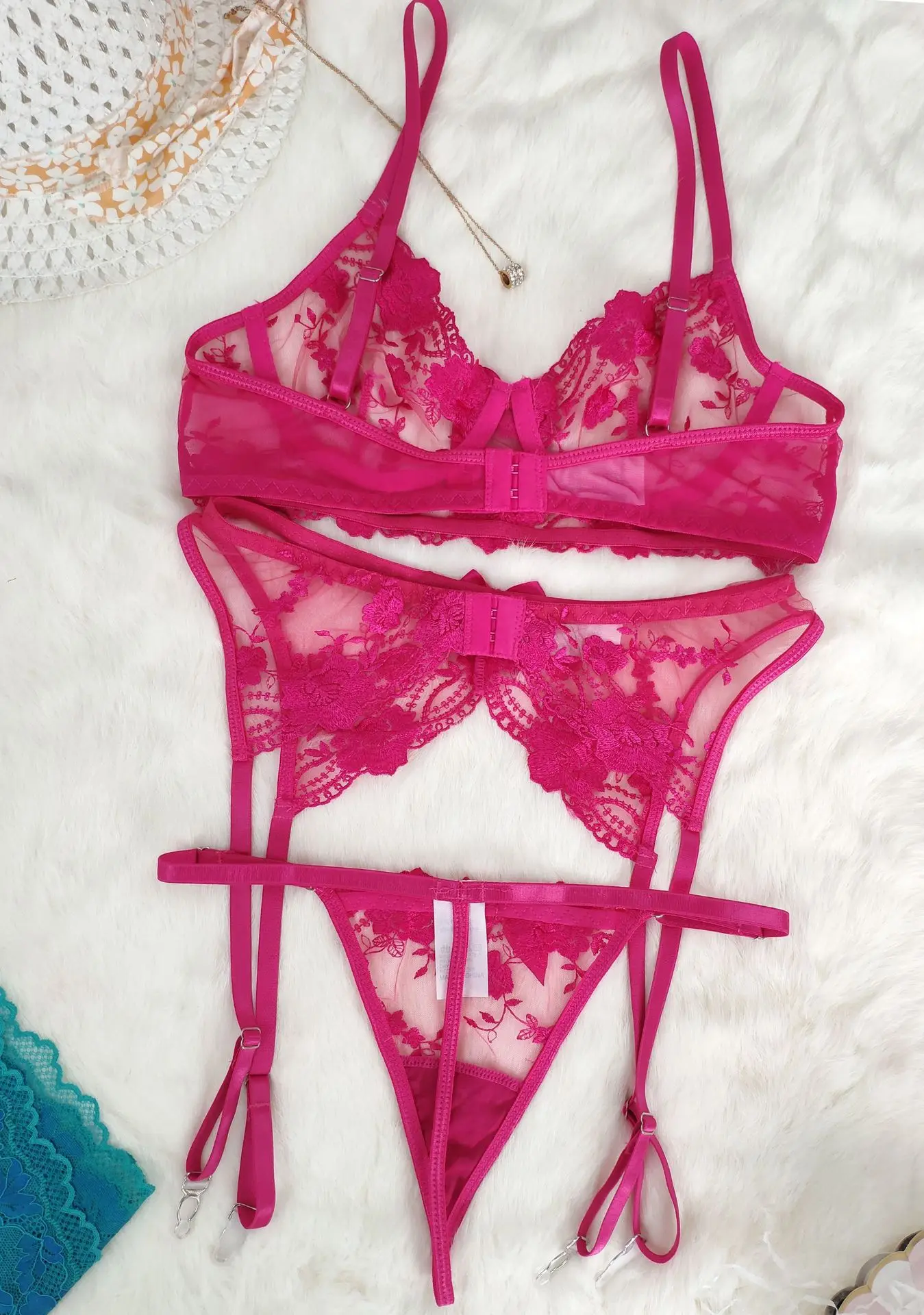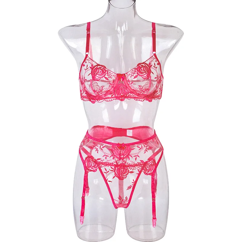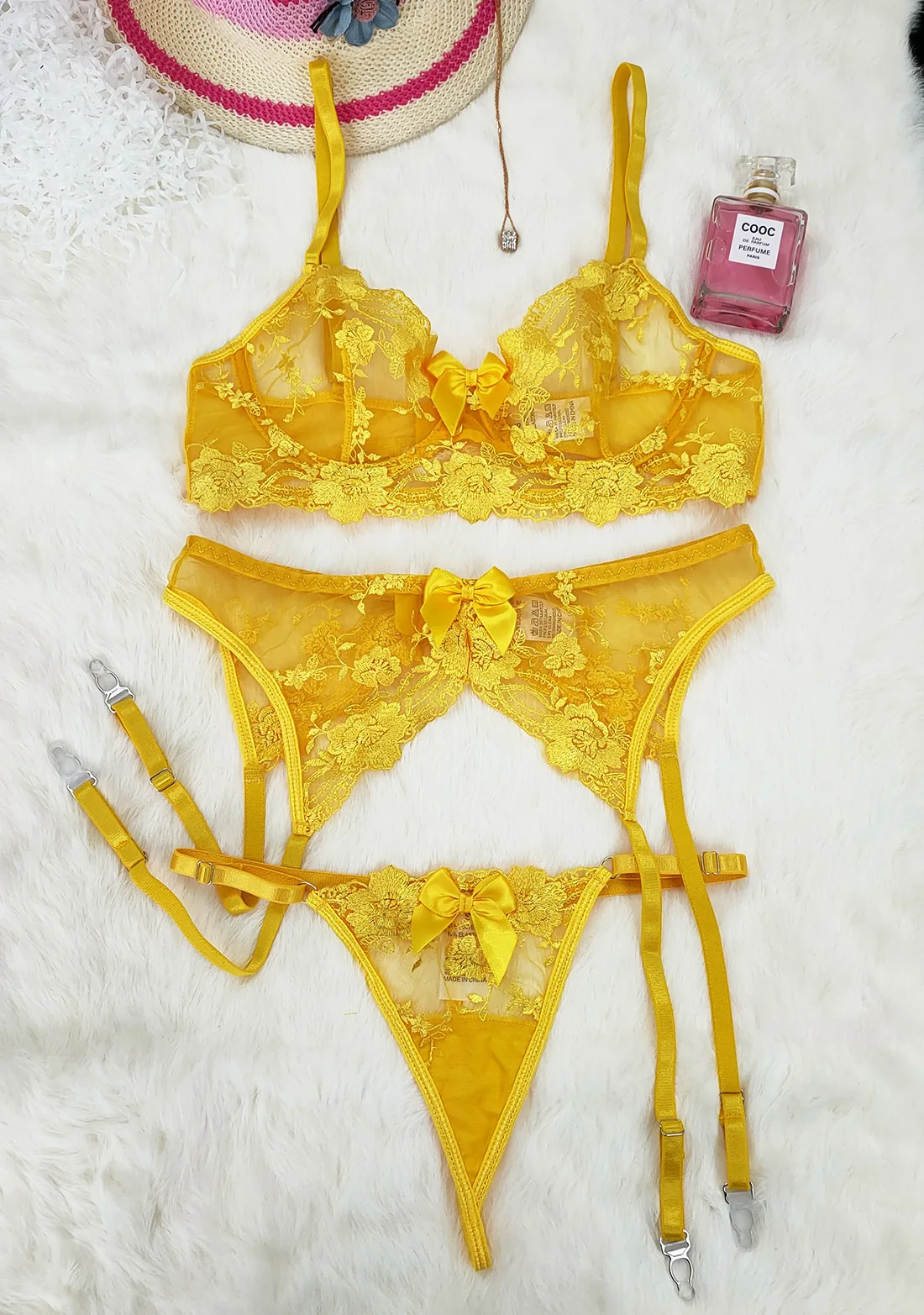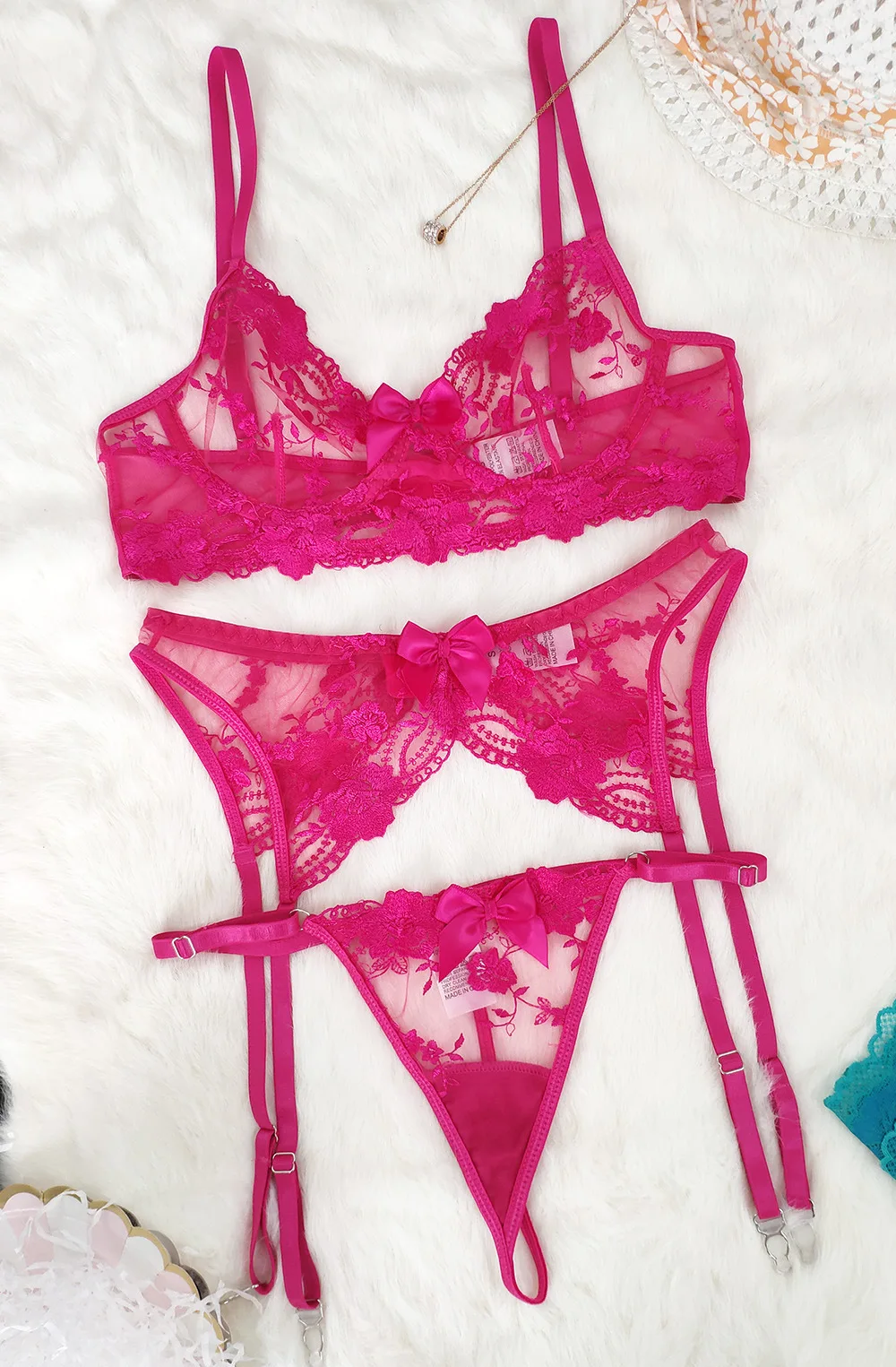 New Floral Embroidery Mesh Lingerie Underwear Set Women's Lace Gathered Underwire Bow-Knot Bra and Garters Panties 3PCS Set
