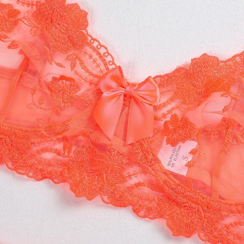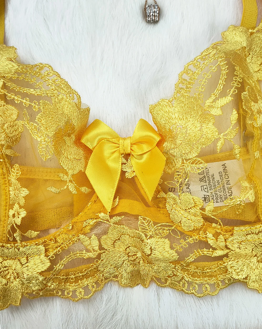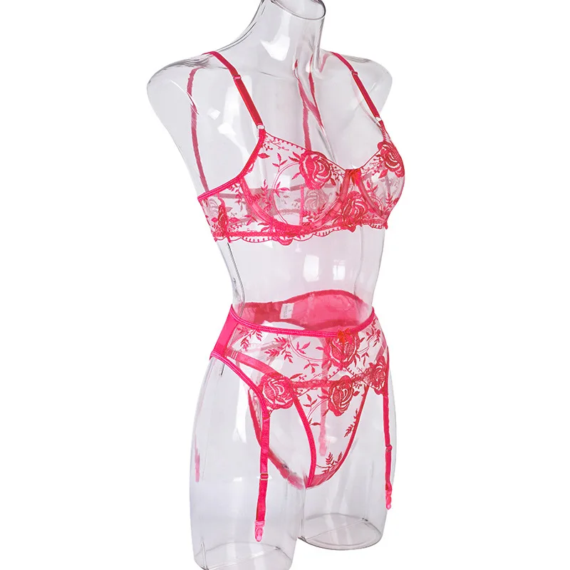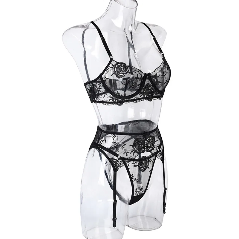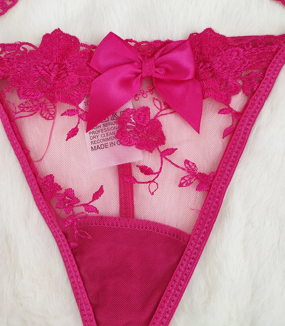 New Floral Embroidery Mesh Lingerie Underwear Set Women's Lace Gathered Underwire Bow-Knot Bra and Garters Panties 3PCS Set