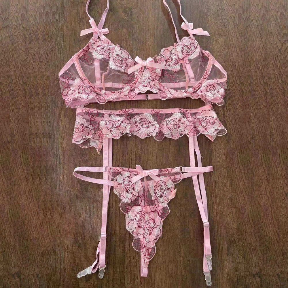 New Sexy Floral Embroidery Perspective Underwear with Garters Underwire Bra and Briefs Set Sensual Lingerie Exotic 3 Pieces Set
