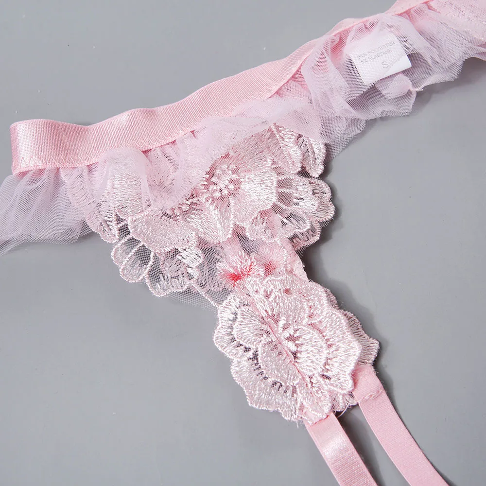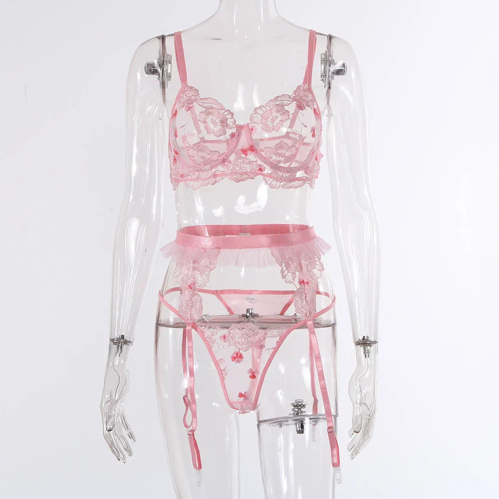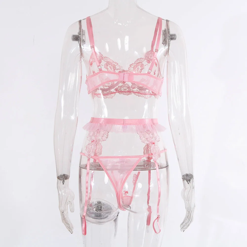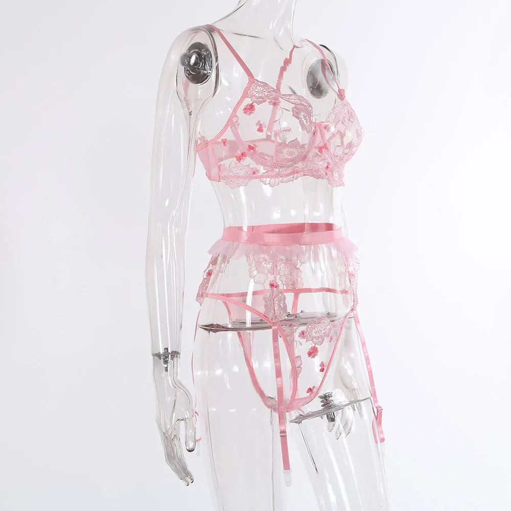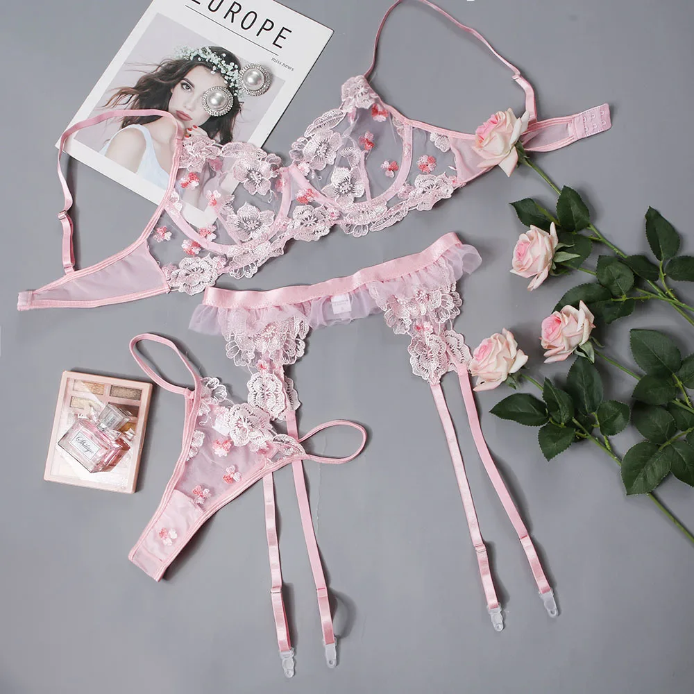 New Women Lingerie Pink Bra and Panty Sensual Lace Mesh Underwear Langerie Floral Embroidery Transparent 3pcs Patchwork Costume