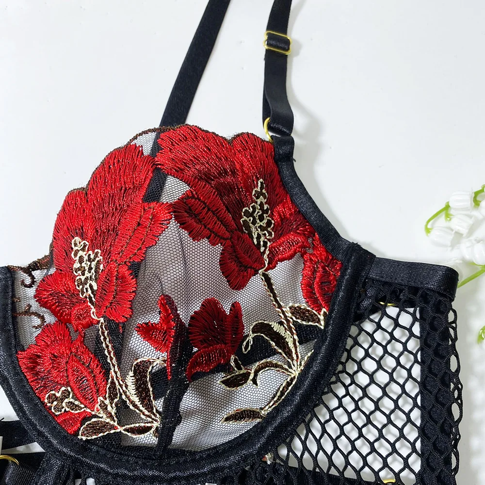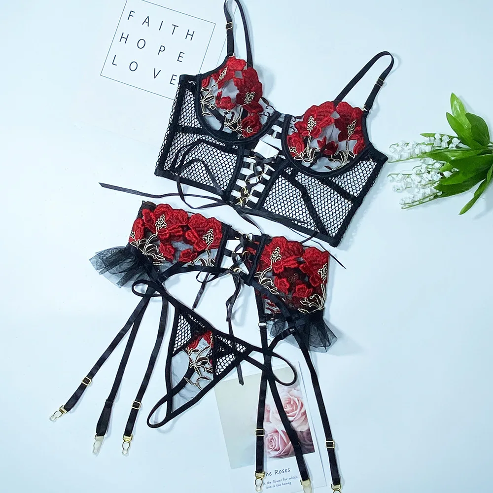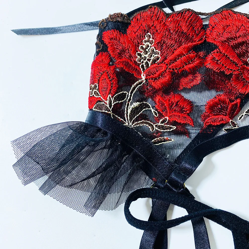 Ruffled Erotic Lingerie Sexy Bandage Transparent Bra Underwear Sex Mesh Garters Sensual Thongs 3-Piece Floral Embroider Intimate