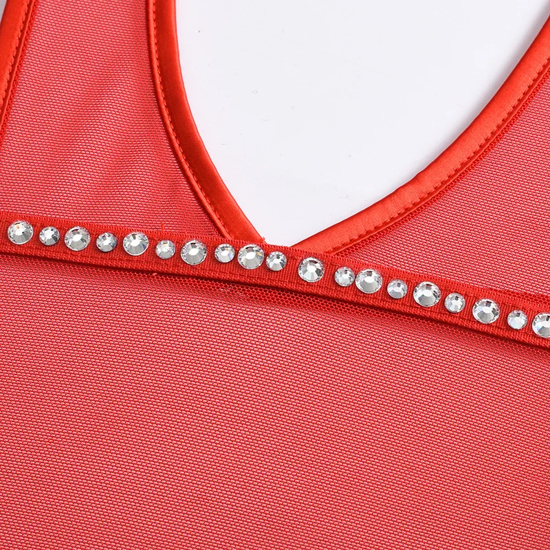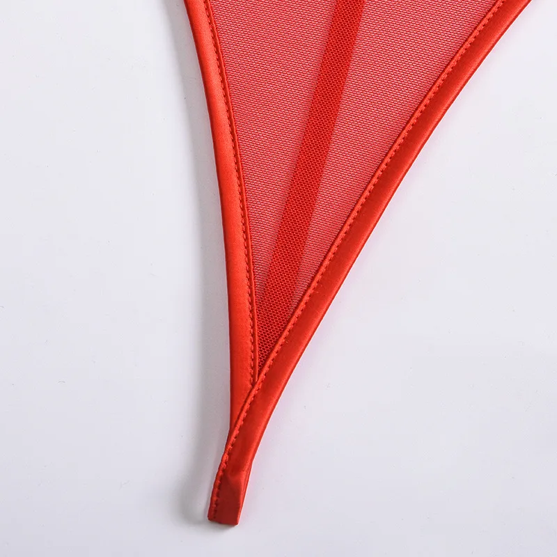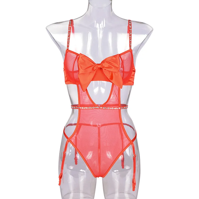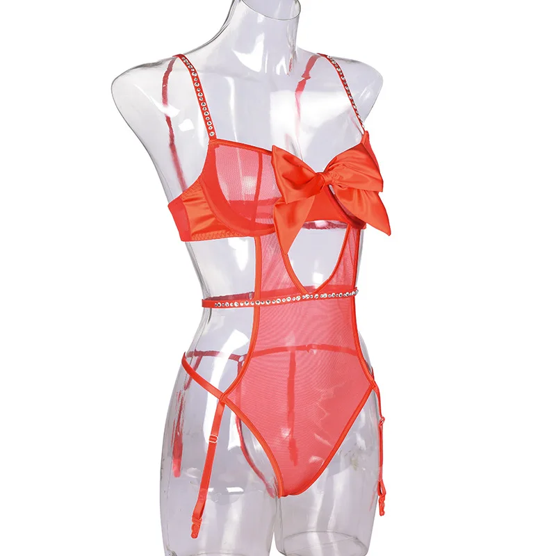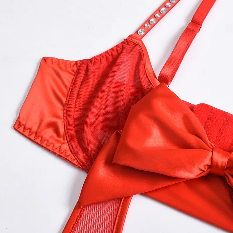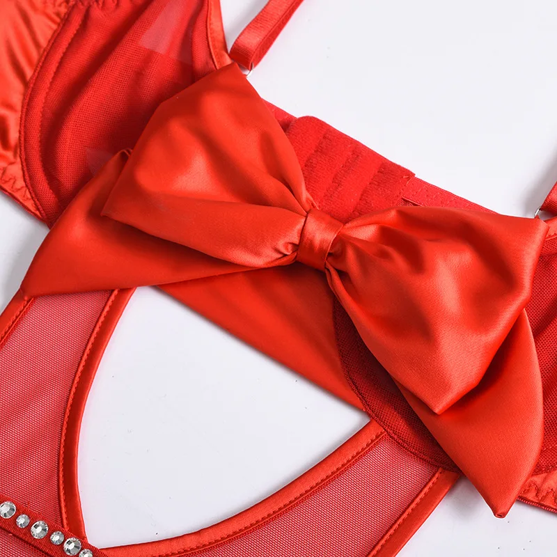 Sensual Lingerie Bodysuit Women Rhinestone Christmas Red Bowknot Erotic Lingerie Mesh Hollow Out Valentine's Day Sexy Costume