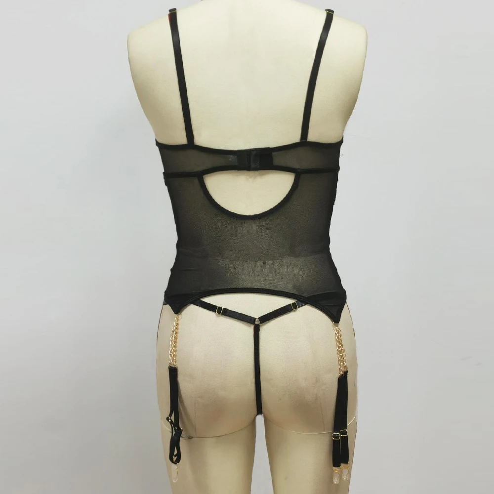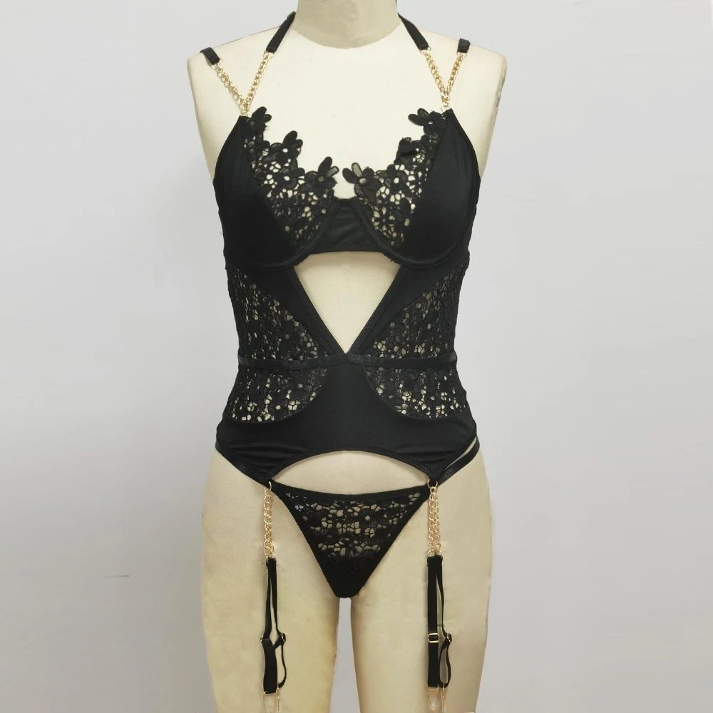 Sensual Lingerie Woman Sexy Floral Embroidery Satin Lace Bodysuit Hollow Out Skinny Body Top Femme Metal Chain Garter Erotic Bra