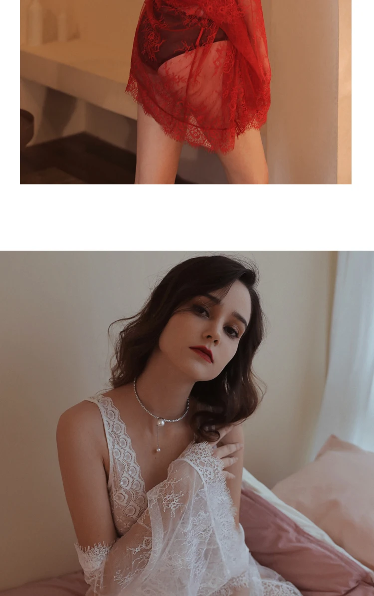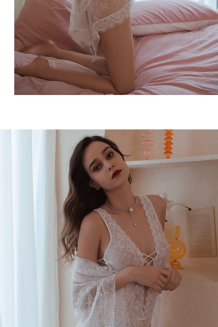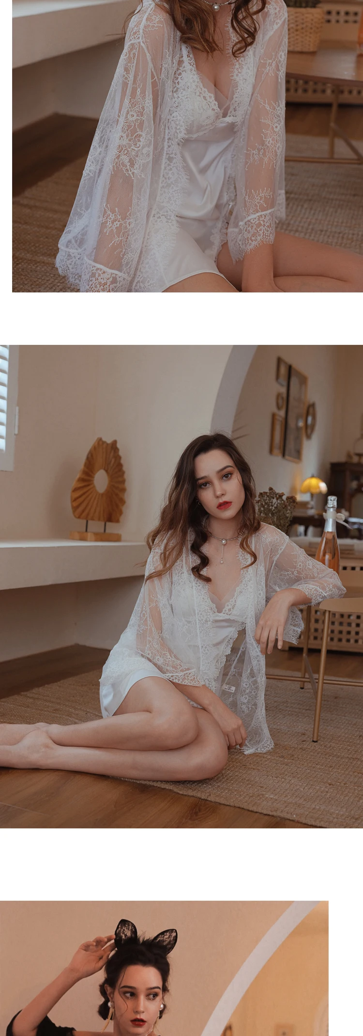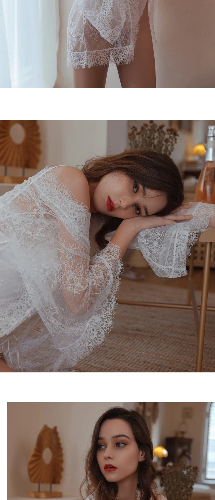 Sexy Pajamas Women's Lace Transparent Lace-up Kimono-Style Wide-Sleeve Eyelash Lace Robes Morning Gowns Summer Bathrobe
