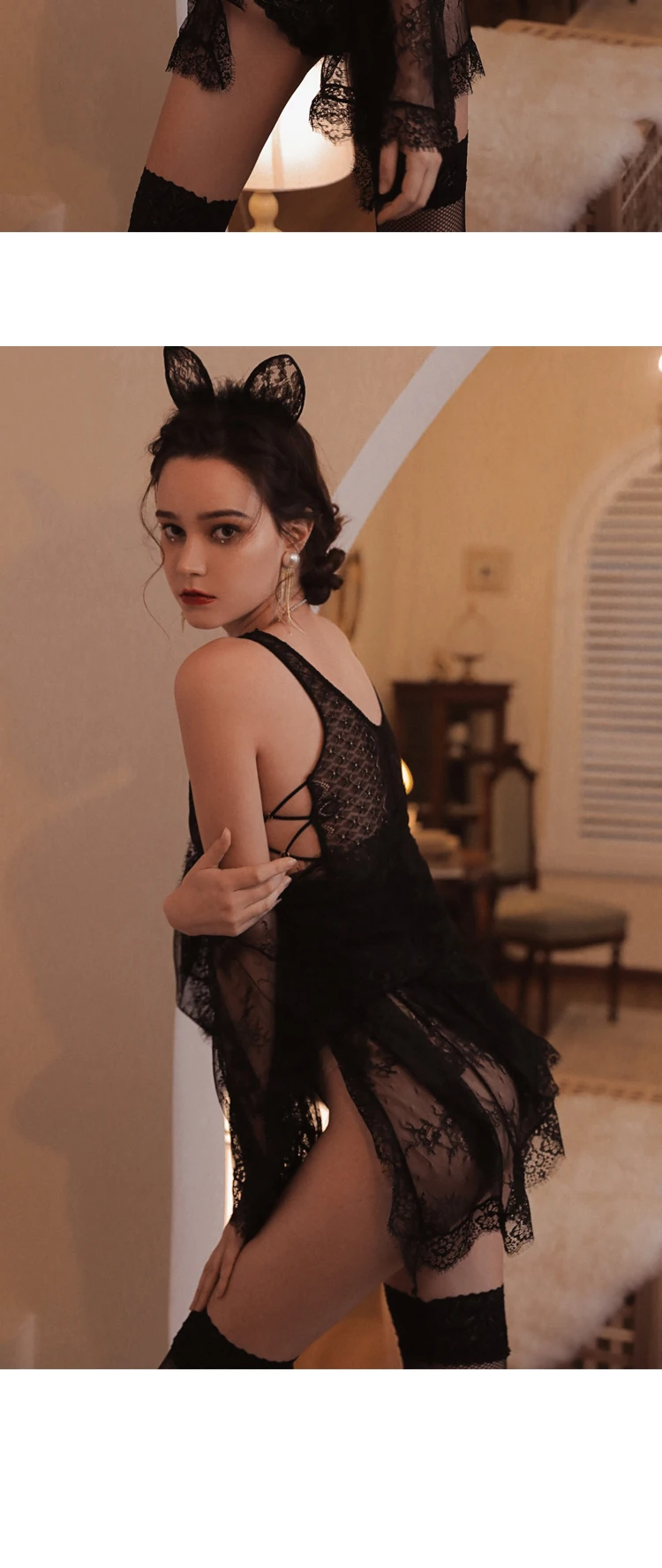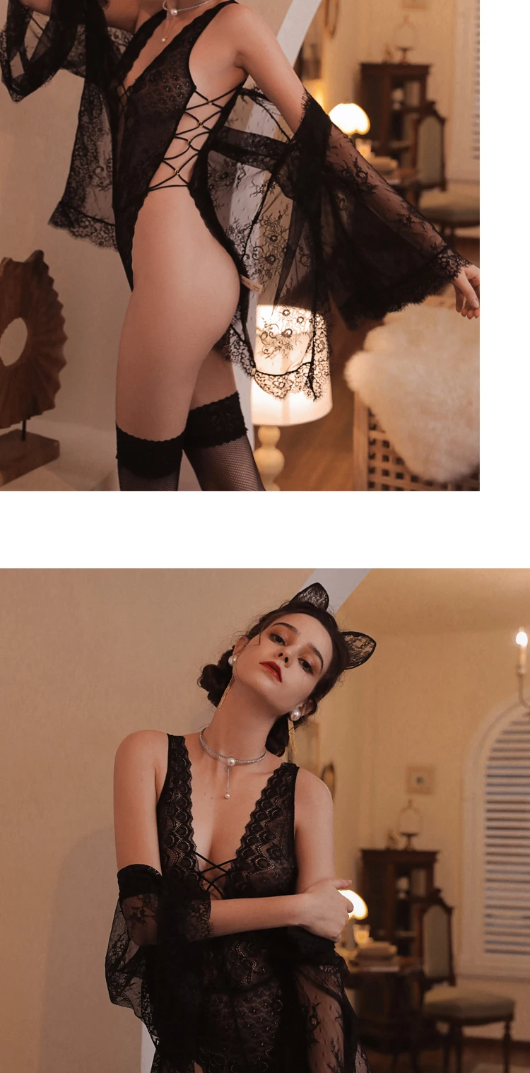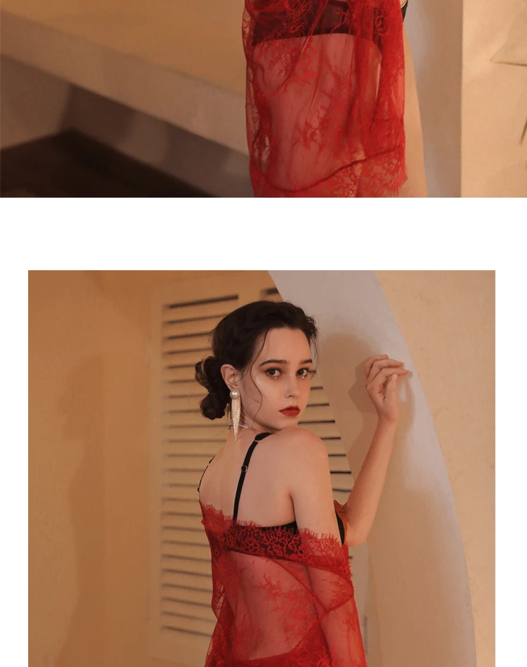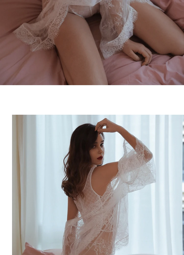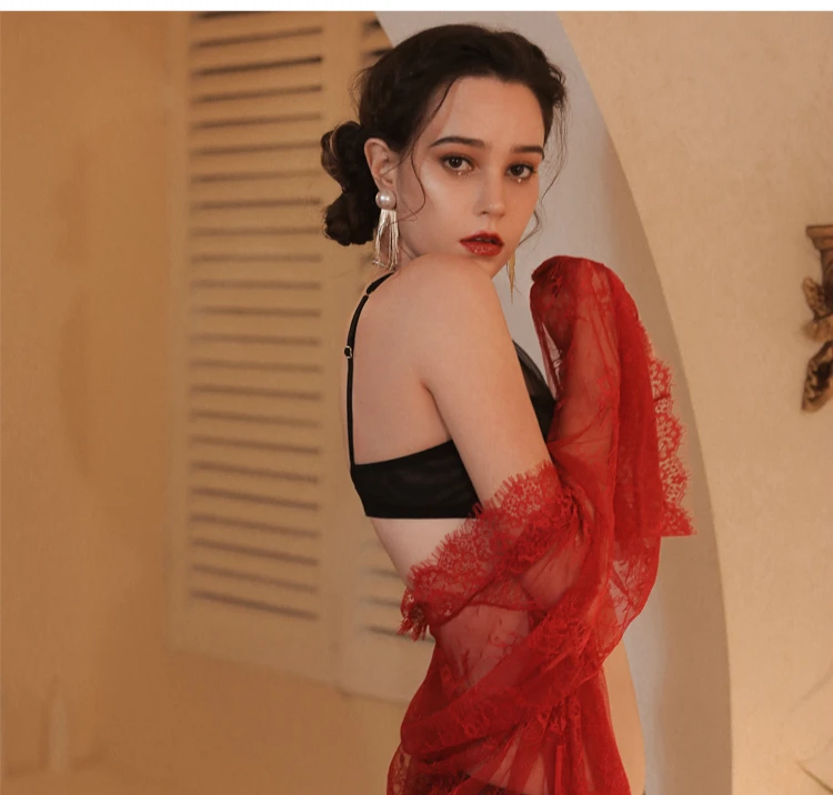 Sexy Pajamas Women's Lace Transparent Lace-up Kimono-Style Wide-Sleeve Eyelash Lace Robes Morning Gowns Summer Bathrobe