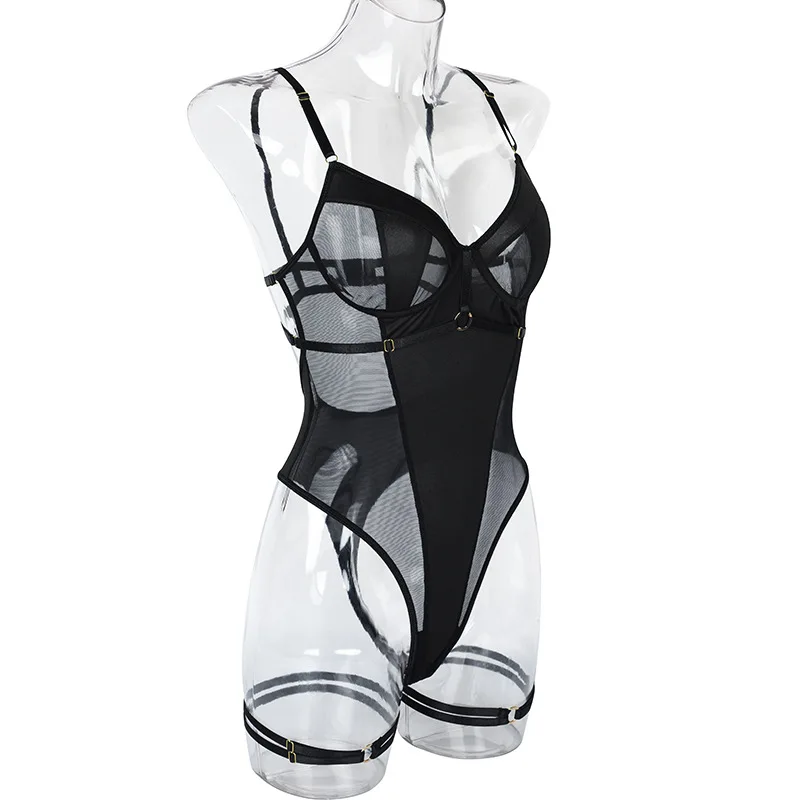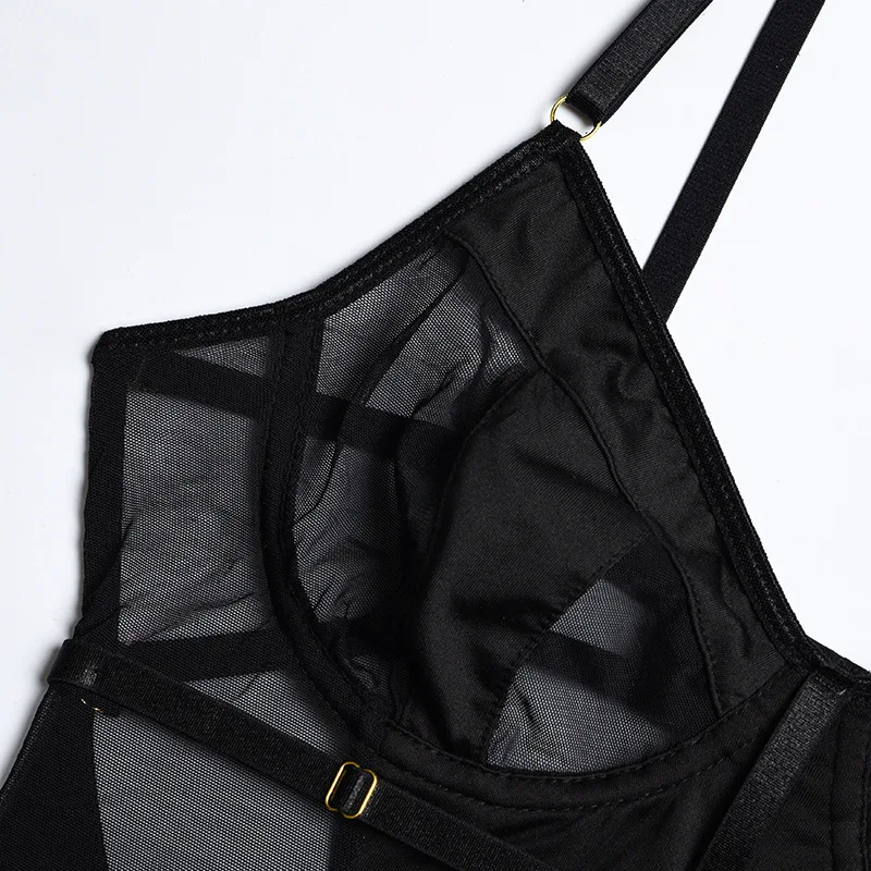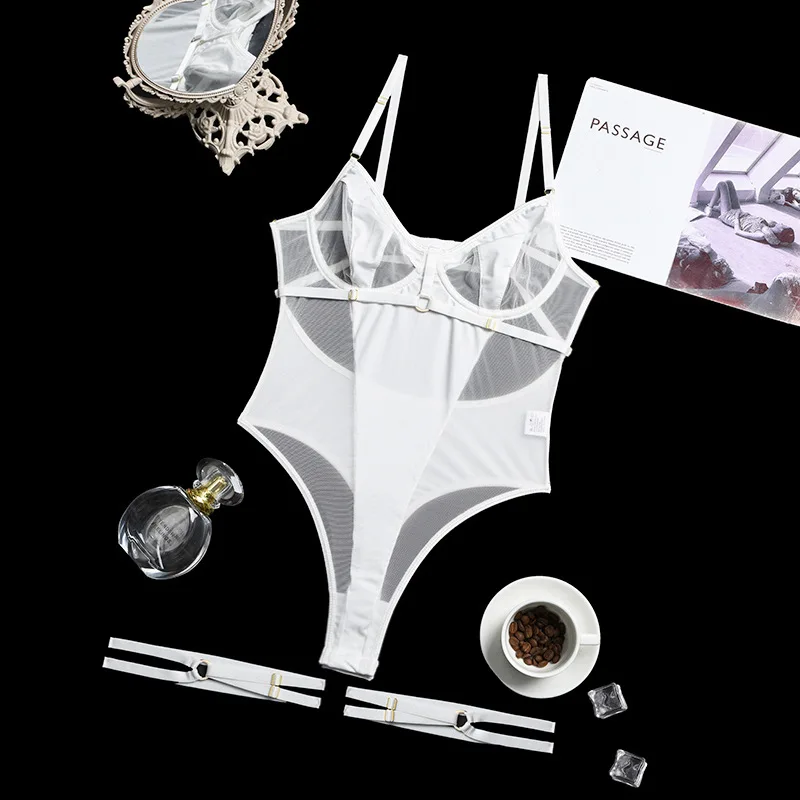 Sexy Sensual Lingerie Bodysuit Underwear Hollow Out Erotic BDSM Bondage Mesh Push Up Bra with Garters Erotic Costumes Outfits