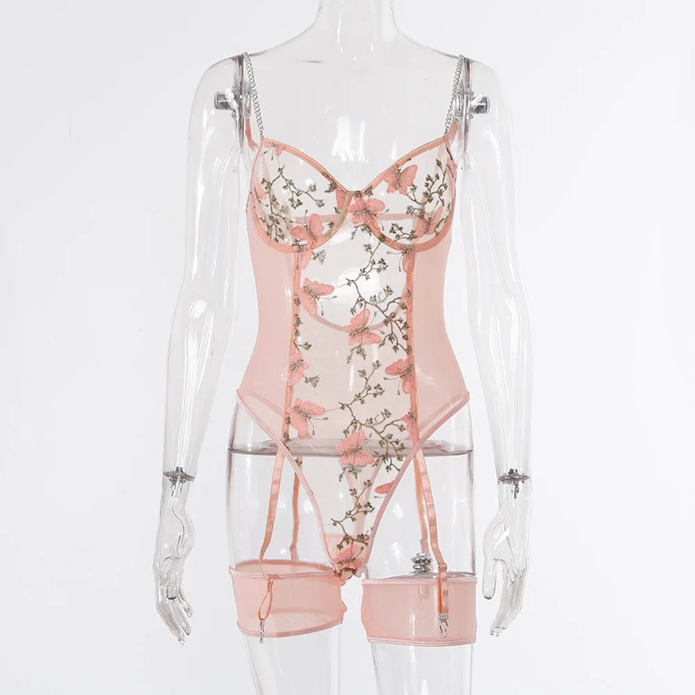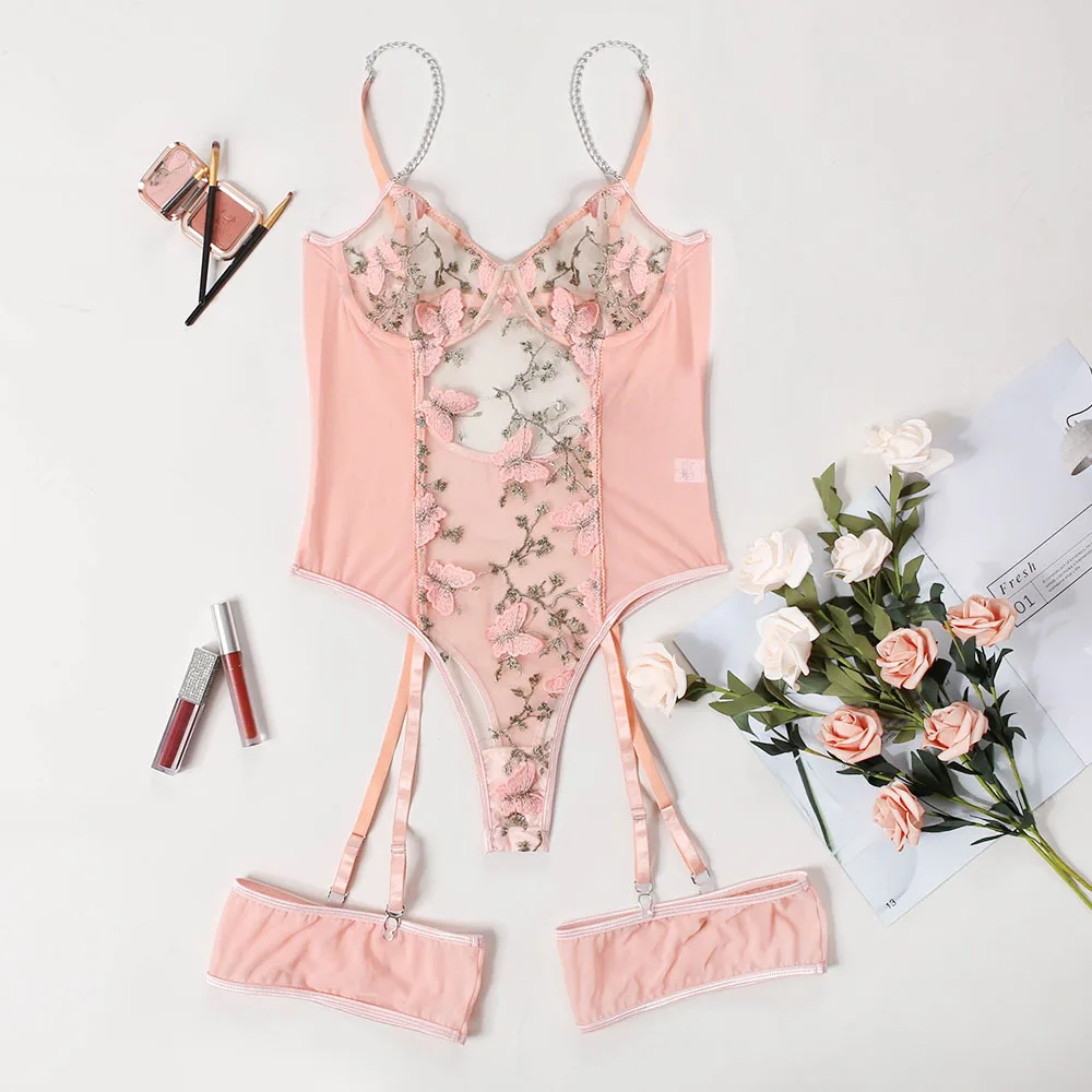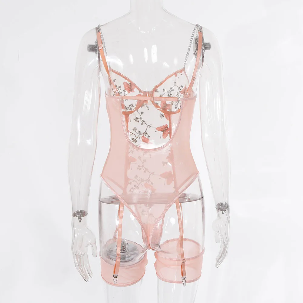 Sexy Sensual Lingerie Bodysuit Underwear Metal Chain Erotic Butterfly Embroidery Mesh Push Up Bra with Garters Erotic Costumes