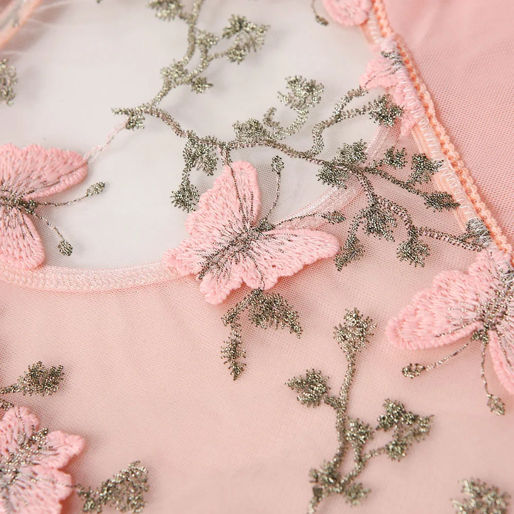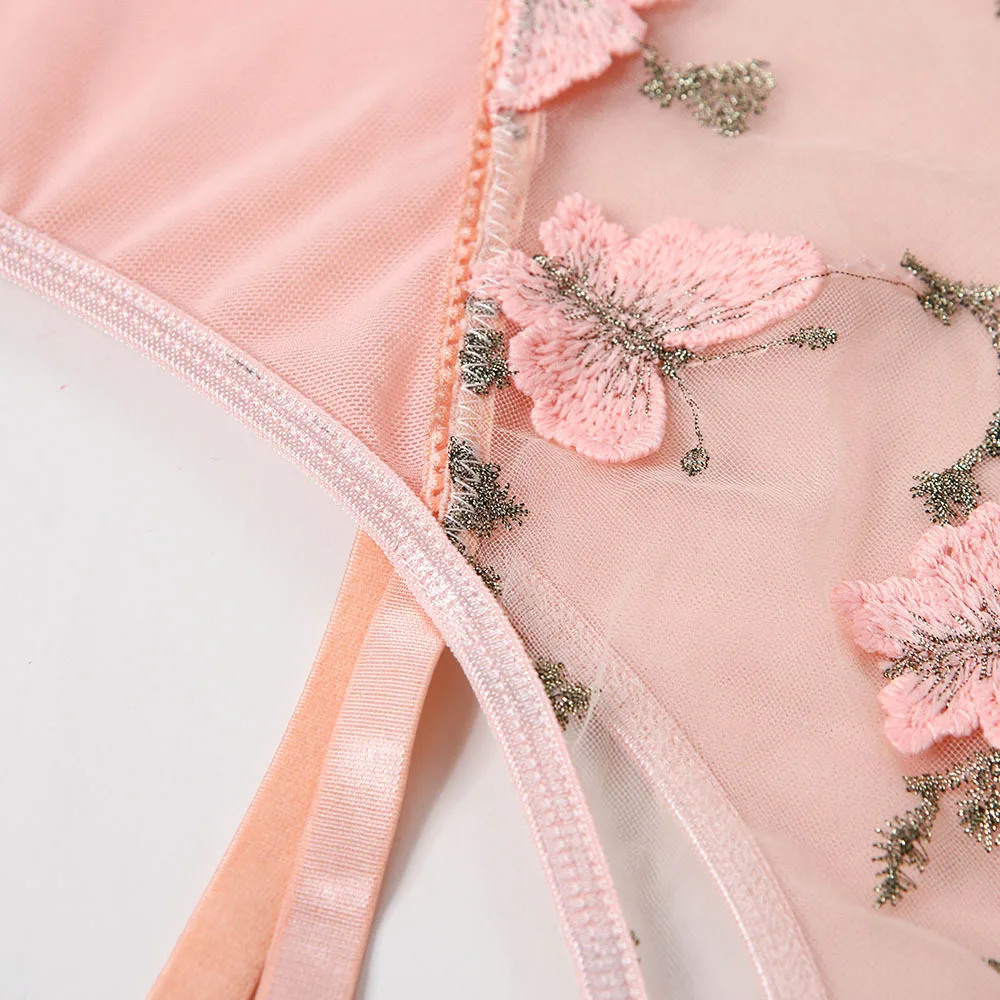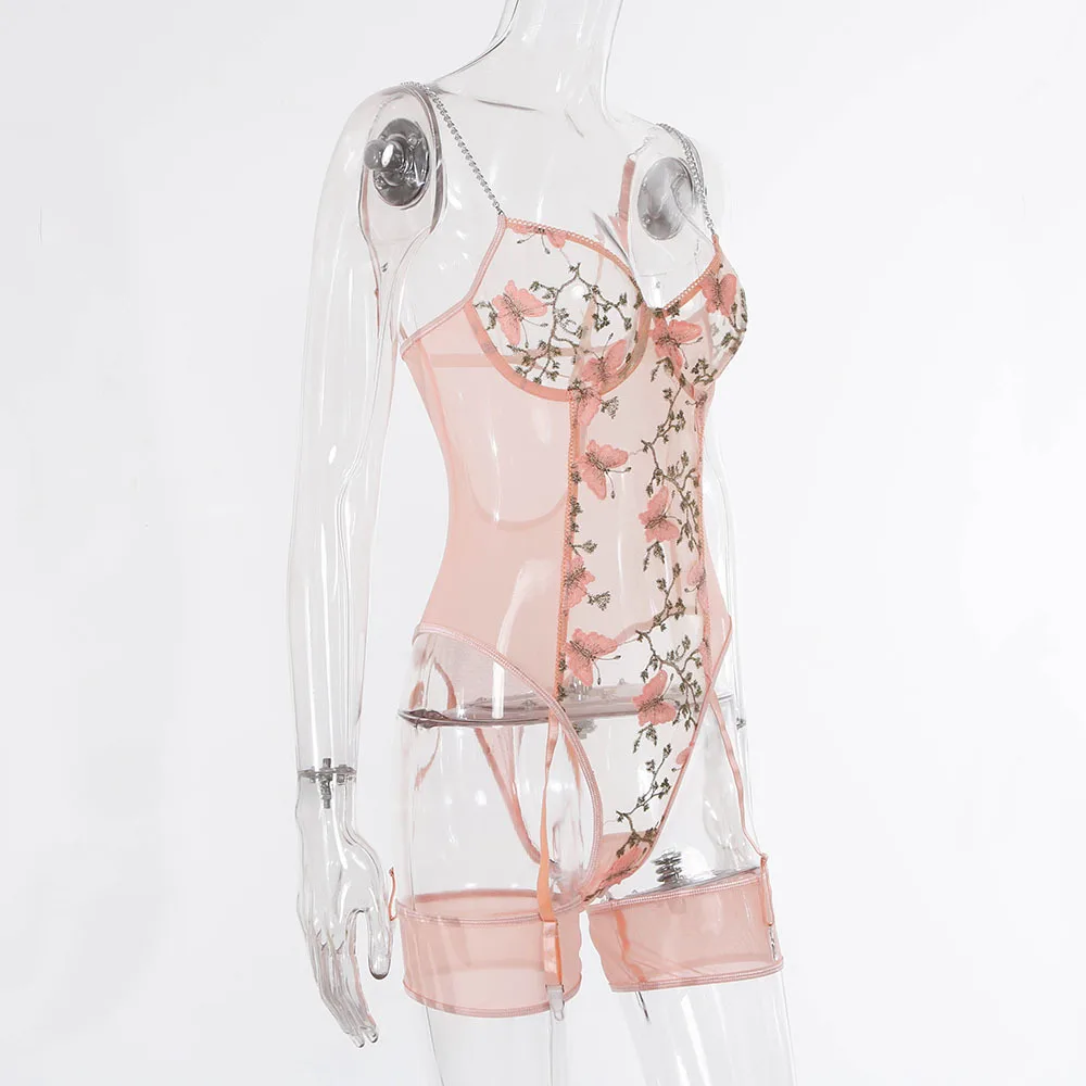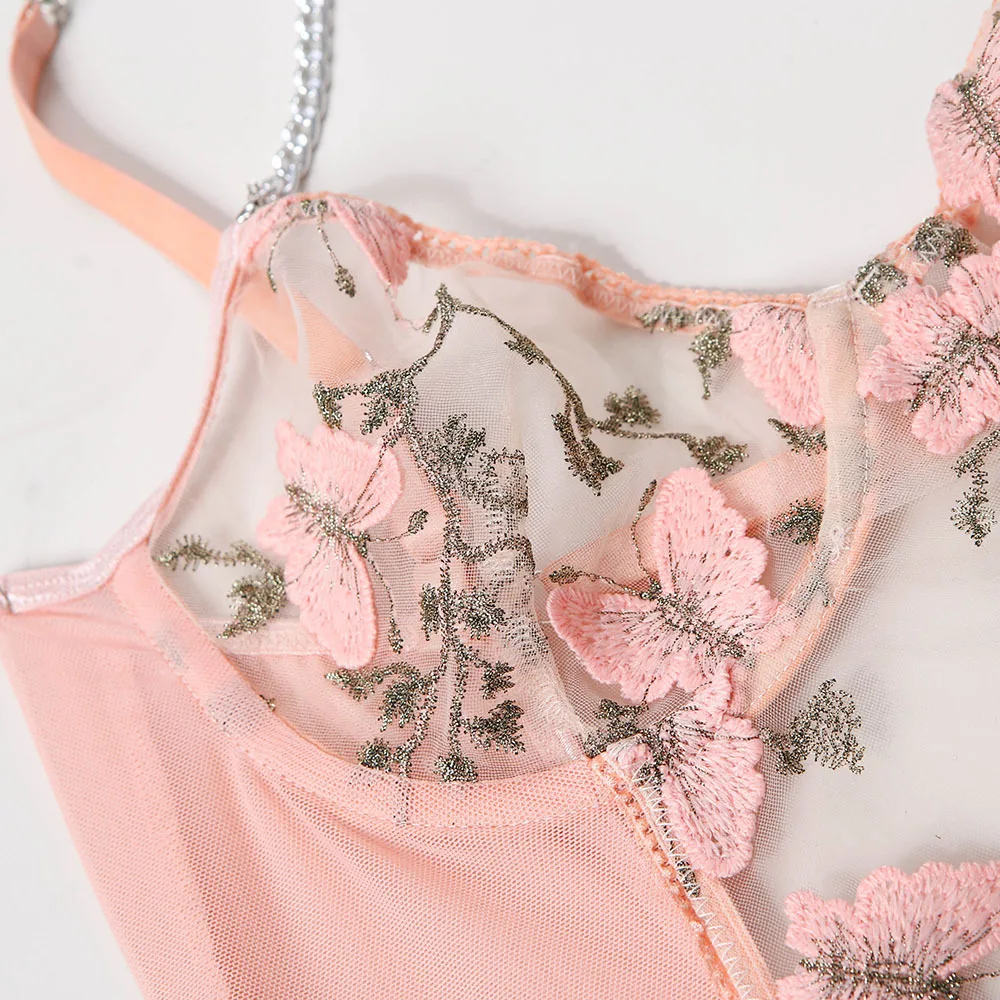 Sexy Sensual Lingerie Bodysuit Underwear Metal Chain Erotic Butterfly Embroidery Mesh Push Up Bra with Garters Erotic Costumes