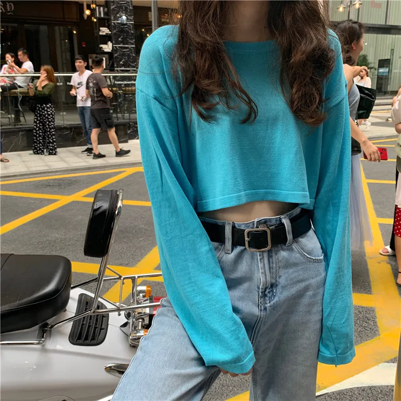 Chic Sexy High Waist Solid Long Sleeve Woman Short Tshirts 2021 Spring Midriff O-Neck Crop Top Simple All-match Femme Tee