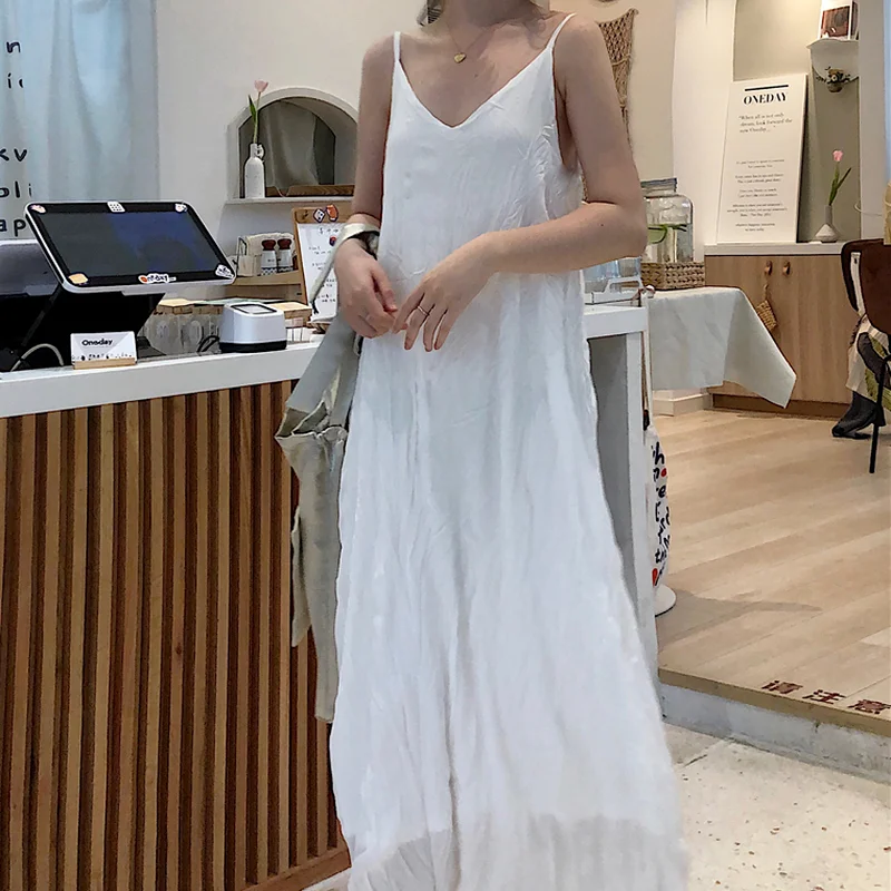 Korean Elegant White Inner Slip Dress Sweet Solid Folds Long Spaghetti Strap Dress 2021 New All-match Fairy Vestidos Mujer