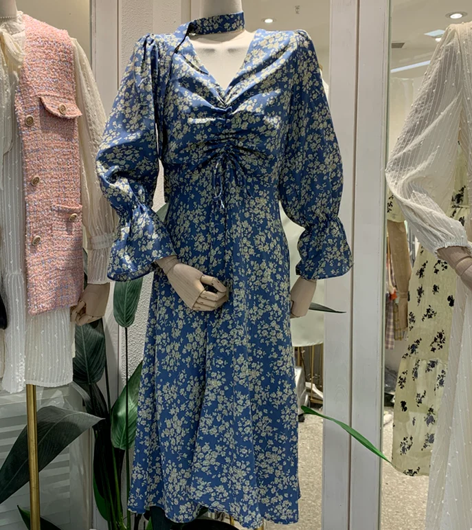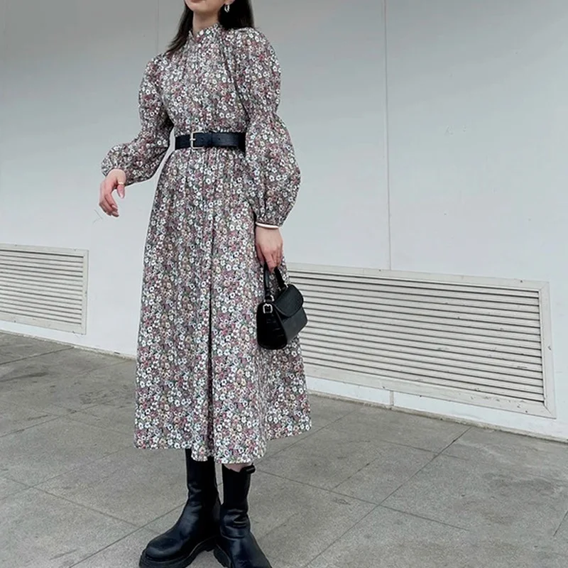 Vintage Floral Print Puff Sleeve Woman Dress Korean Fashion Shirring Design Long Sleeve Dresses Spring Elegant Vestidos Mujer