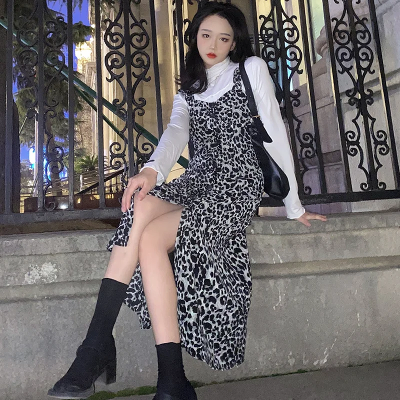 Korean Fashion Leopard Slip Dress Chic Side Split Mid Length Spaghetti Strap Dresses 2021 Spring High Waist Vestido Mujer