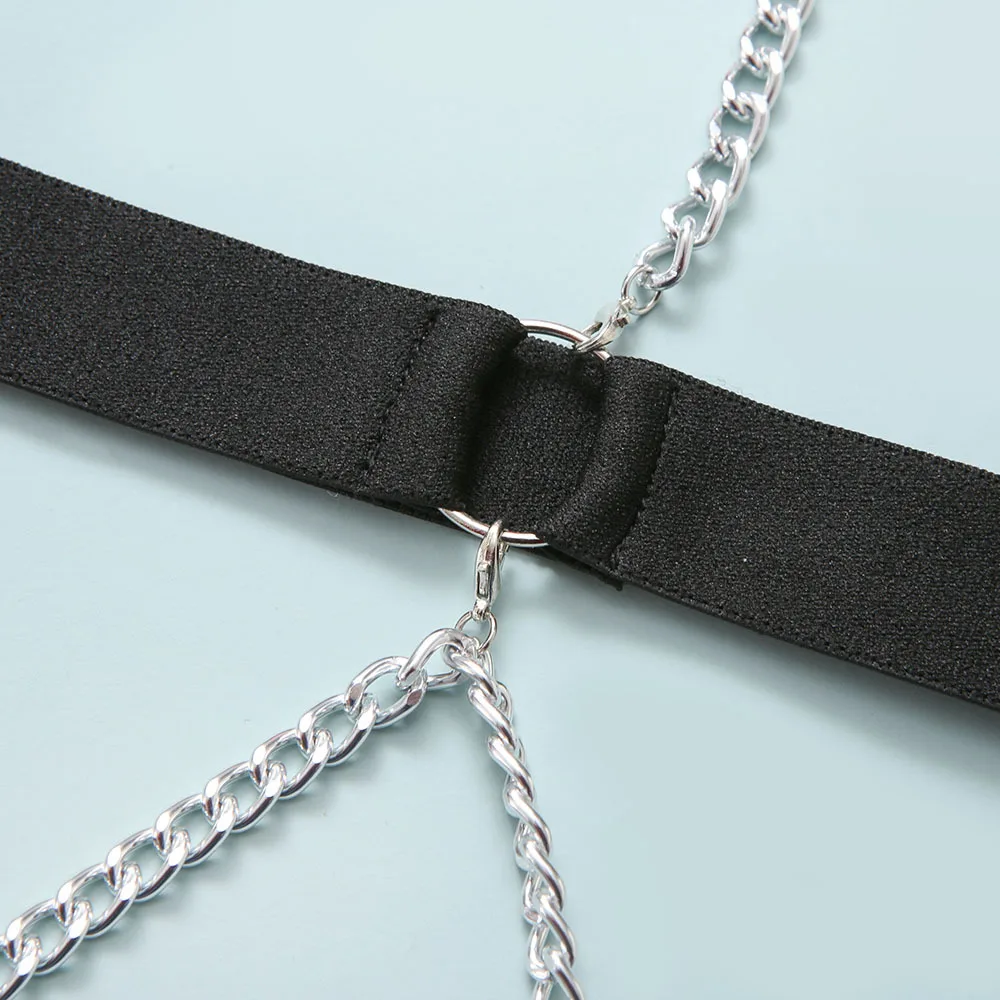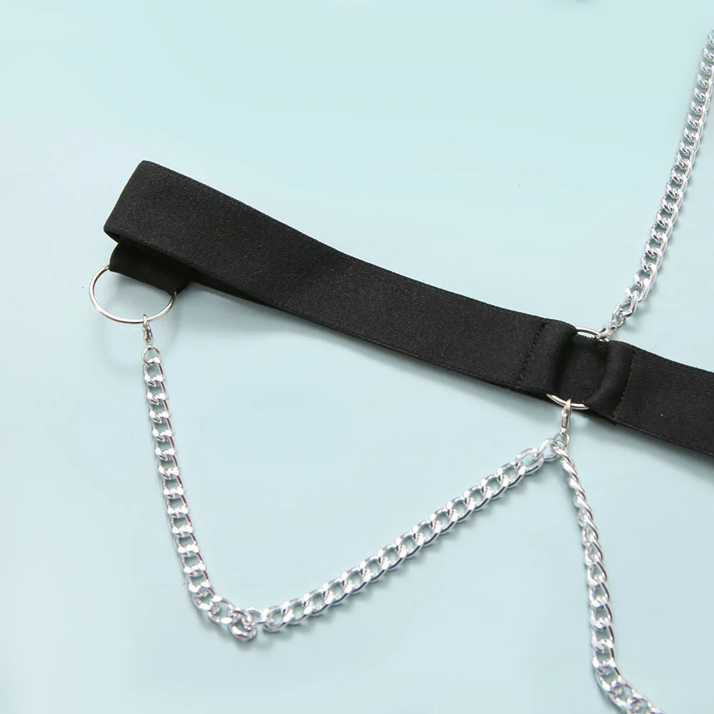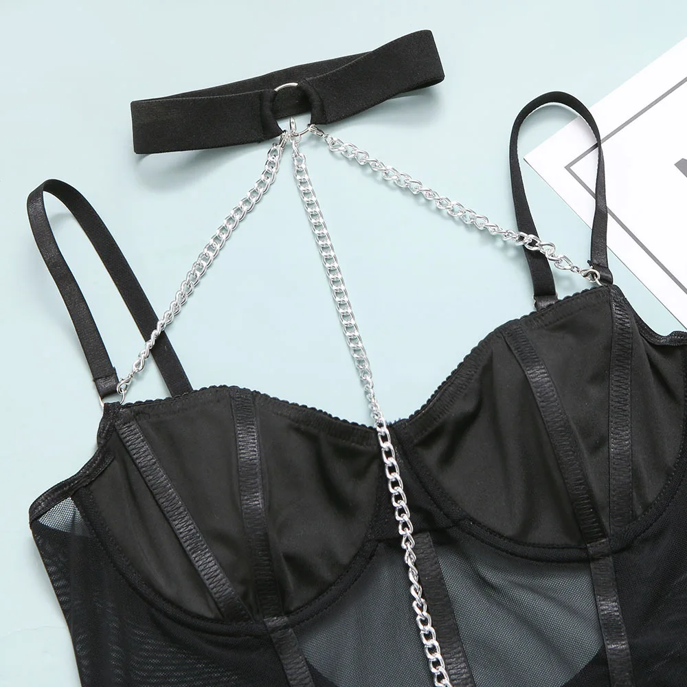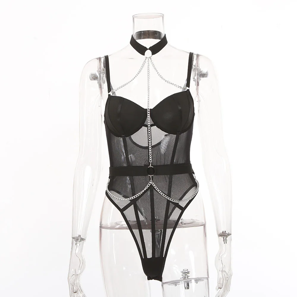 Summer Sexy Sensual Lingerie Metal Chain Bodysuit Underwear Erotic Hollow Out Halter Mesh Push Up Bra Jumpsuit Erotic Costumes