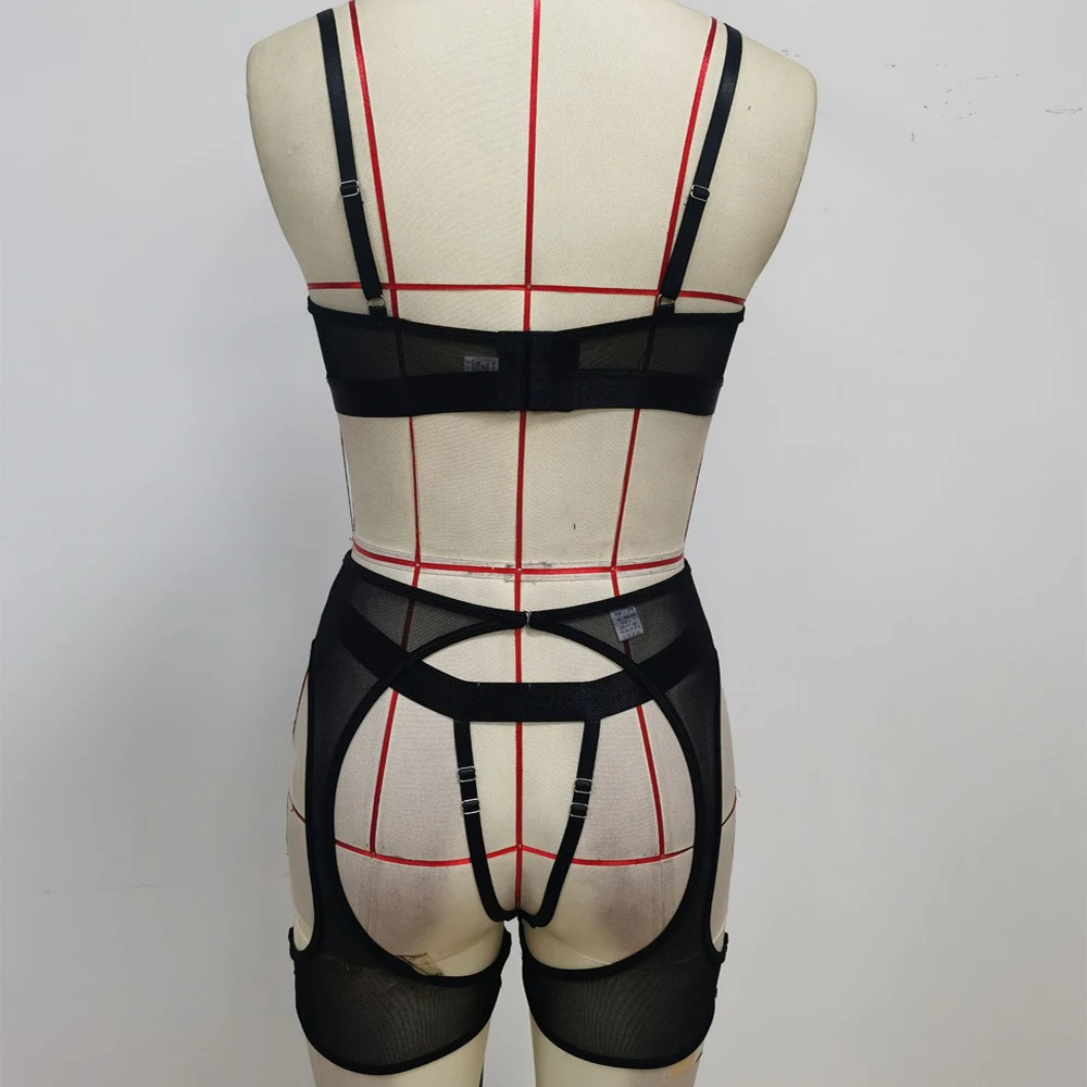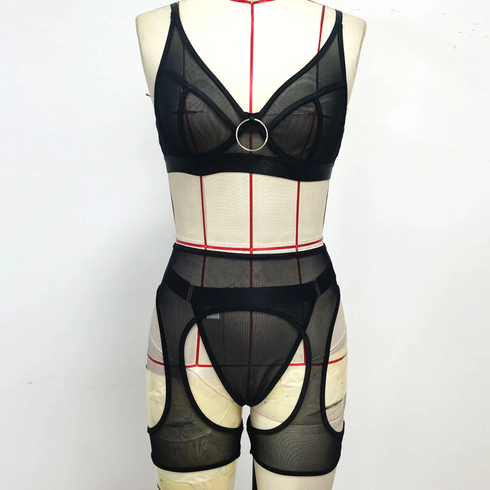 Summer Women Sexy Mesh Lingerie Set Garter Lace Bra Hollow Out Bras Sex Thong Transparent Straps Temptation Erotic Underwear Set
