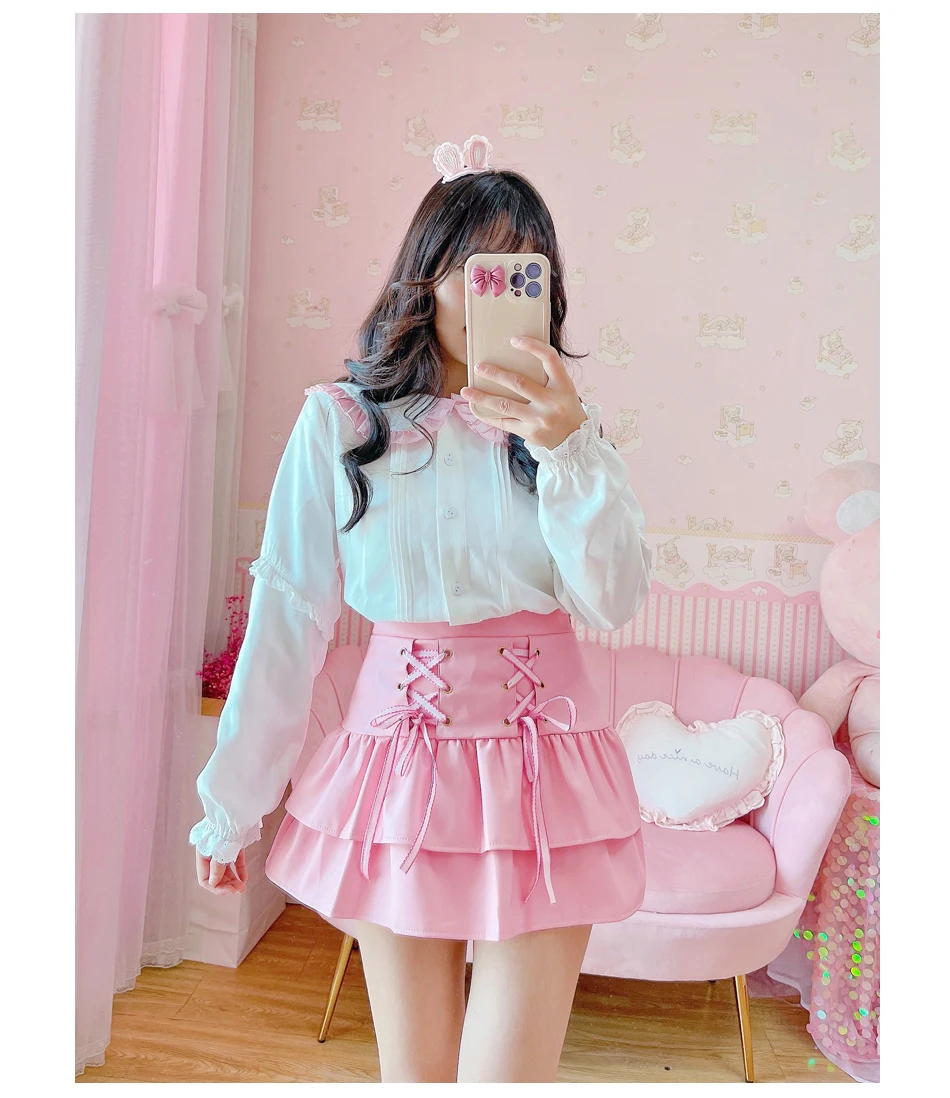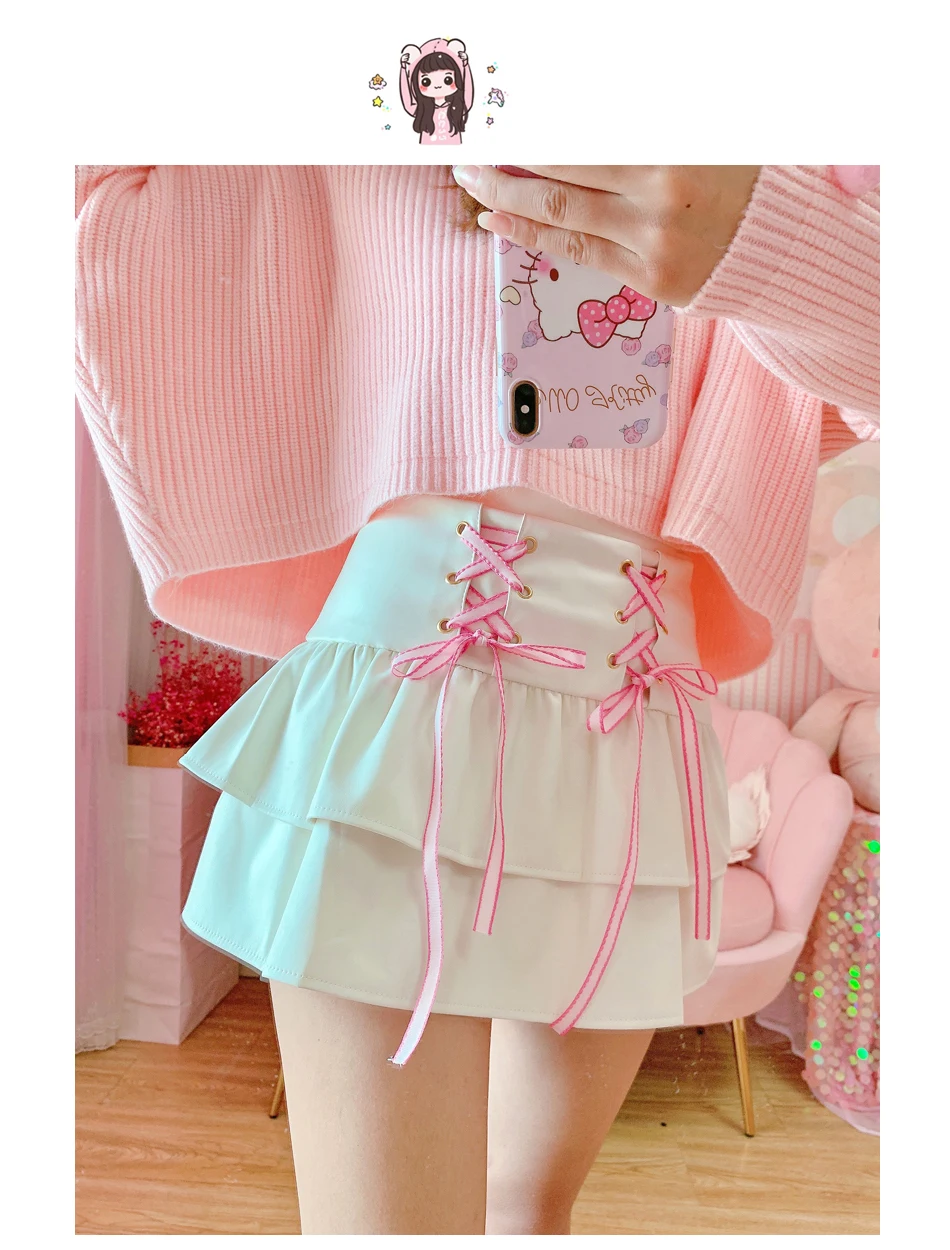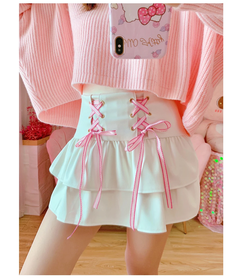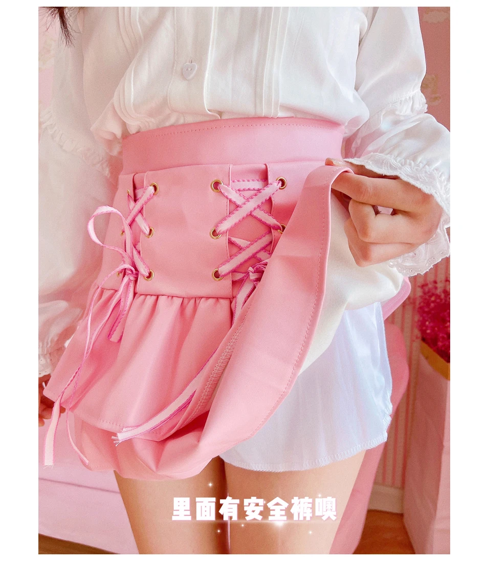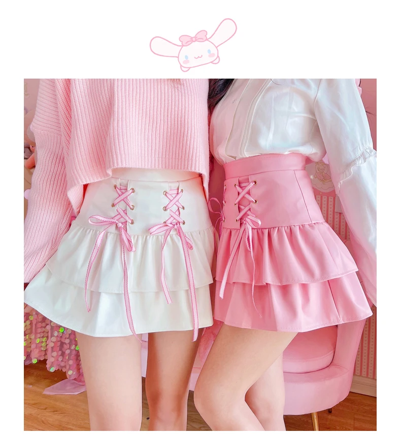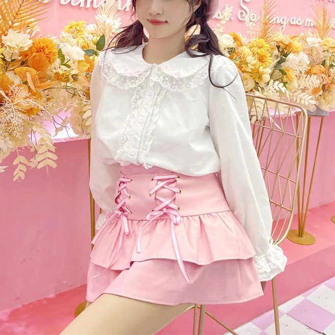 Sweet Cute Pink PU Skirts Spring Mori Girls High Waist Bandage Mini Skirts Kawaii Fashion Designed Japanese Flower Edge Jupe