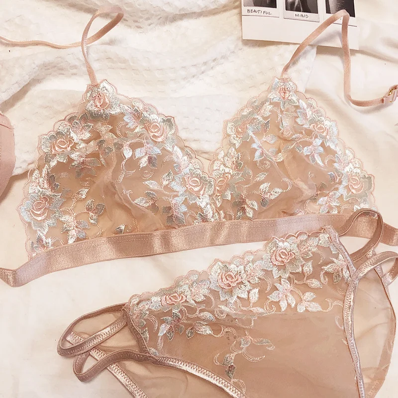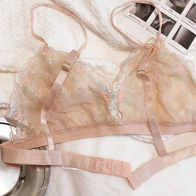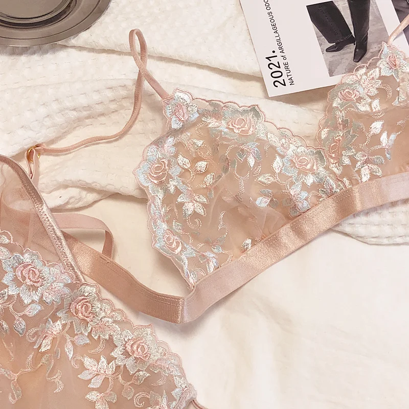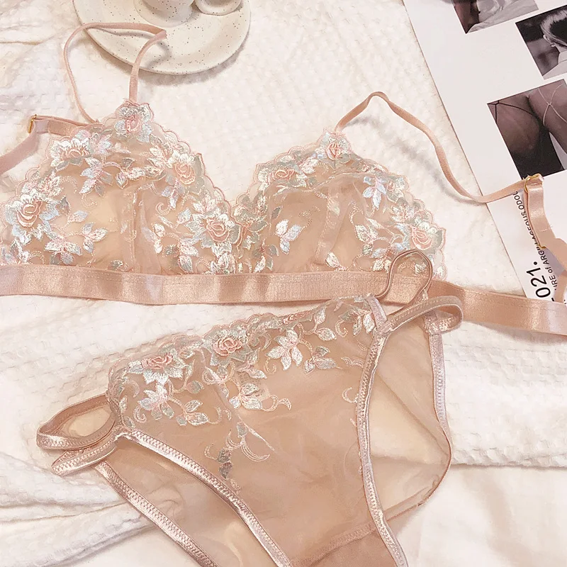 Ultra-thin Sexy Bra French Embroidery Lace Dream Triangle Cup Wireless Small Chest Underwear Set See Through Bra and Panty Set