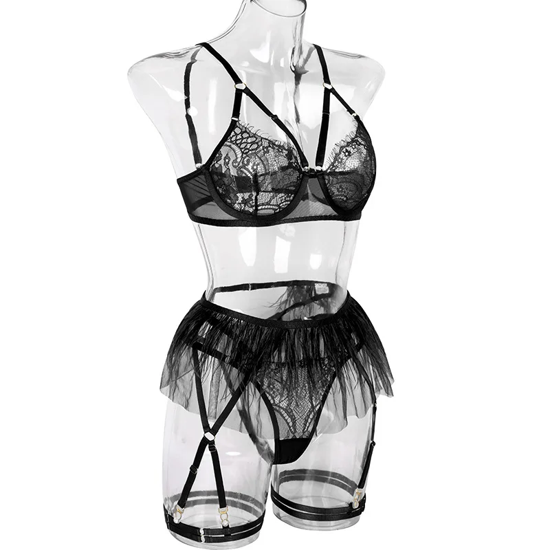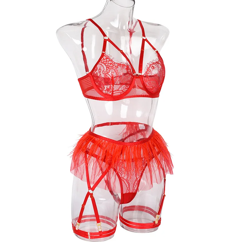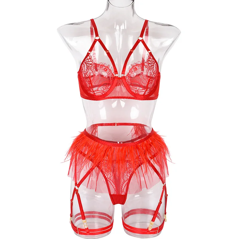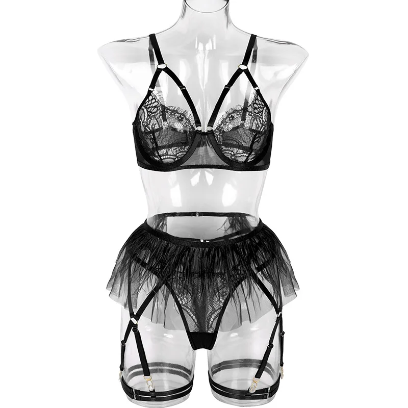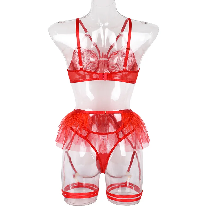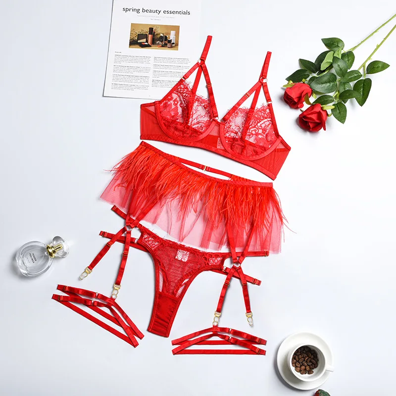Women Lace Patchwork Feather Embroidery Bra Lingerie Sexy G-String Set Exquisite Fetish Garter Gothic Babydoll Bondage Underwear