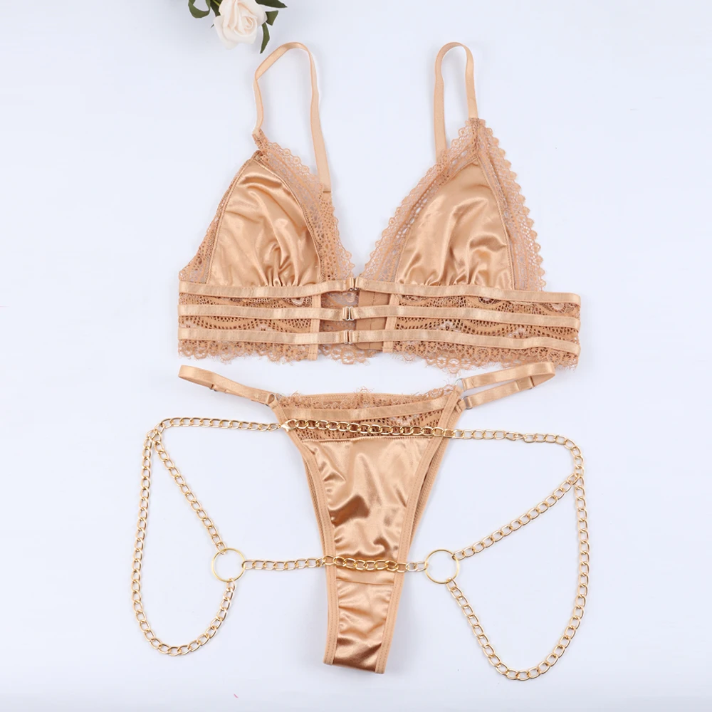 Women Luxury Sexy Lingerie Metal Chain Lace Underwear Sensual Bra and Briefs Set Garter Erotic See-Through Mesh Exotic Costumes