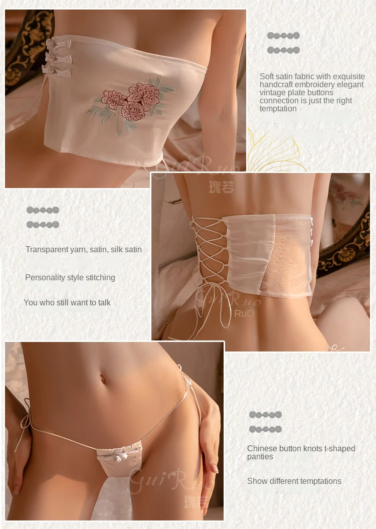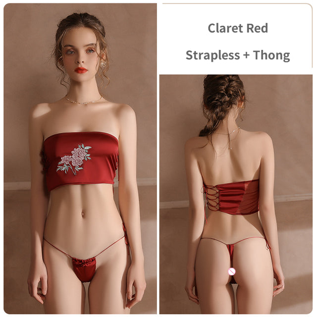 Women‘s’ Sexy Lingerie Set Original Satin Gauze Underwear Retro Embroidered Strapless Thong Two-Piece Set Erotic Nightwear