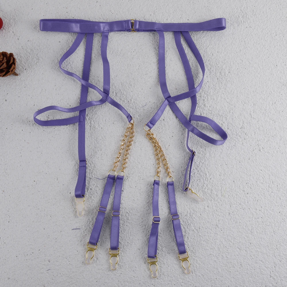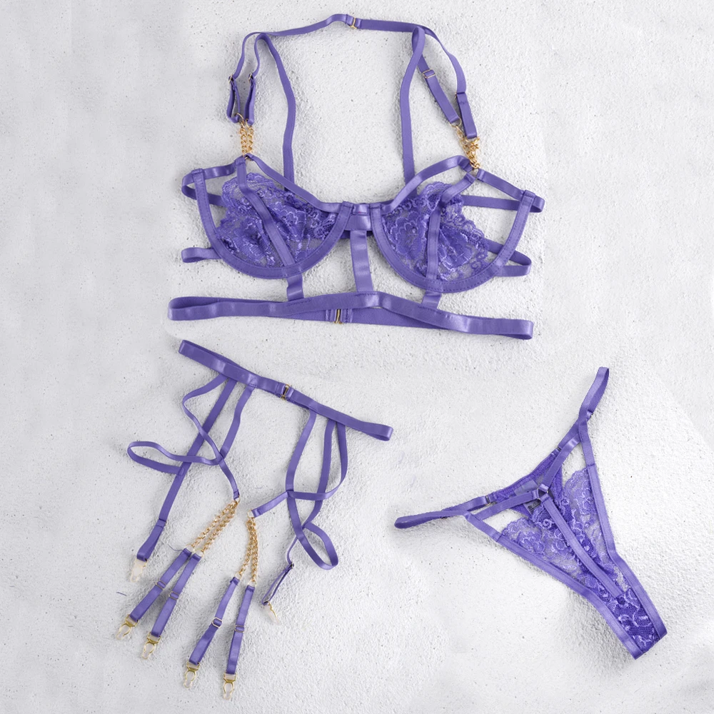 Women Sensual Lingerie Exotic Costumes Sexy Bottom Whore Hollow Out Halter Bra 3-Pieces Sissy Metal Chain Erotic Outfit