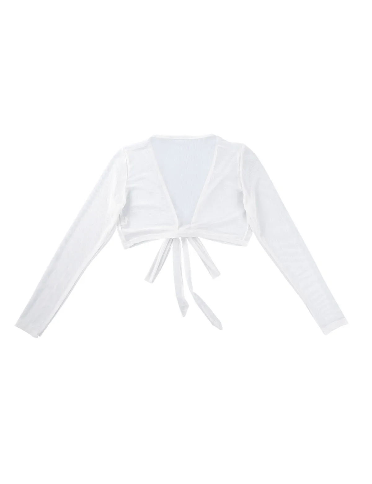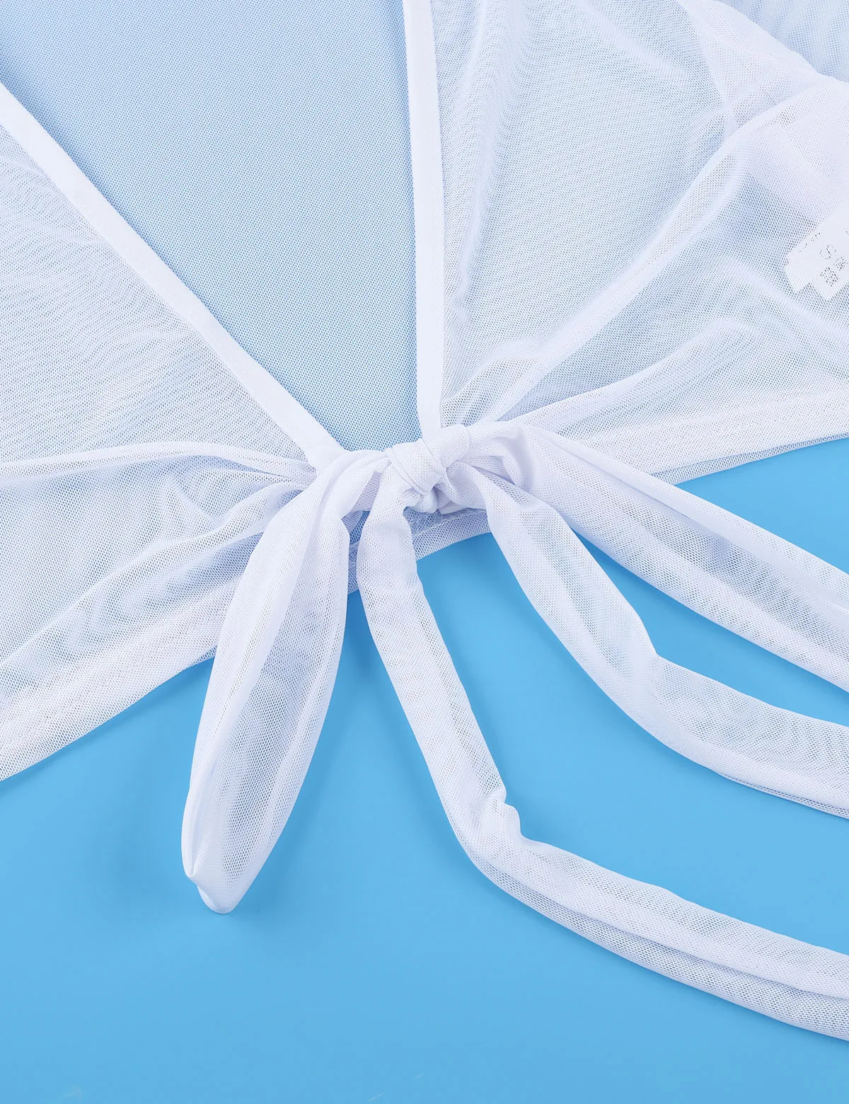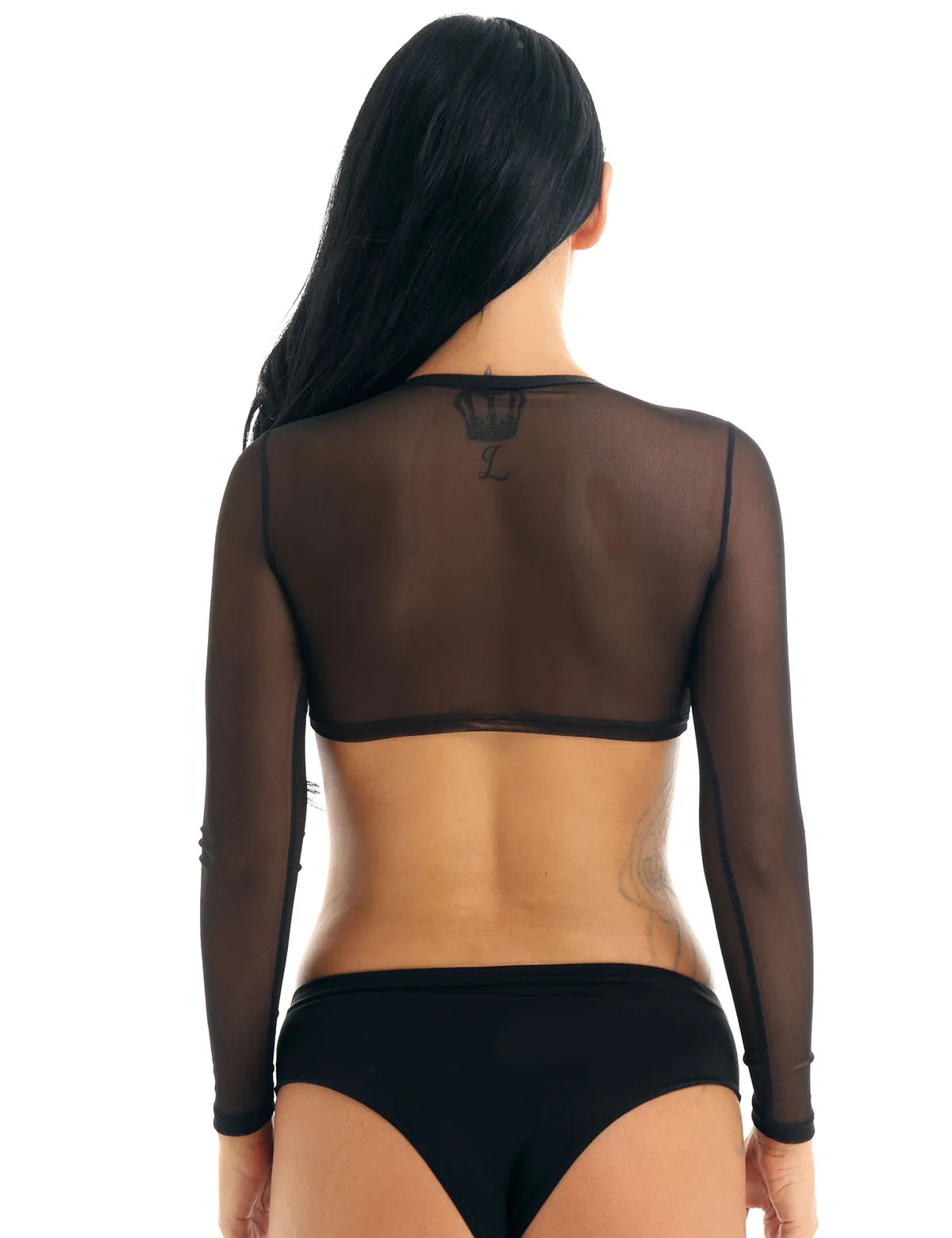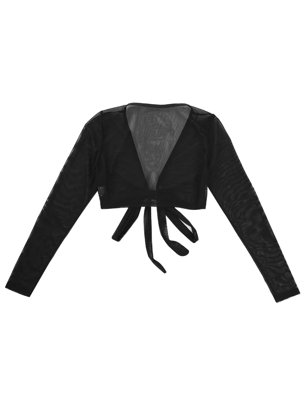 Deep V neck, long sleeves, mesh see through sheer design, solid color, front tie up closure.