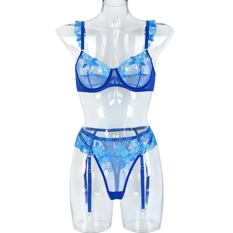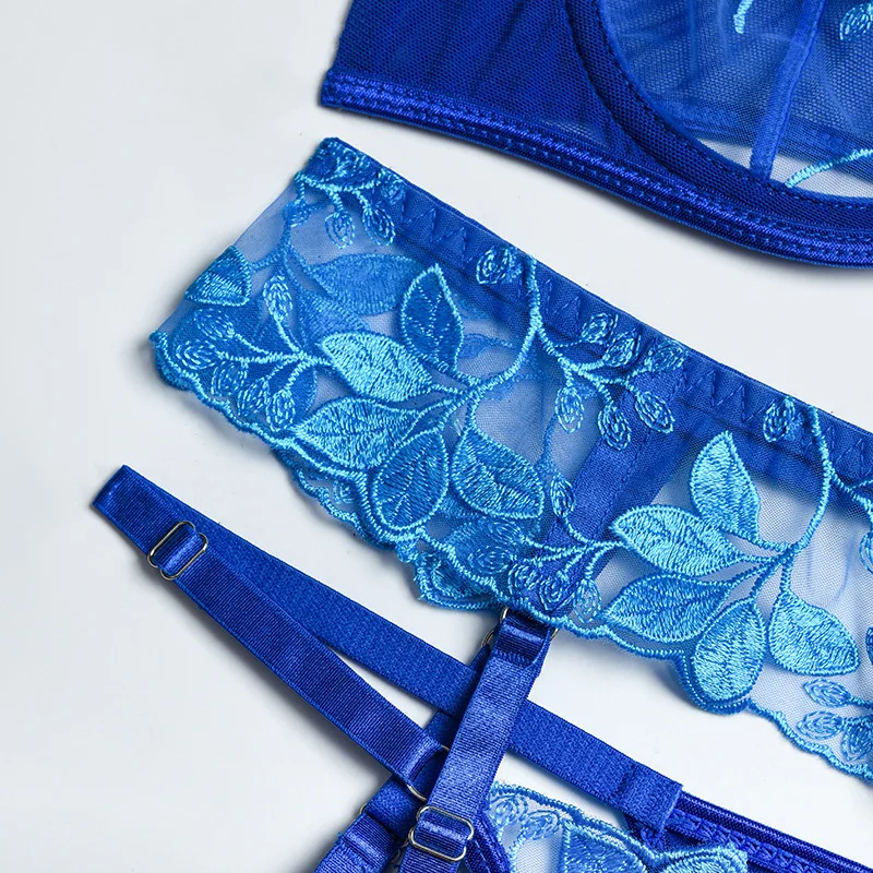 Women Sexy Floral Embroidery Underwear 3 Pieces Set Erotic Bra and Brief Set with Garters Sensual Lingerie Lace Female Suit