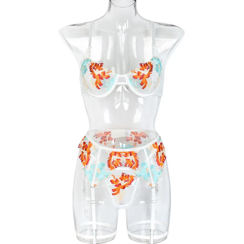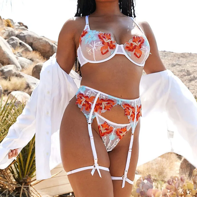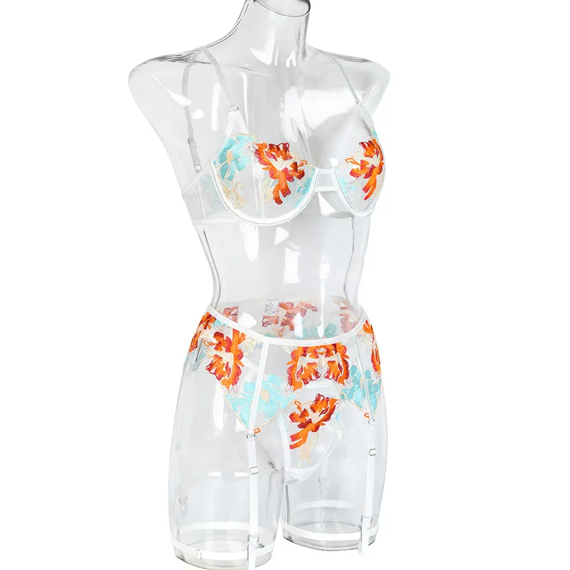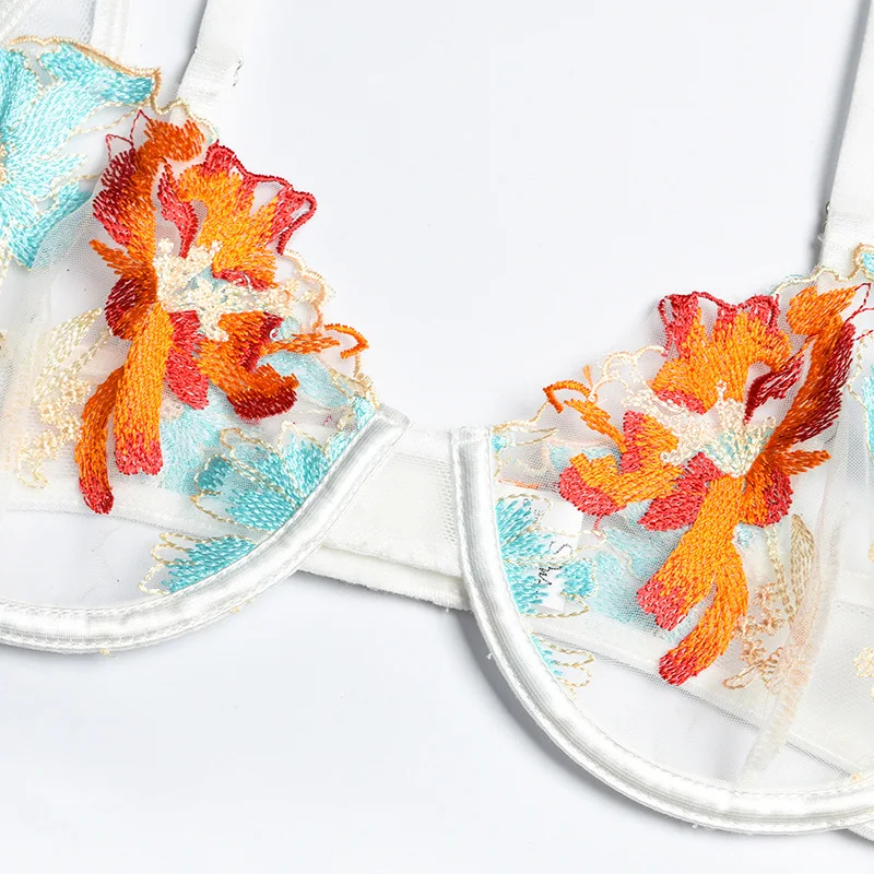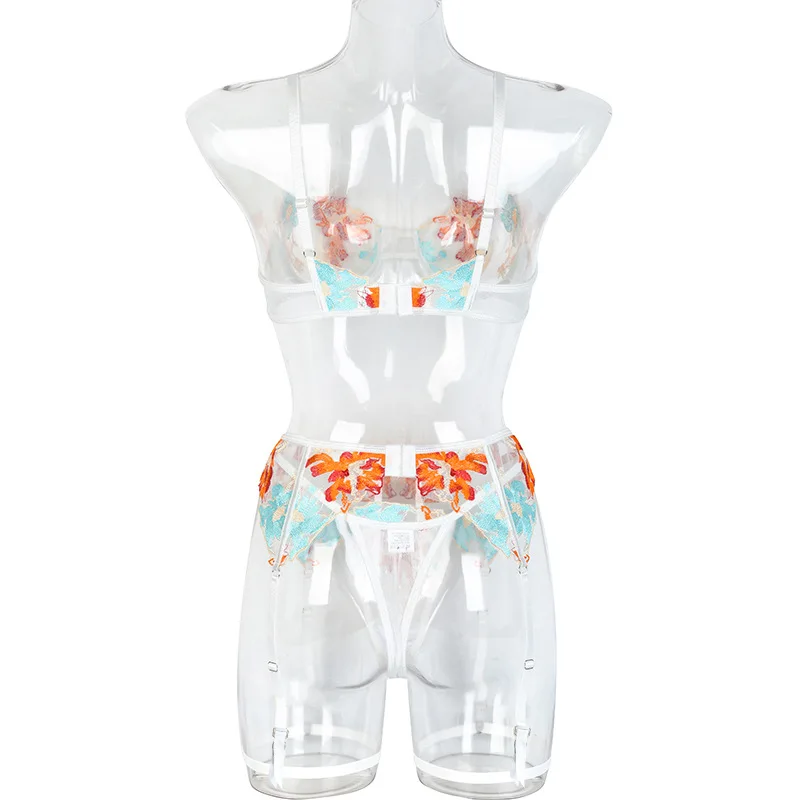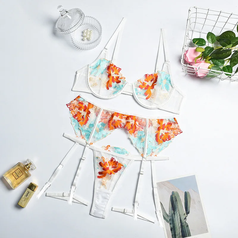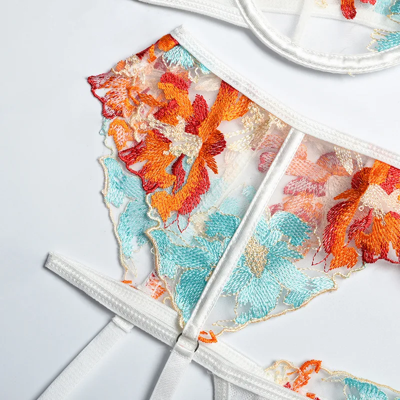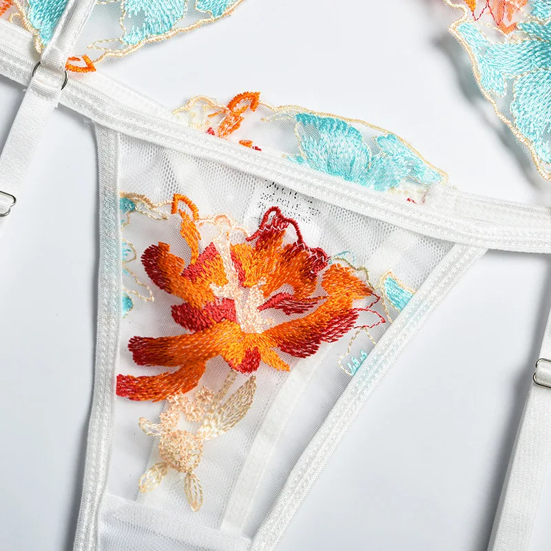 Women Sexy Floral Embroidery Underwear 4 Pieces Set Erotic Bra and Brief Set with Leg Garters Sensual Lingerie Lace Female Set