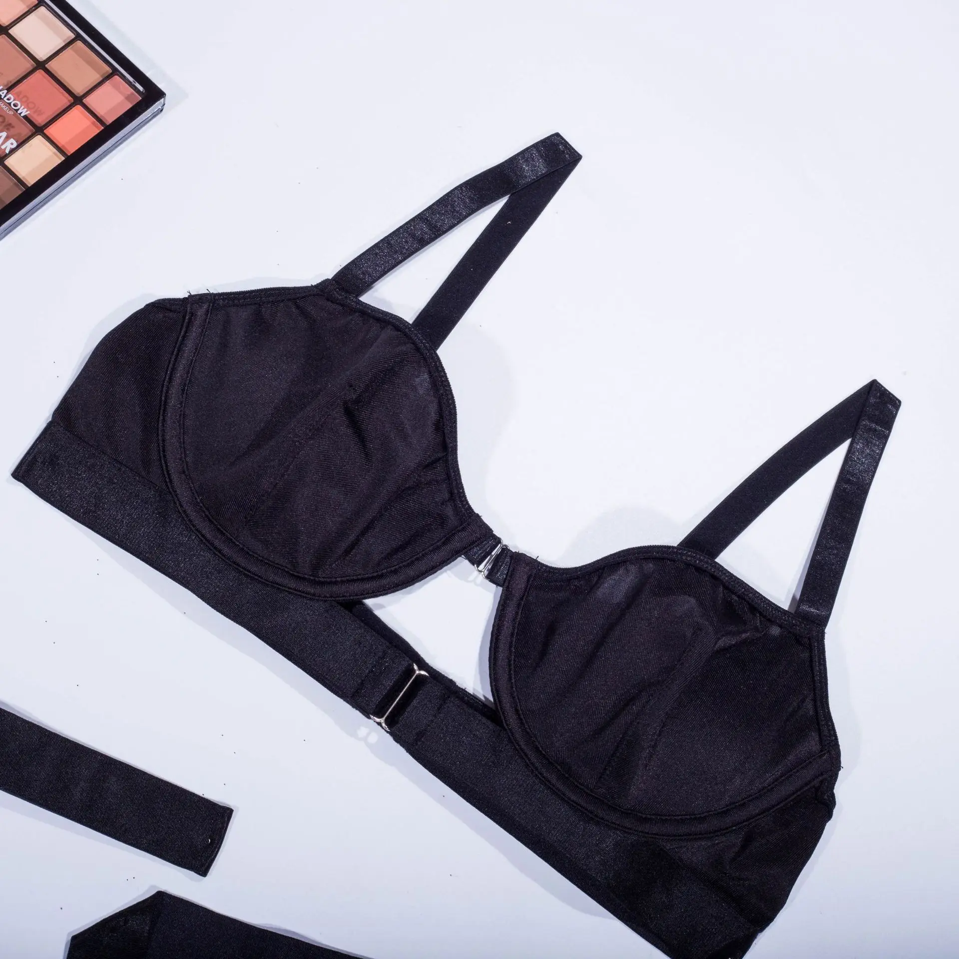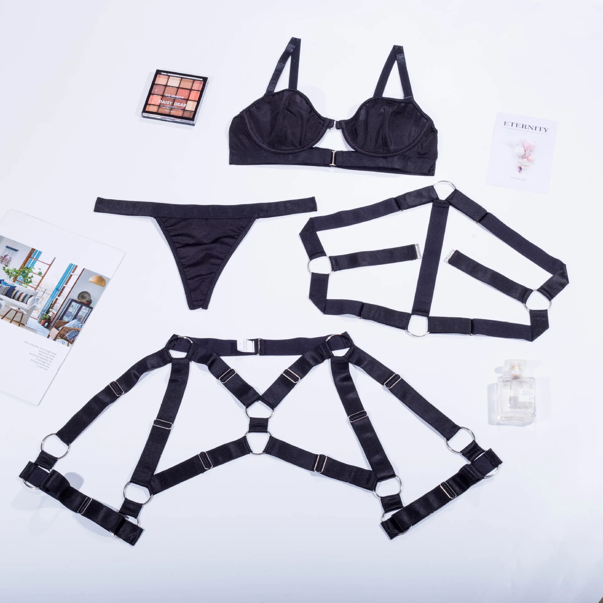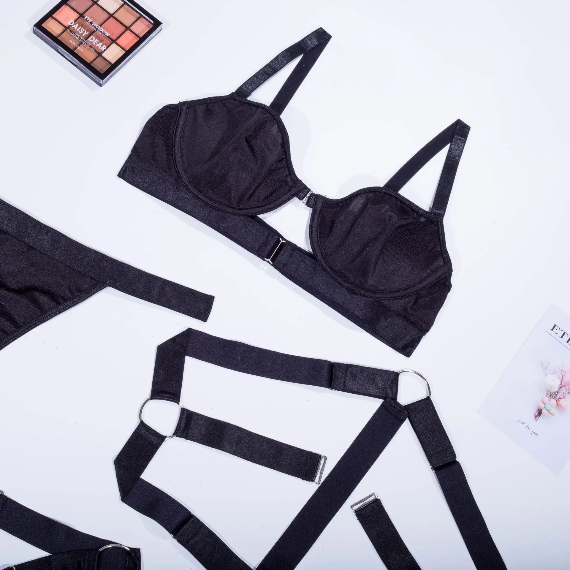 Women Sexy Lingerie 4 Pieces Set with Garters Bra and Briefs Hollow Out Transparent Erotic Costumes Sensual Underwear Outfits