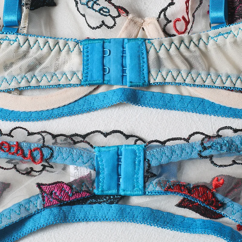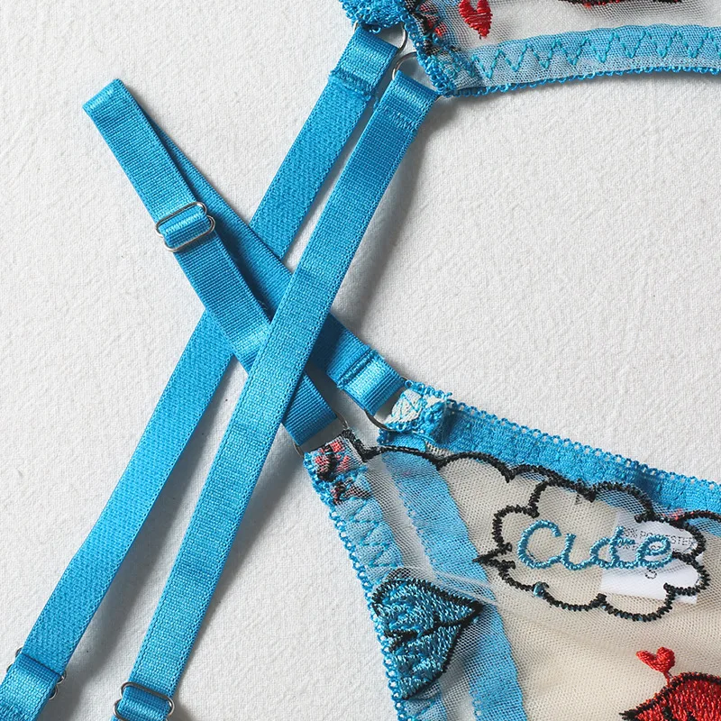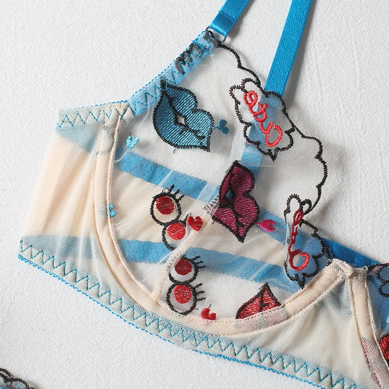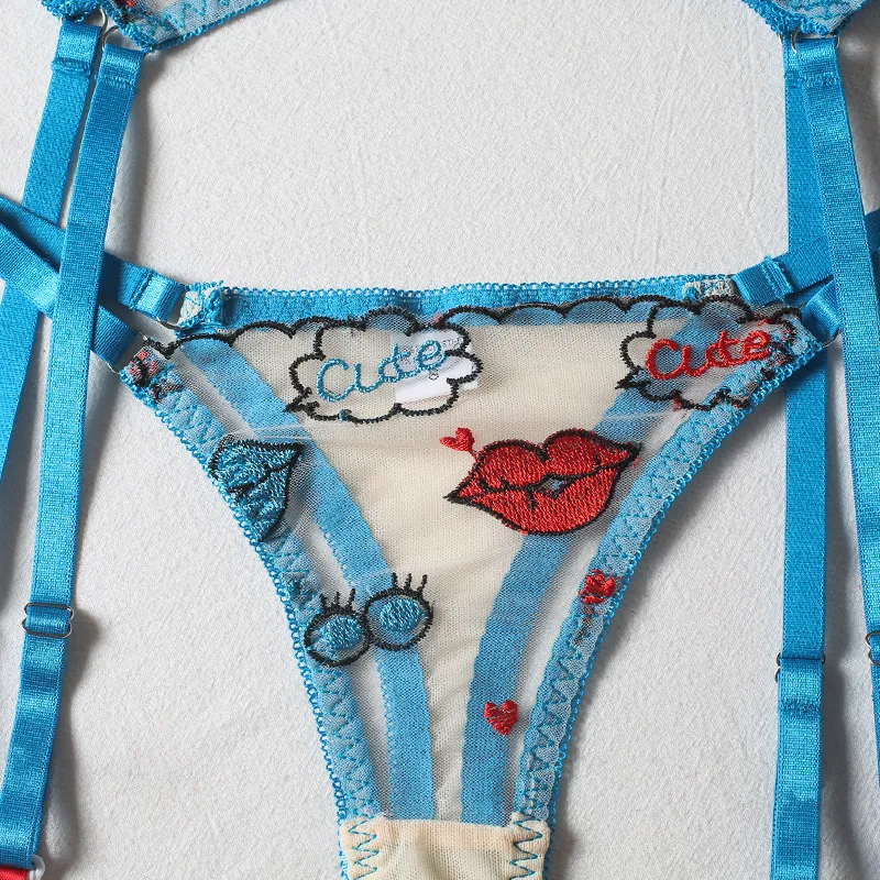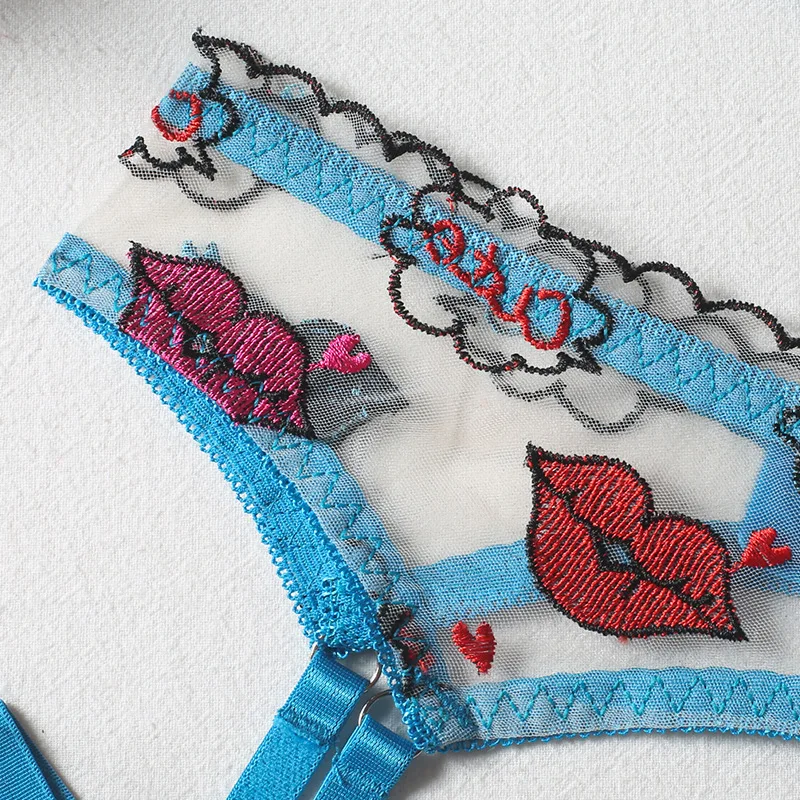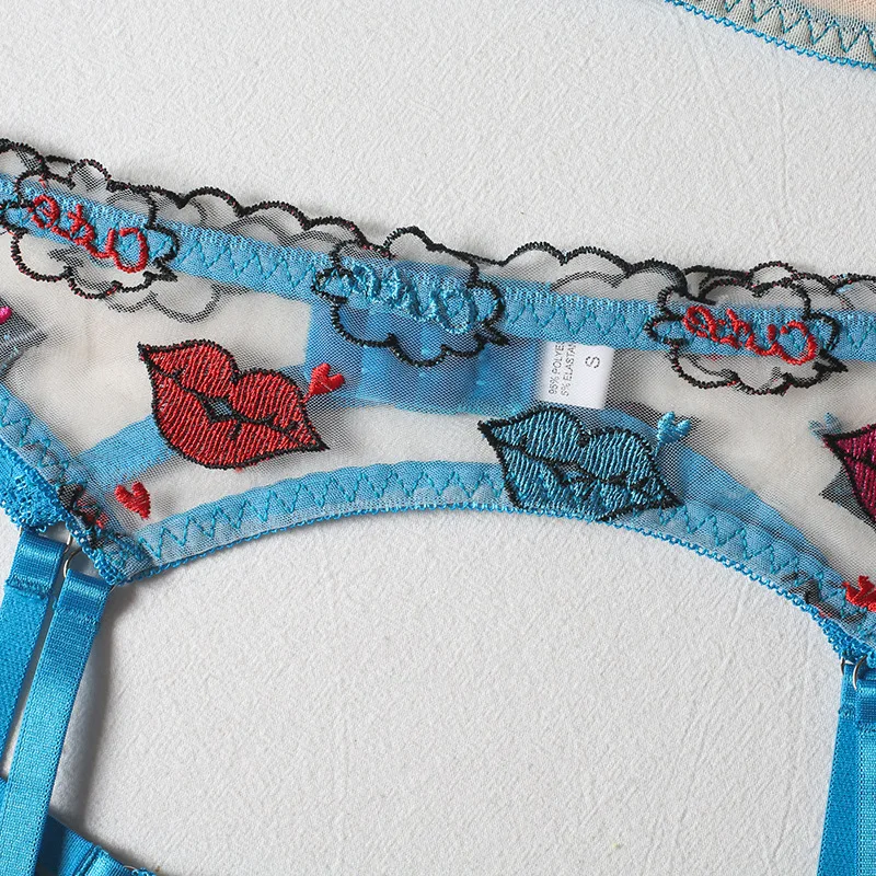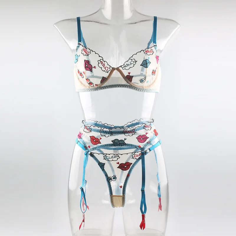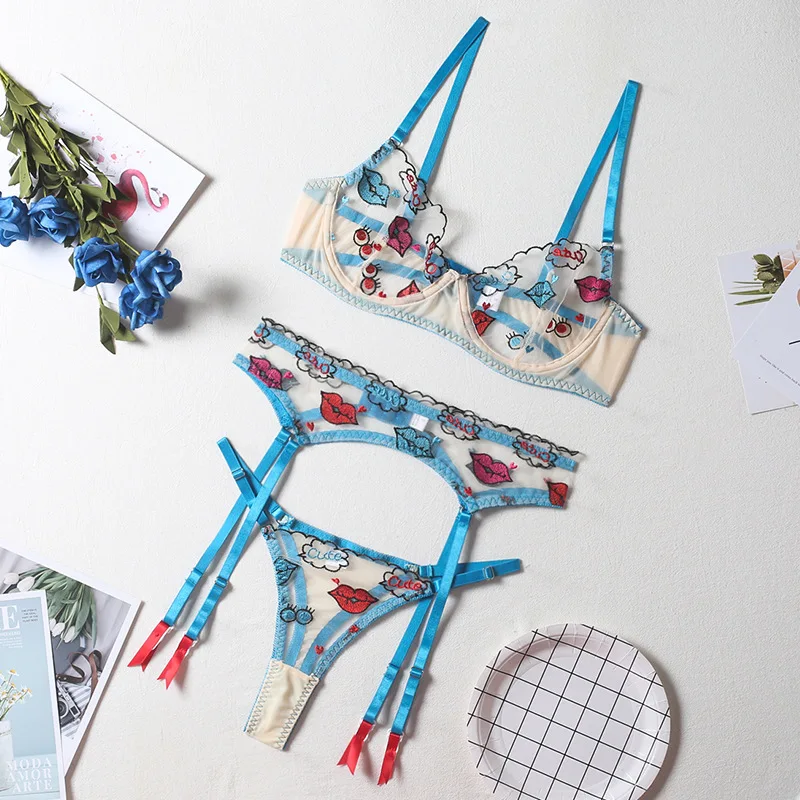 Women Sexy Lingerie Lips Embroidery Underwear 3 Pieces Set Erotic Bra Set Garters Sensual Lingerie Transparent Sex Underwear