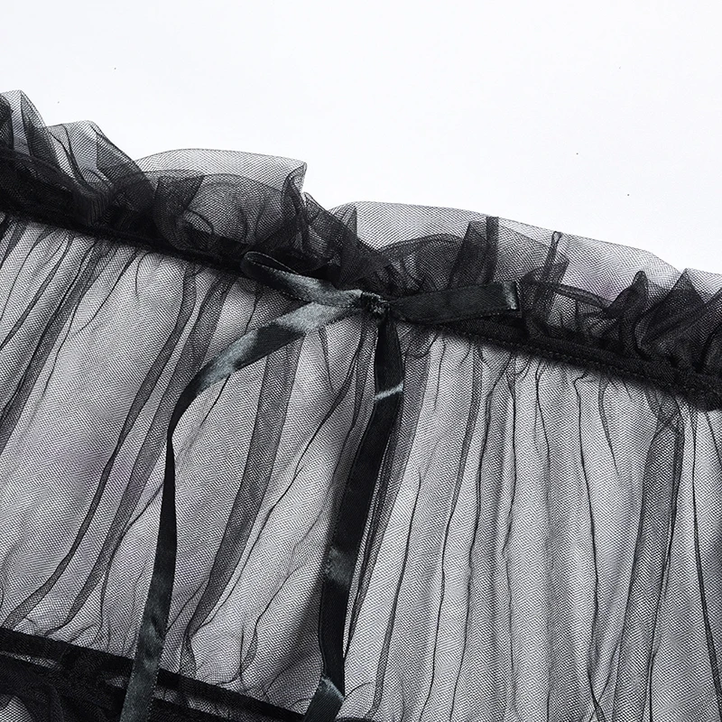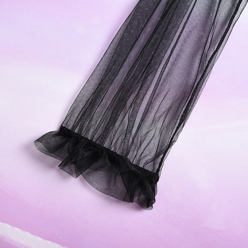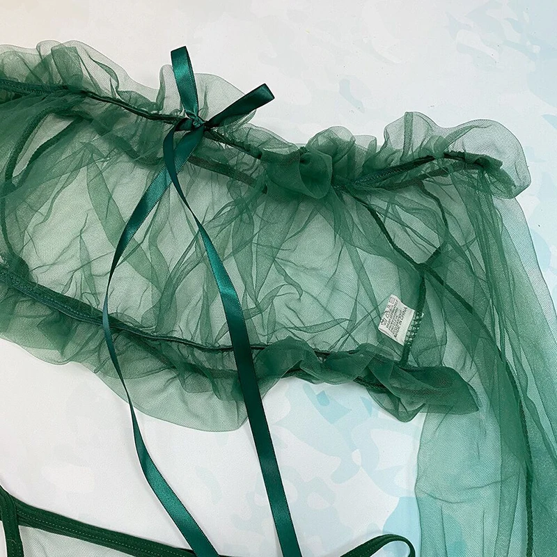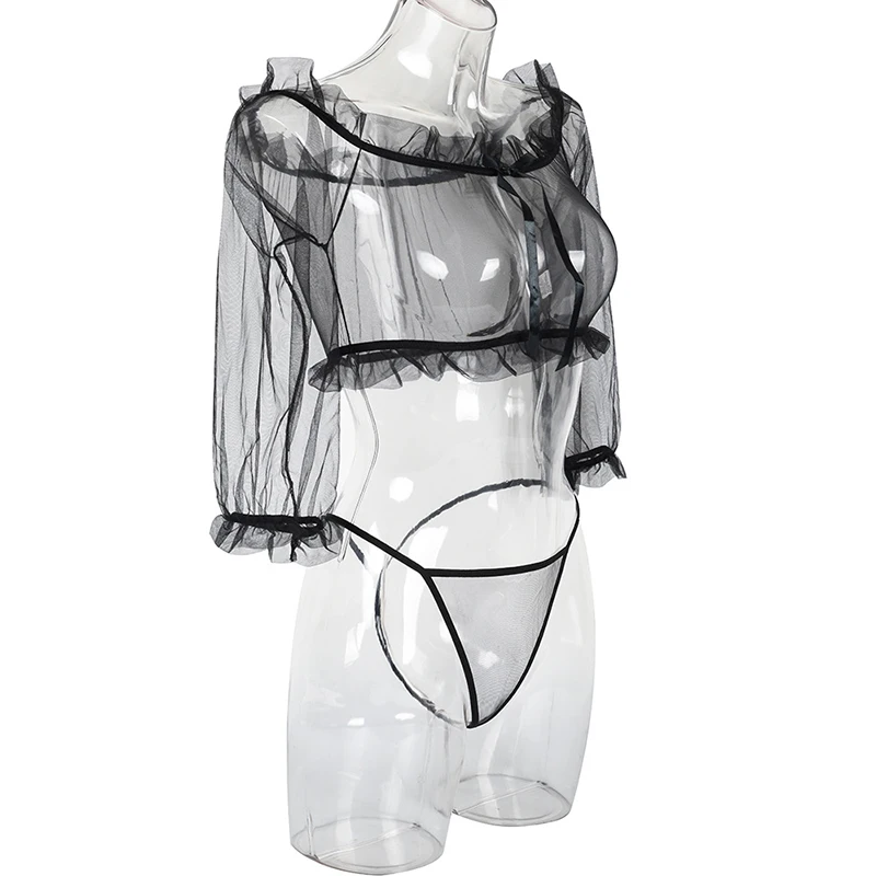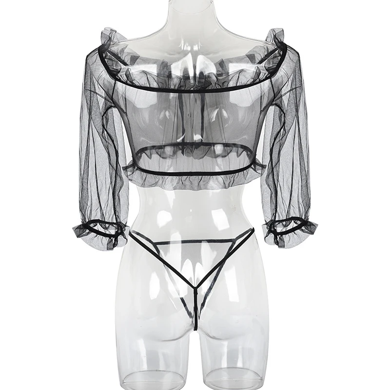 Women Sexy Lingerie Ruffle Erotic Tank Top Nightwear Hollow Out Transparent Fishnet Long Sleeve Loose Bra Tops Cropped Feminino