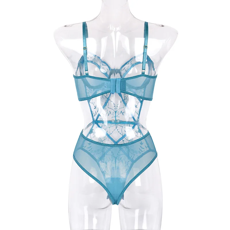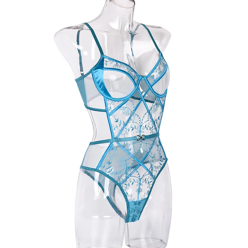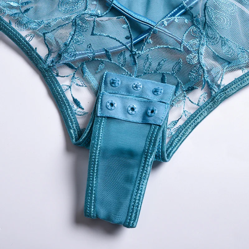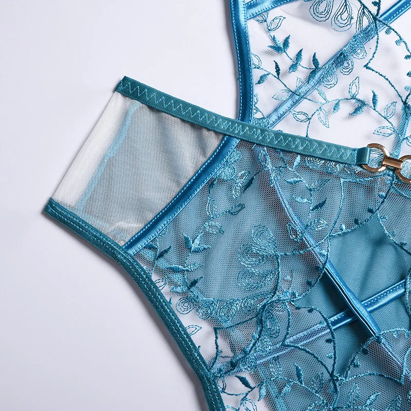 Women Sexy Sensual Lingerie Bodysuit Underwear Erotic Lace Embroidery Hollow Out Mesh Bra with Garters Set Exotic Costumes