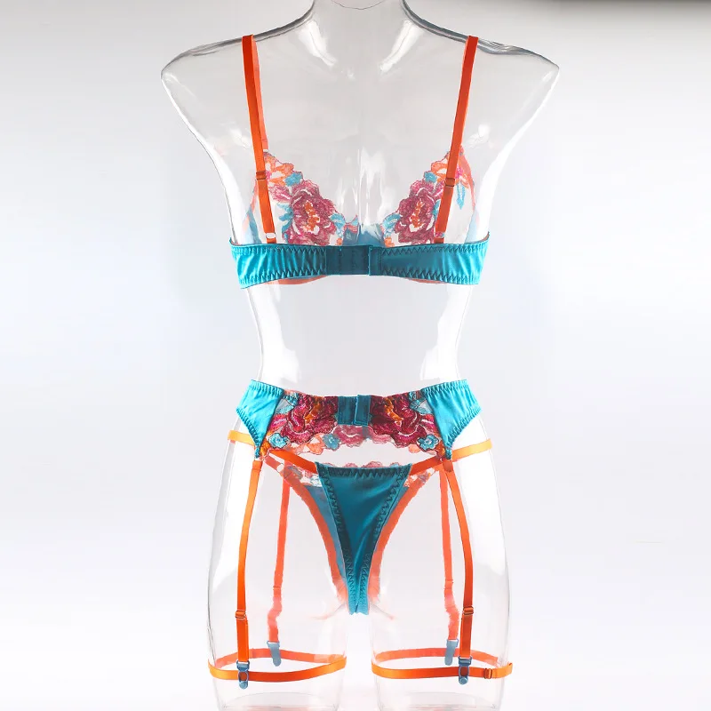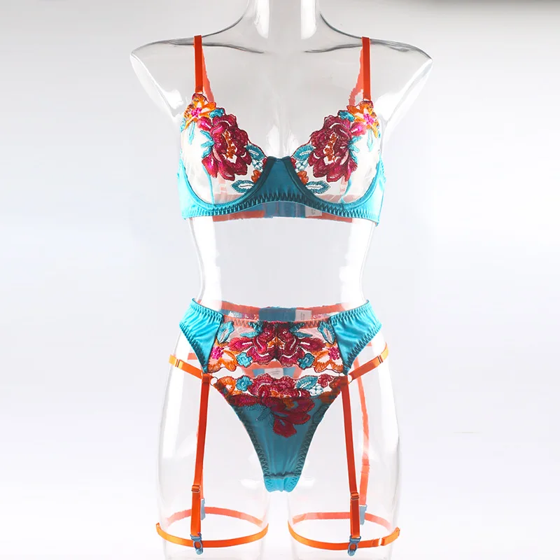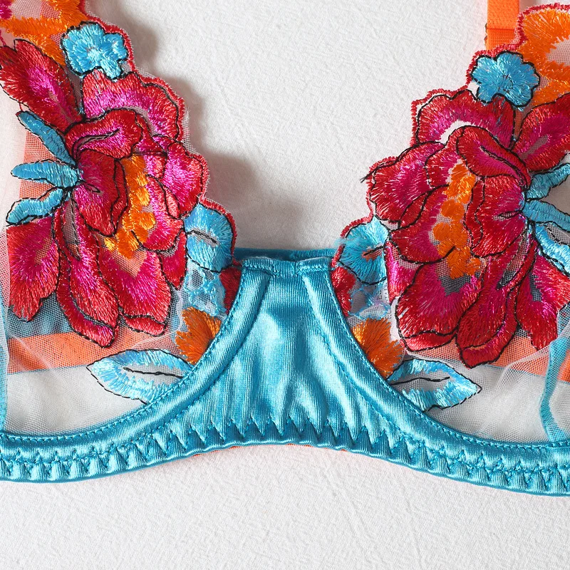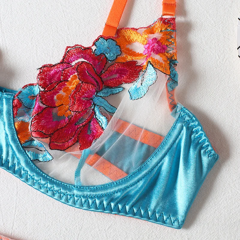 Women Summer Sexy Embroider Underwear See-Through Exotic Costumes Bra and Thong Sensual Lingerie 4 Pieces Erotic Temptation Set