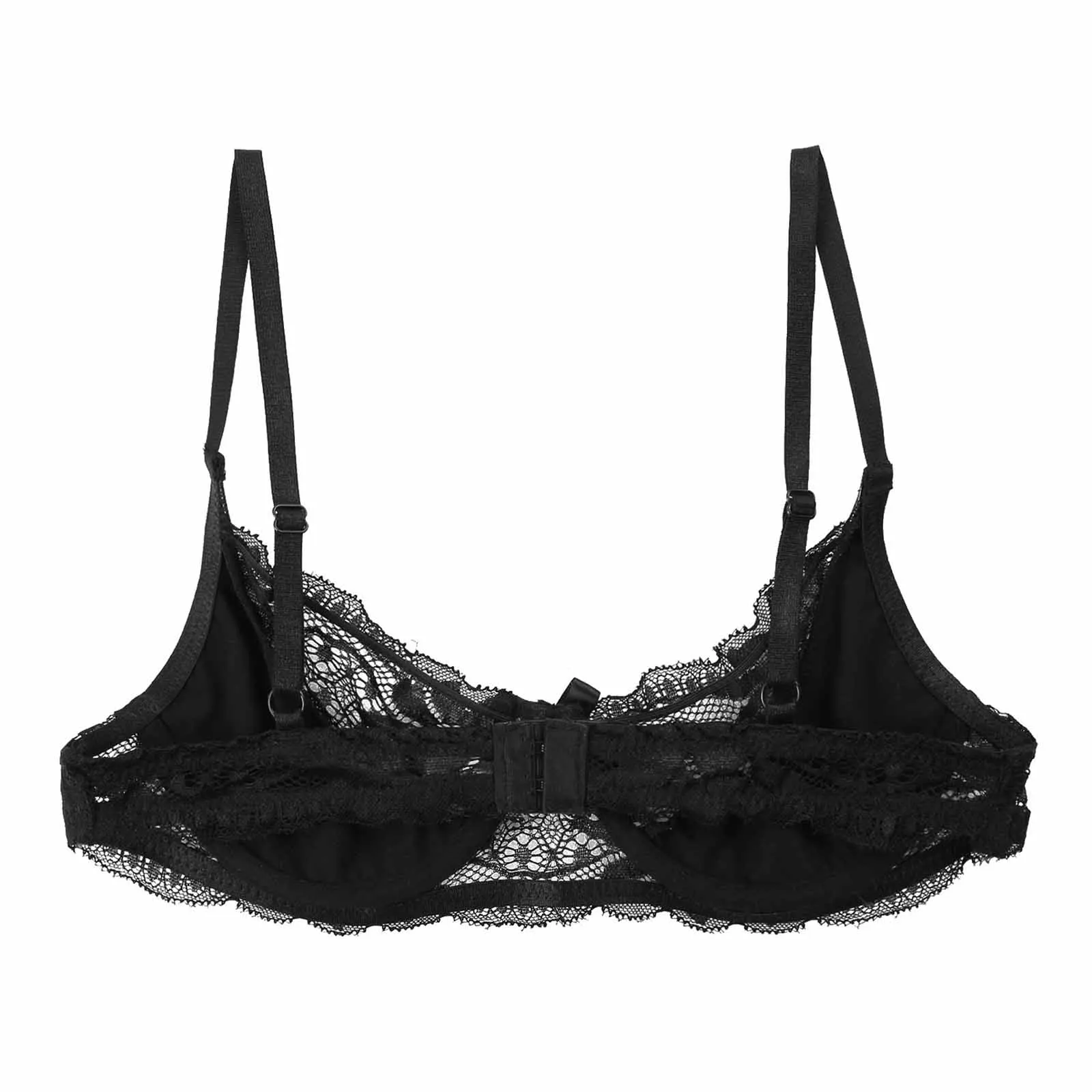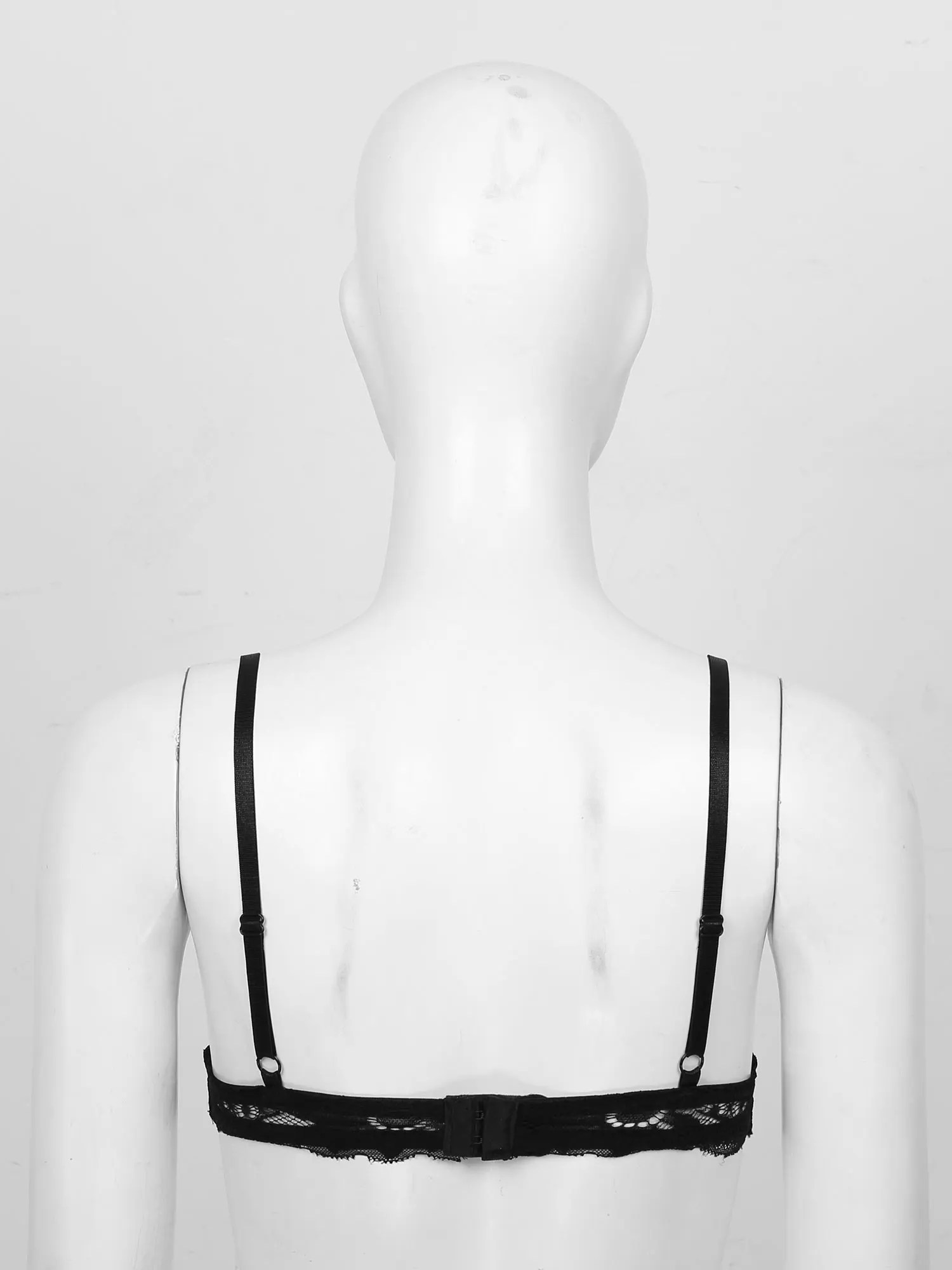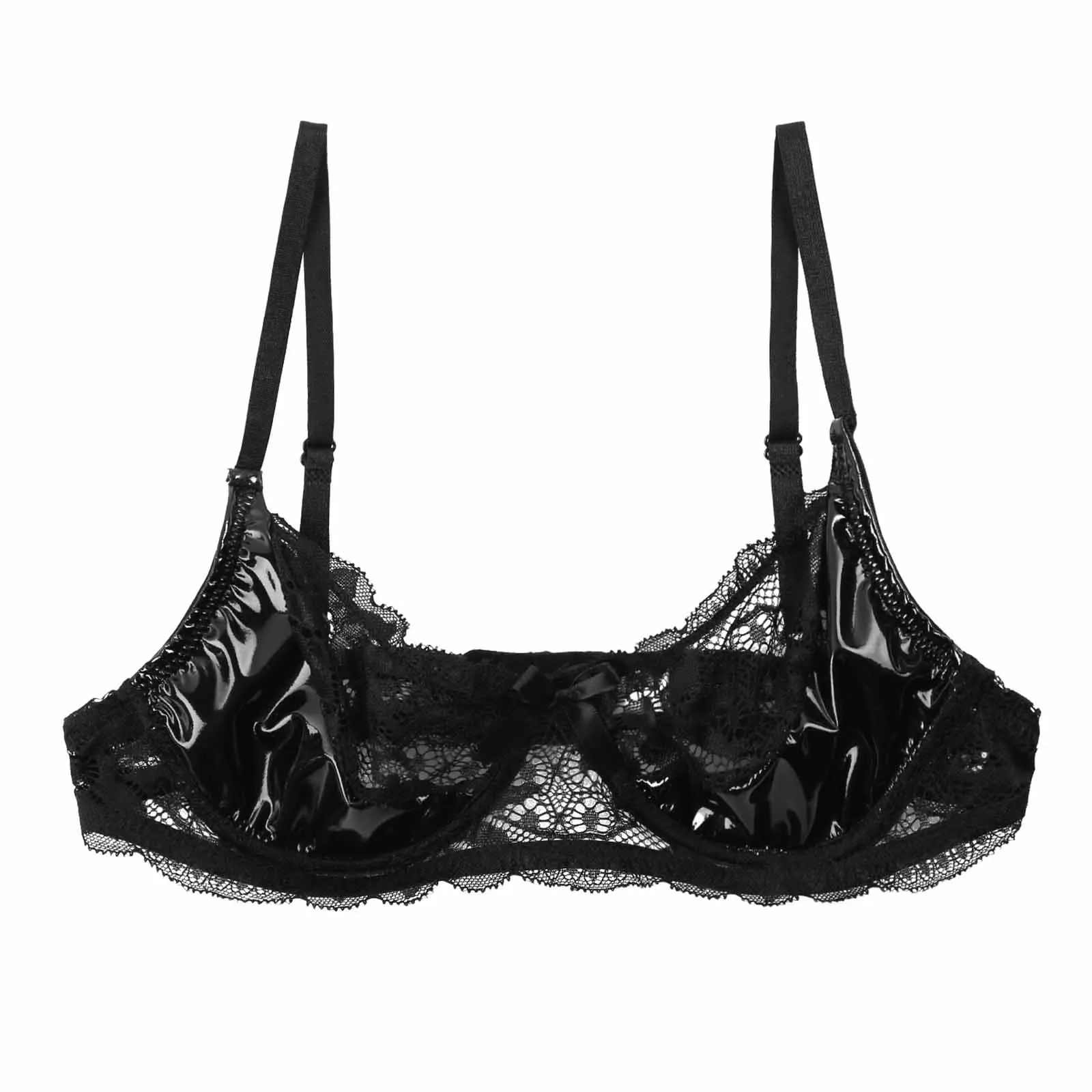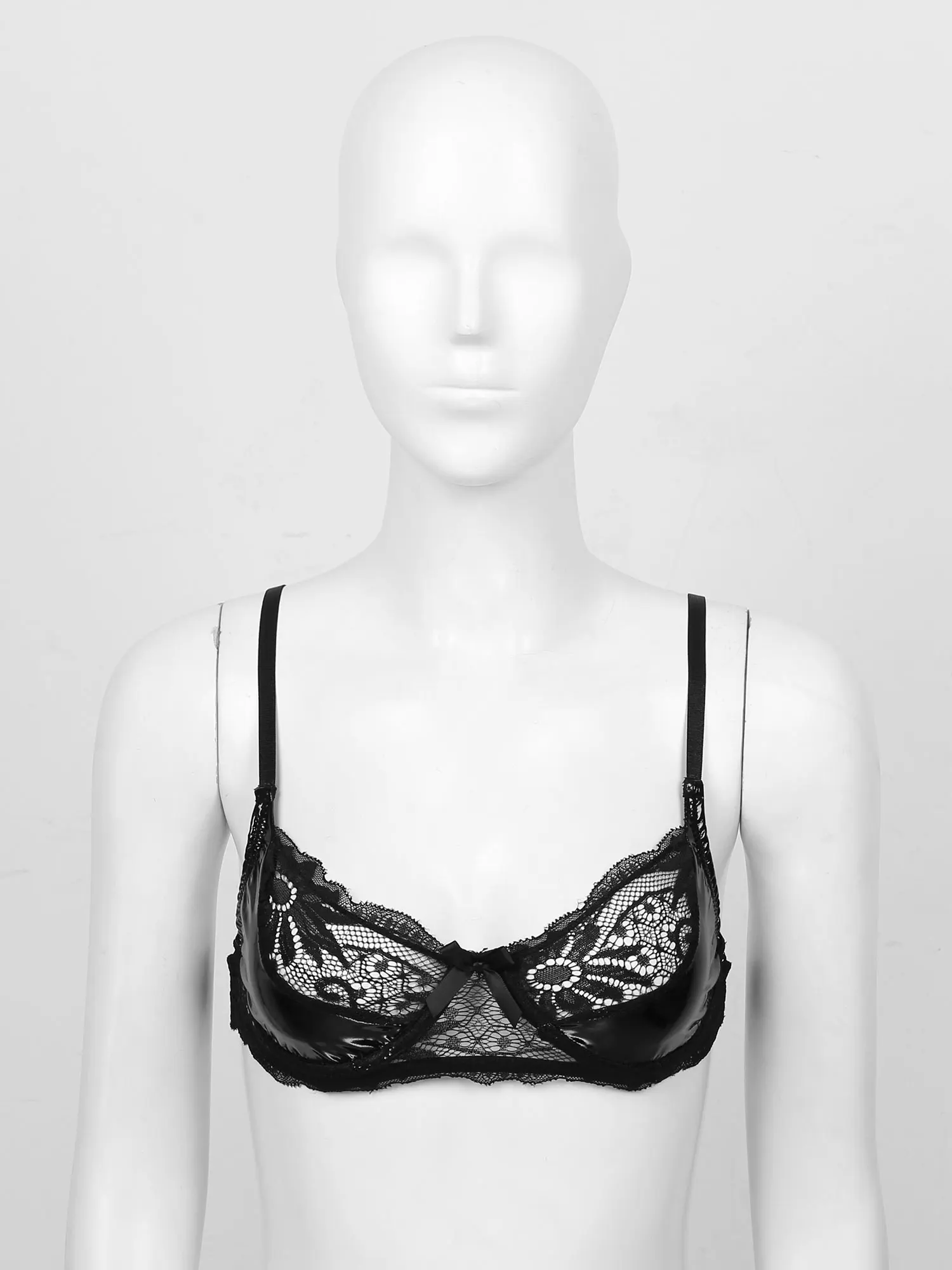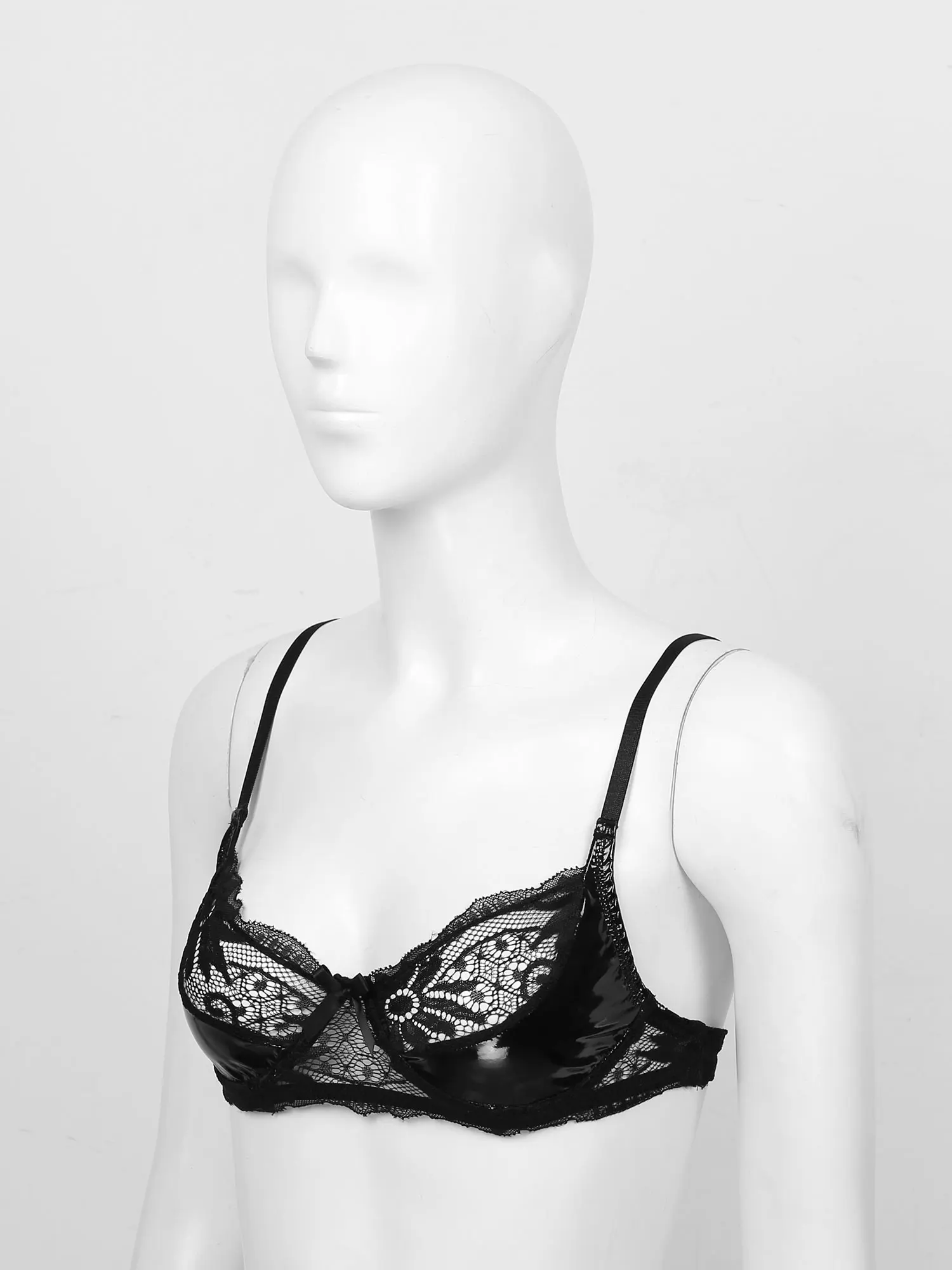 Womens Lingerie See-through Bra Floral Pattern Lace Patent Leather Patchwork Underwire Hot Bra Nightwear Erotic Sexy Underwear