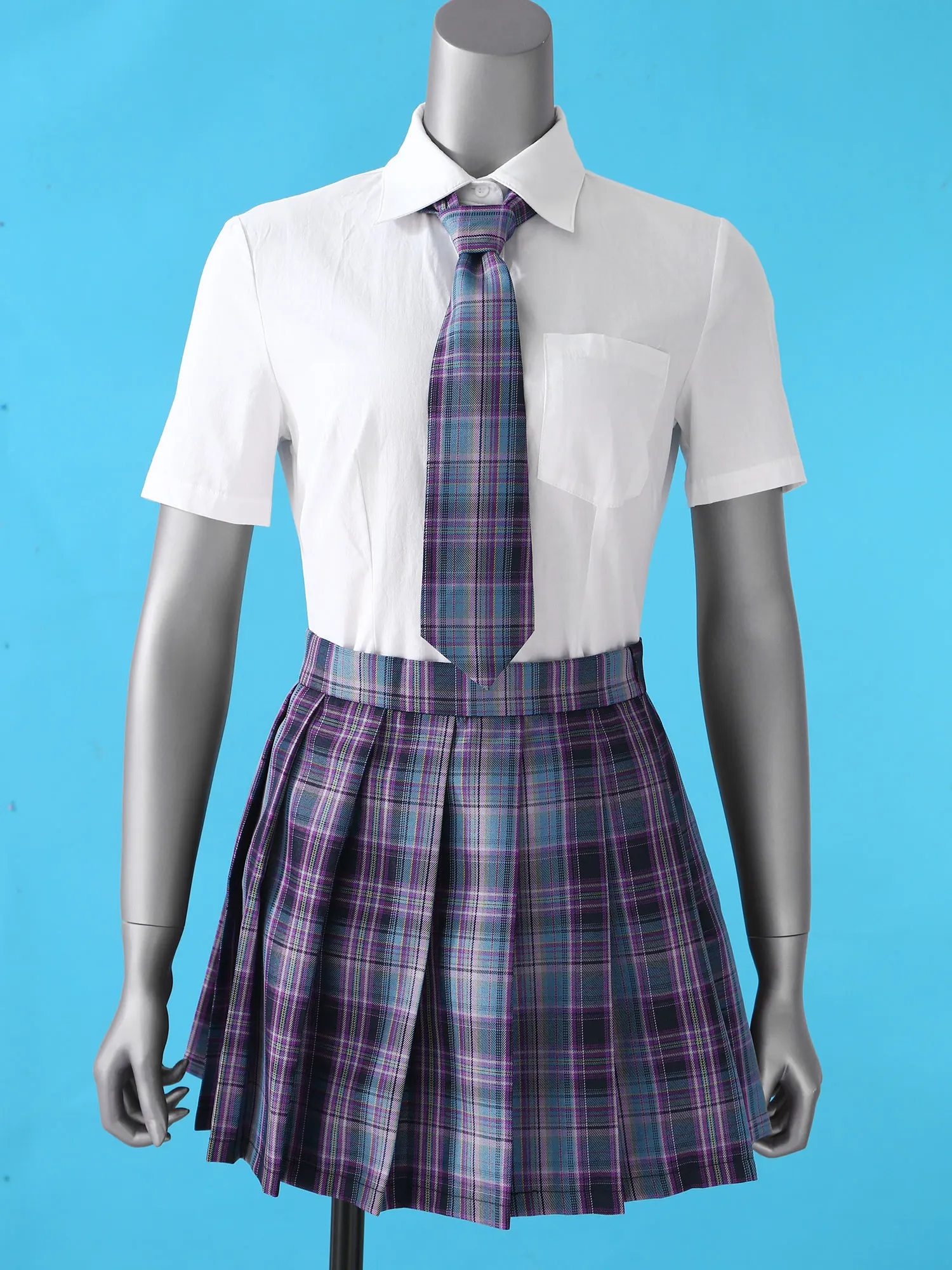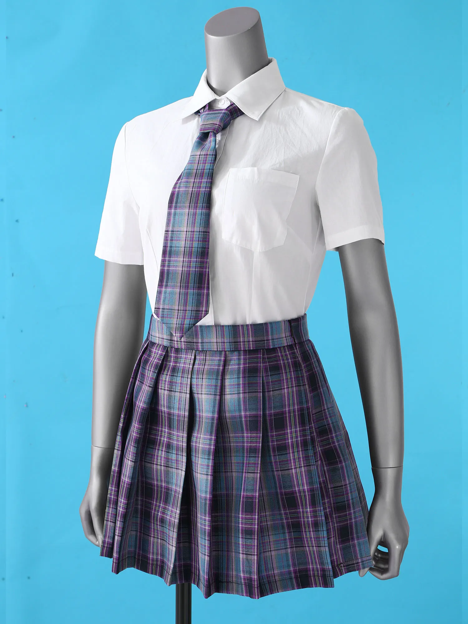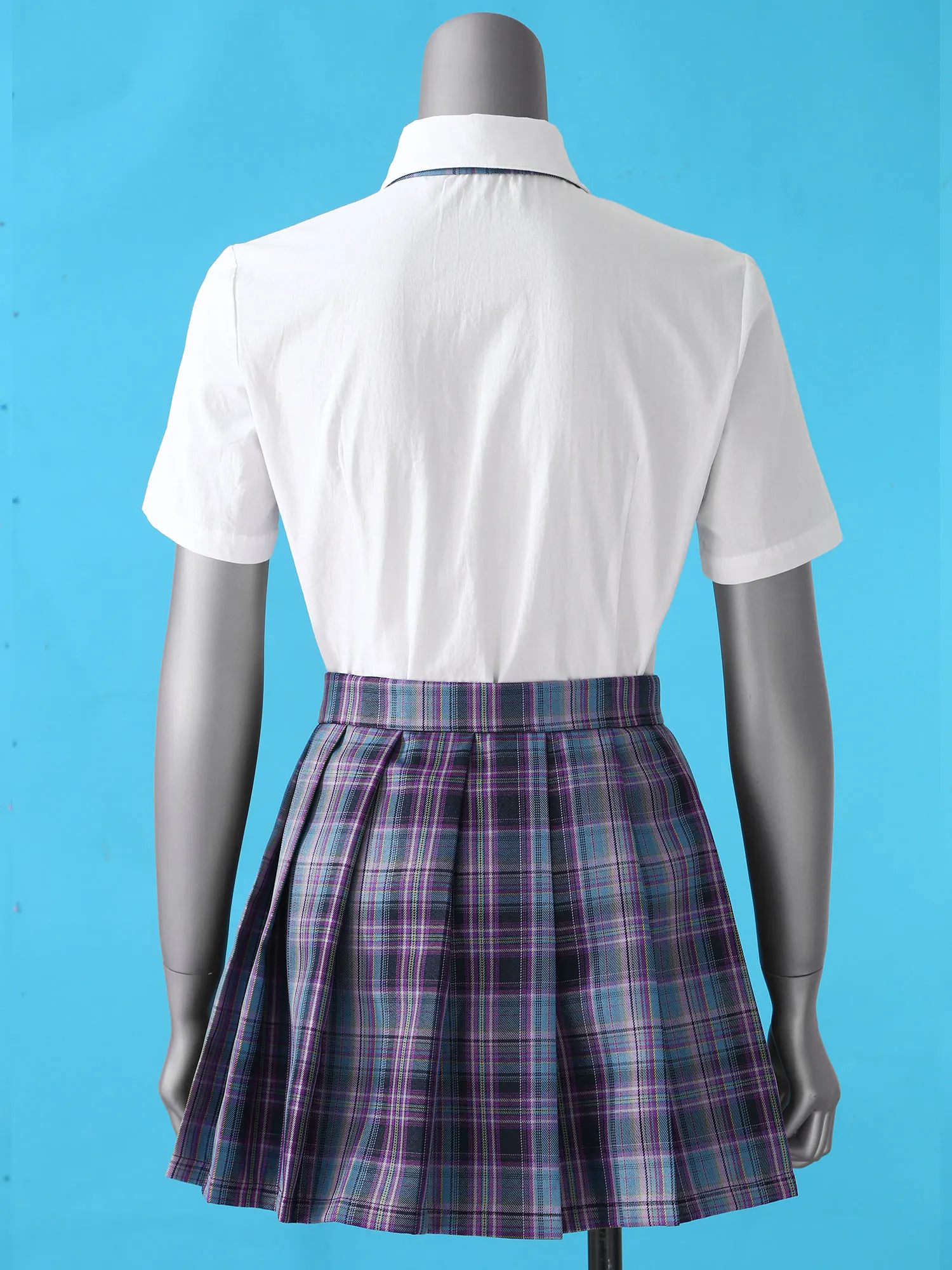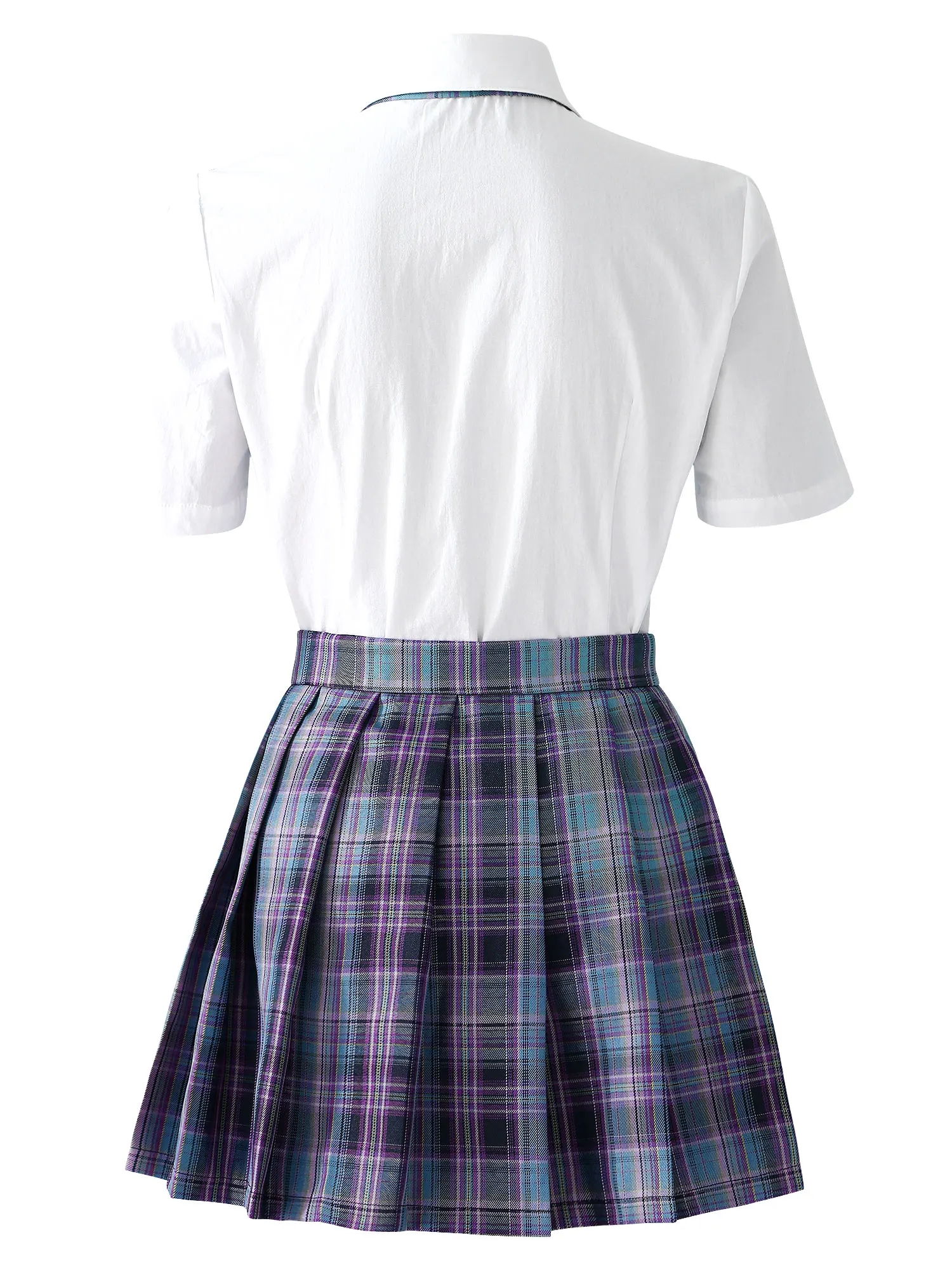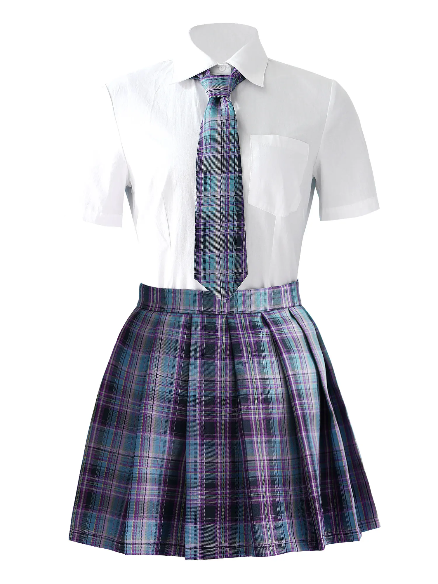 Women Schoolgirl Uniform Outfits Short Sleeve Button Down Shirt with Plaid Pleated Skirt Bow Tie.