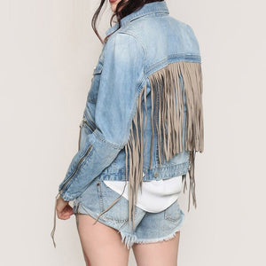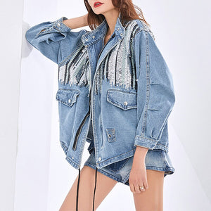 2021 Spring Cropped Fringe Denim Jacket Waistcoat Jeans Women Patchwork Blue Oversized Crop Sequin Coat Gothic Jean Jackets