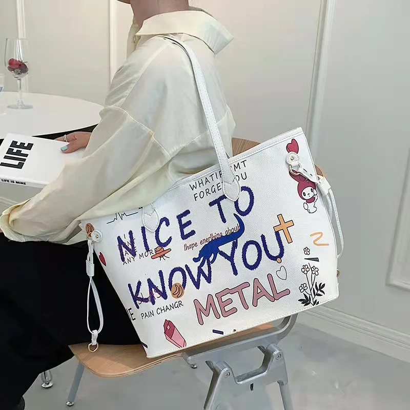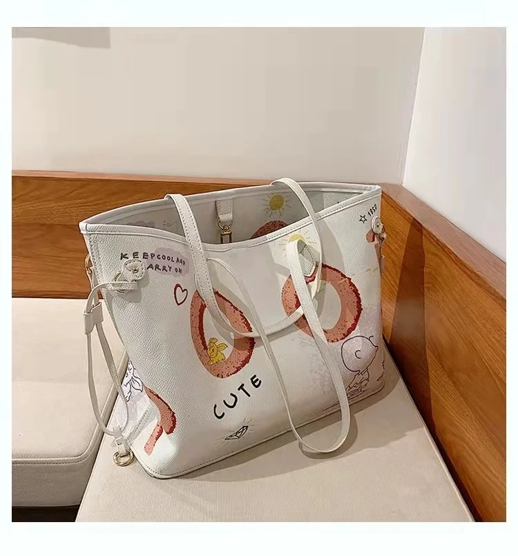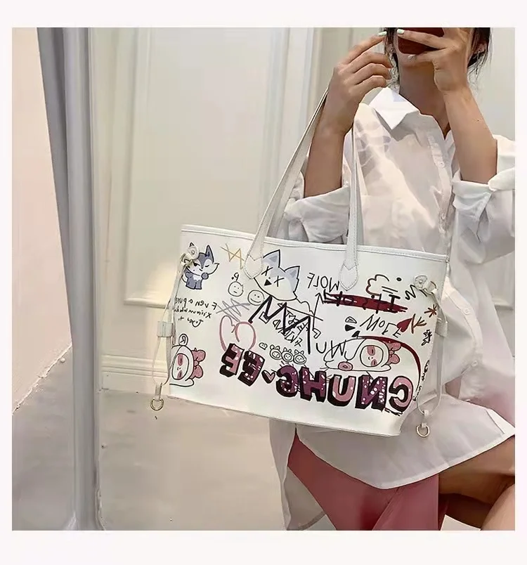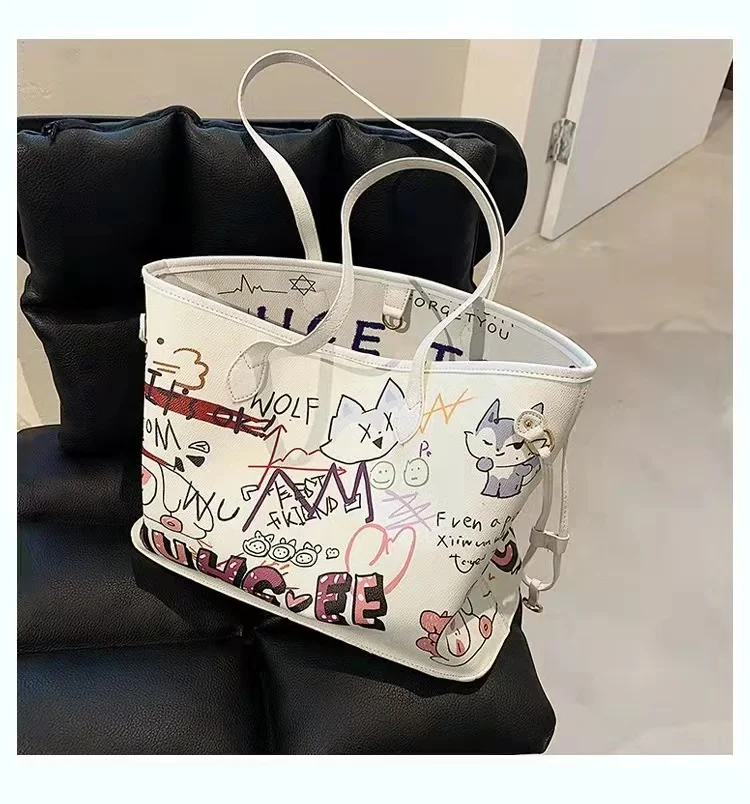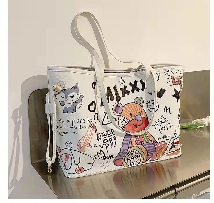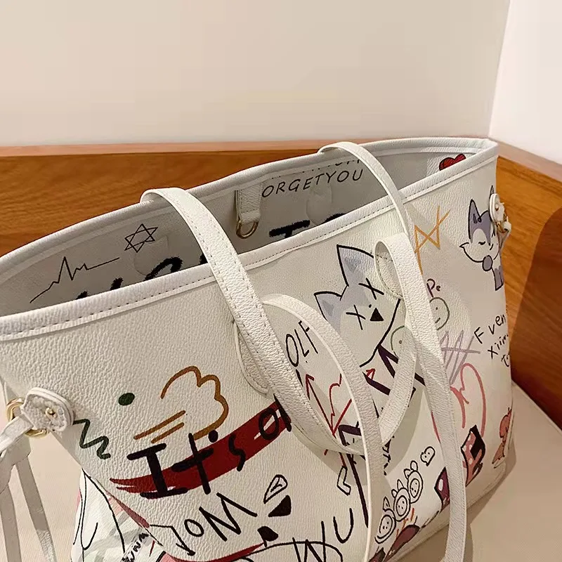Bolsa tote feminina com estampa de desenho, bolsa de mão de couro pu de alta capacidade, bolsa de ombro para compras