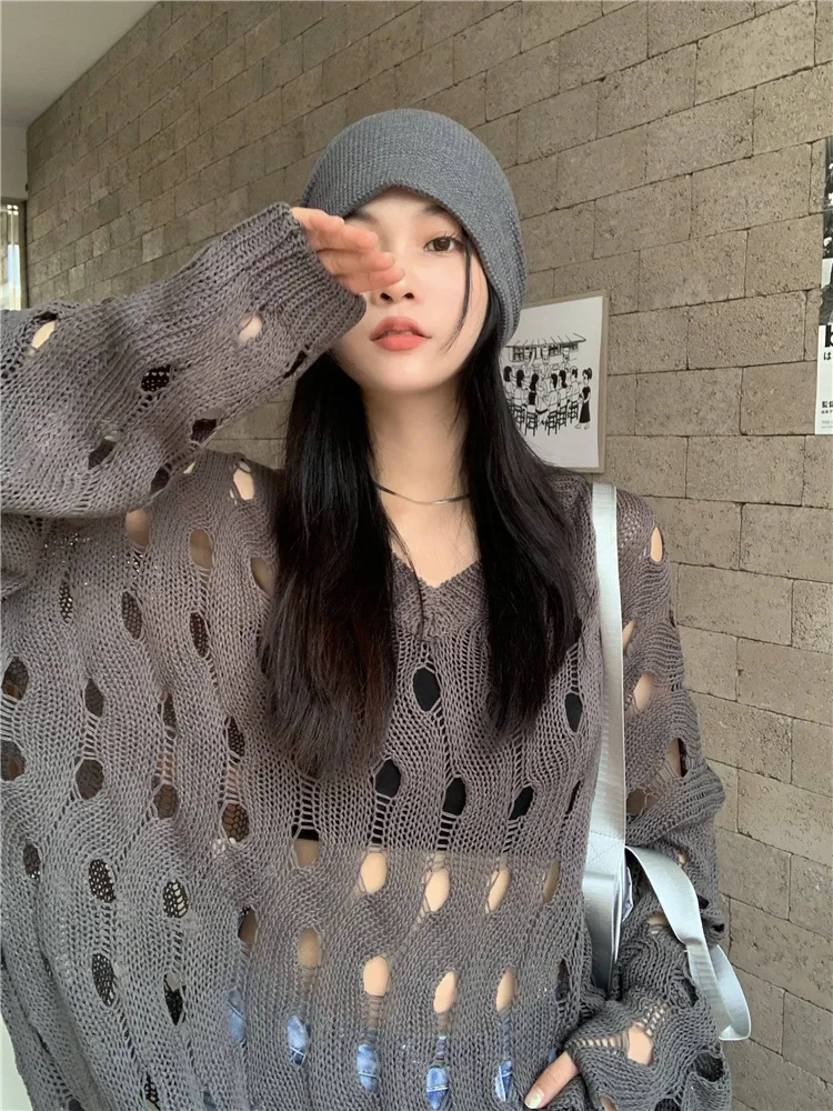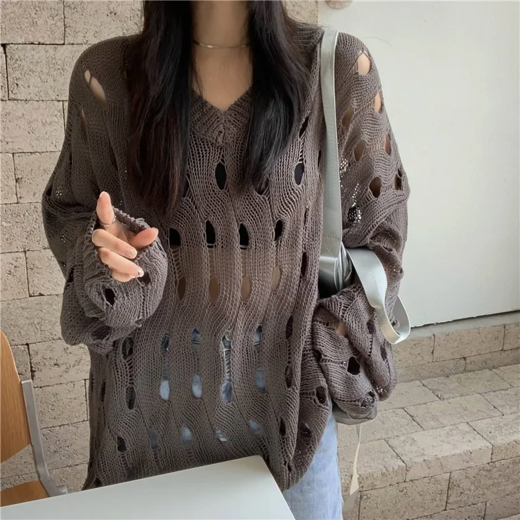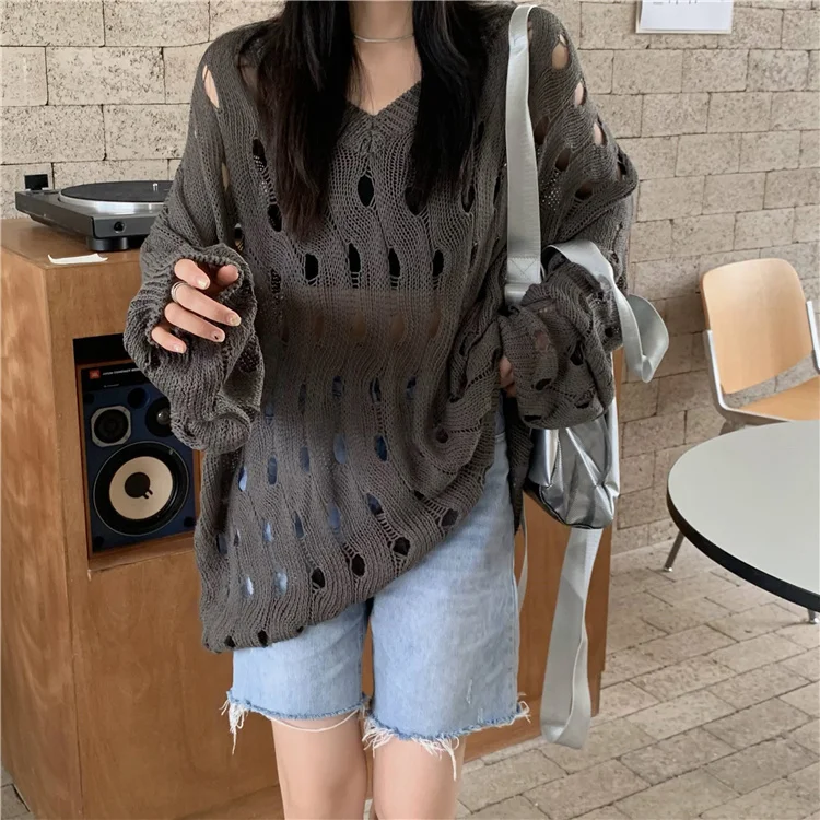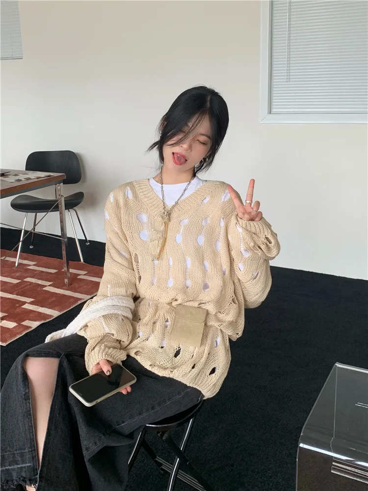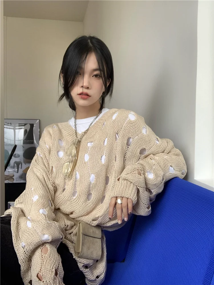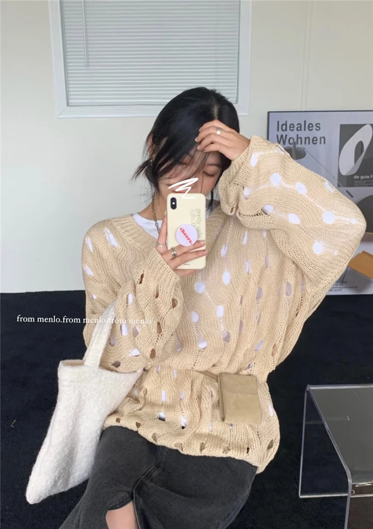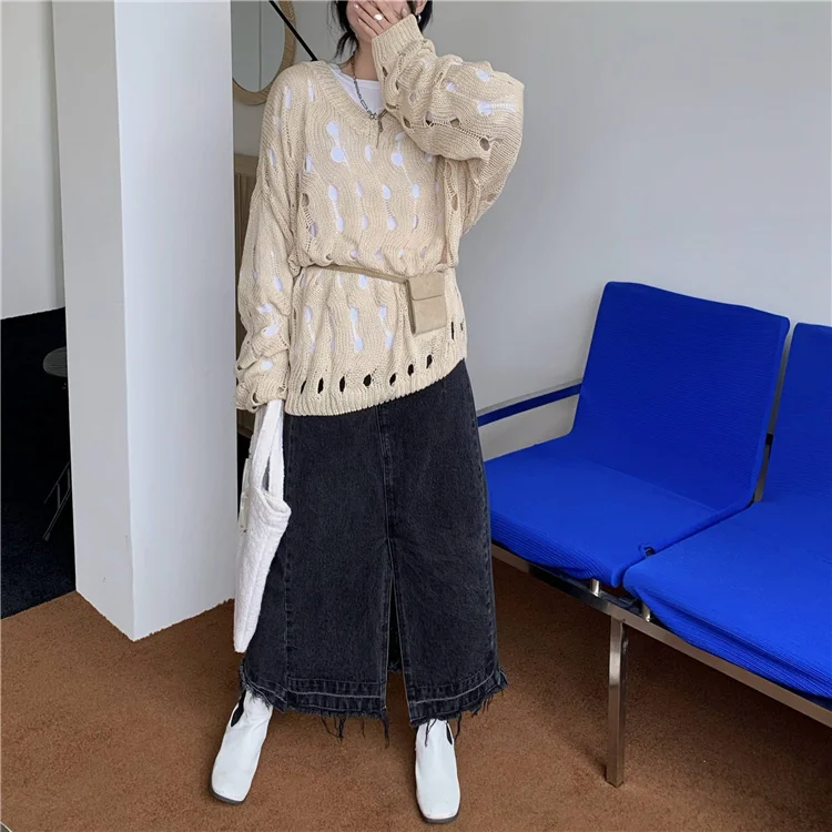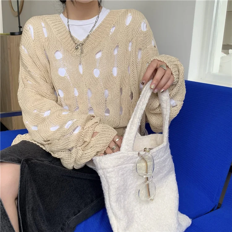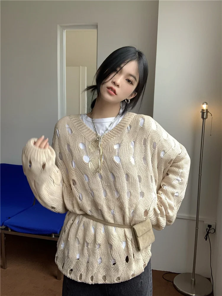 Chic V-neck Sweater Bottoming Hollow-out Sweater for Women 2021 New Autumn and Winter Black Thin Inner Top