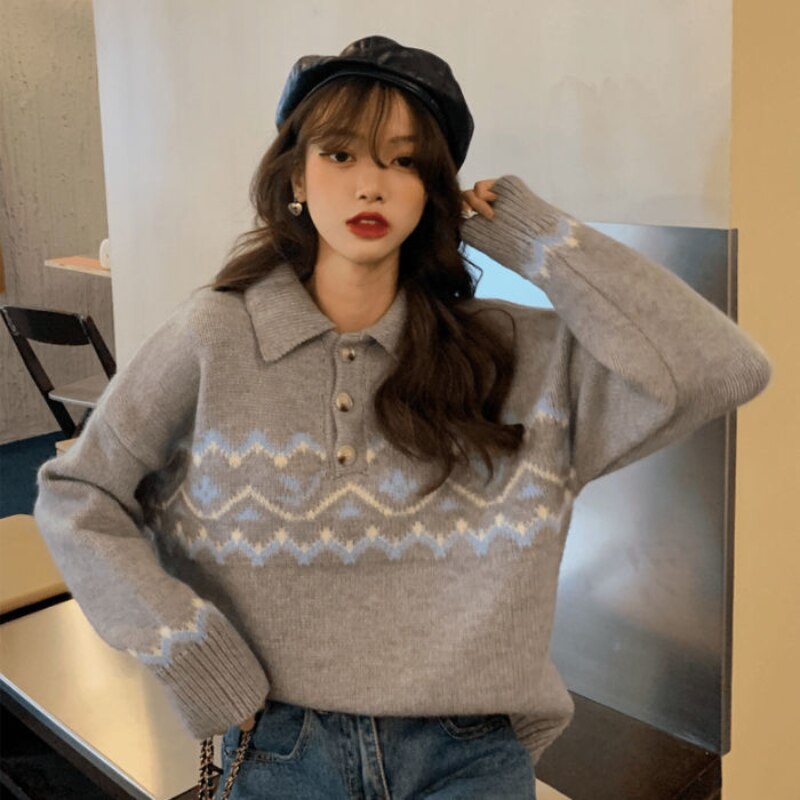 College Style Retro POLO Collar Pullover Jacquard Sweater Female Student Korean Version Loose Knit Sweater Coat Jacket