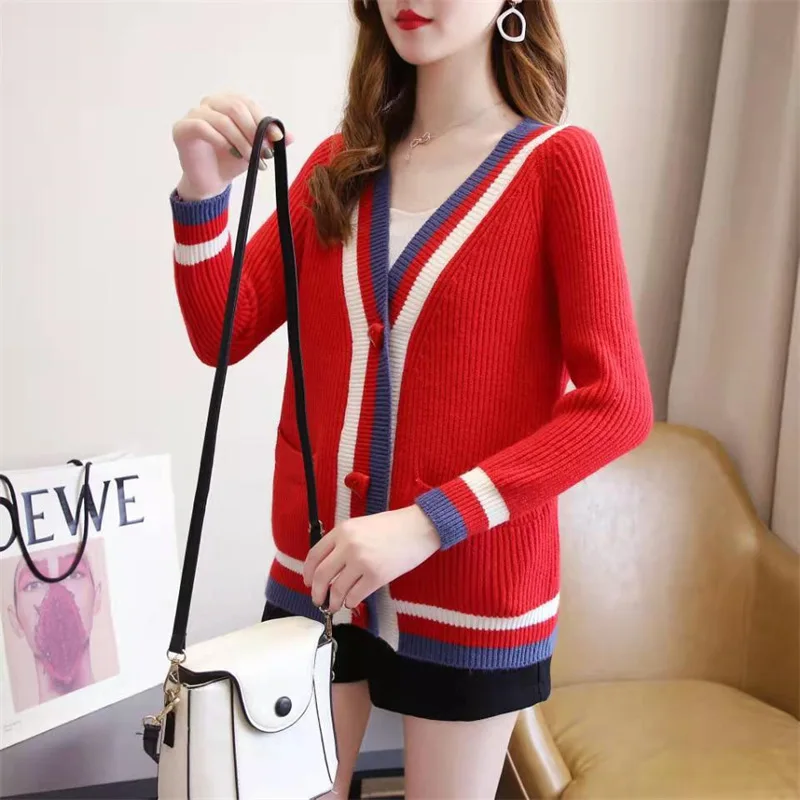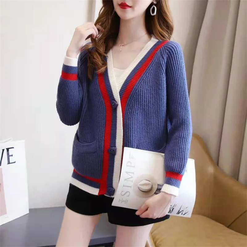 Knitted Cardigan Women Spring and Autumn 2021 New V-neck Sweater Foreign Style Simple Color Matching Loose Top outer Wear