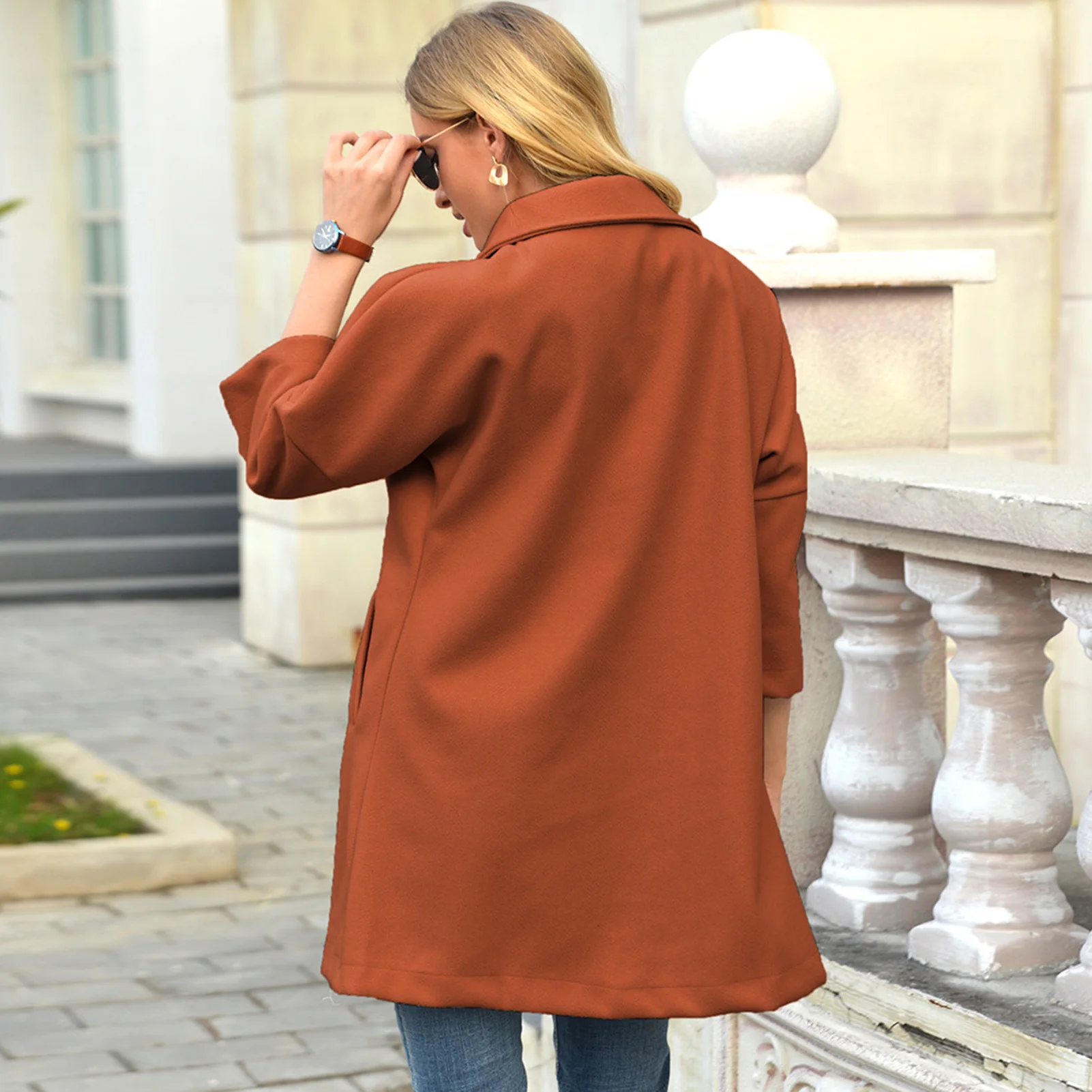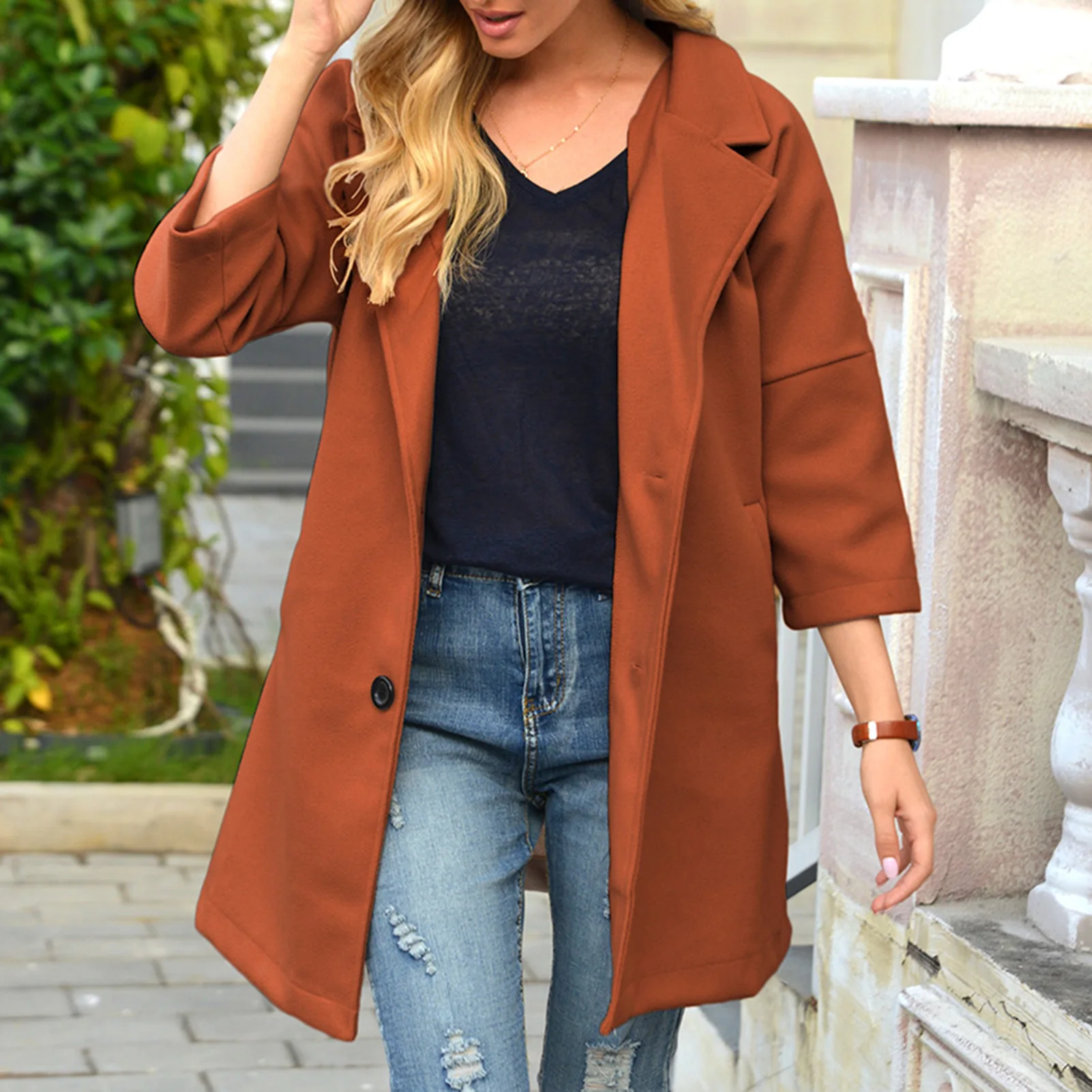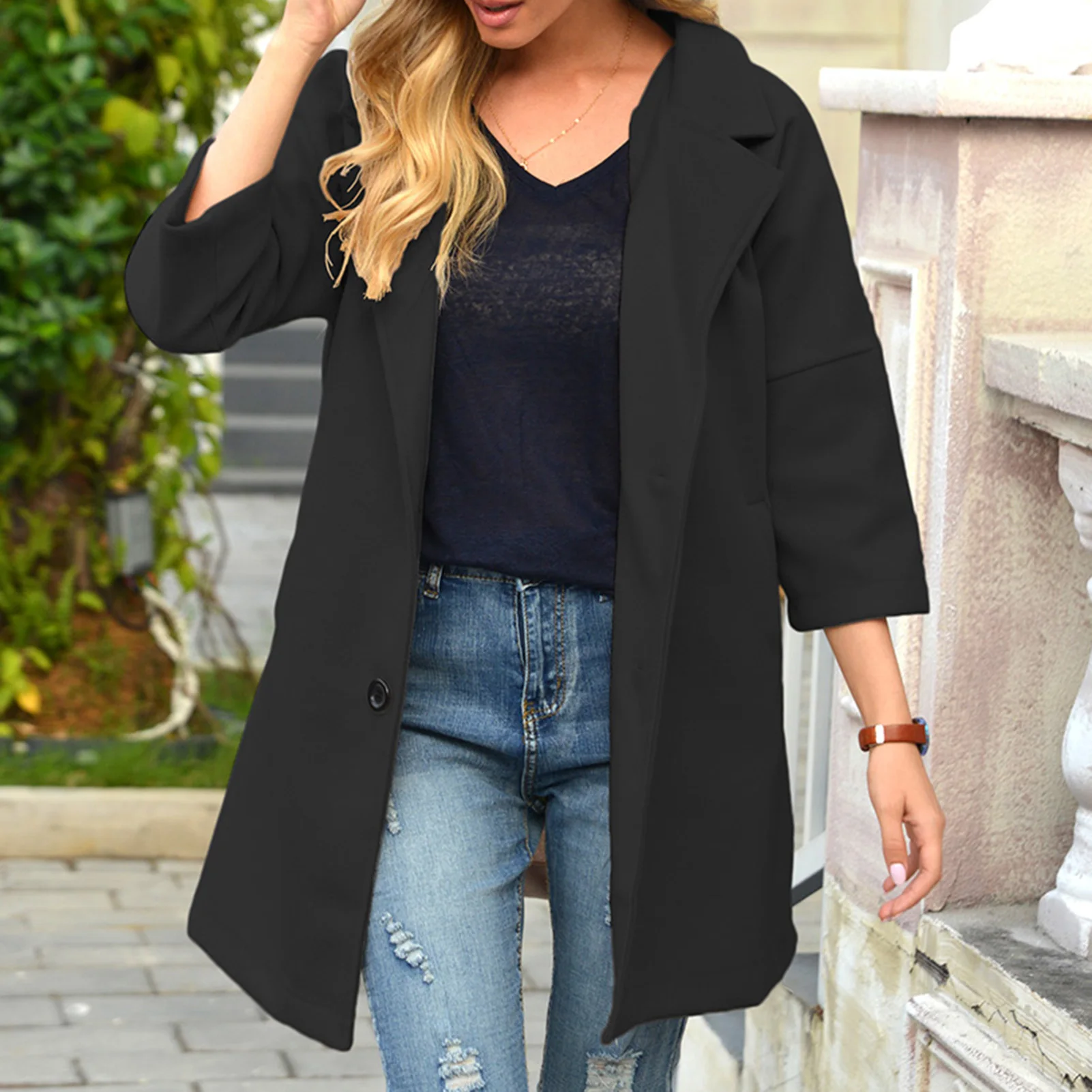 Long pattern coat in solid color features turn-down collar, three quarter sleeves, buttons closure and pocket details. Pair it with jeans or wide leg pants to set a casual style in winter.