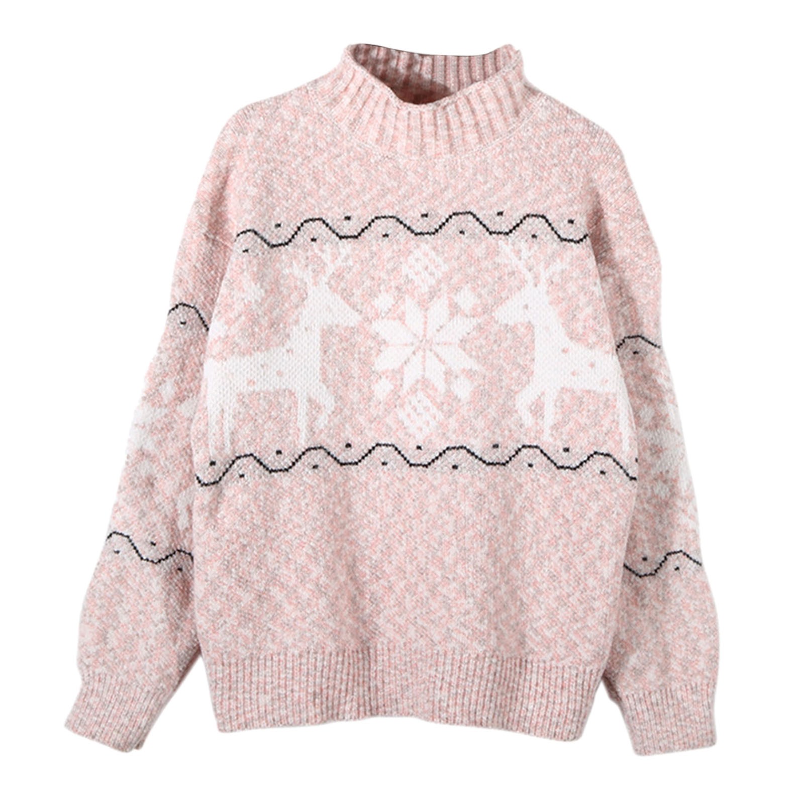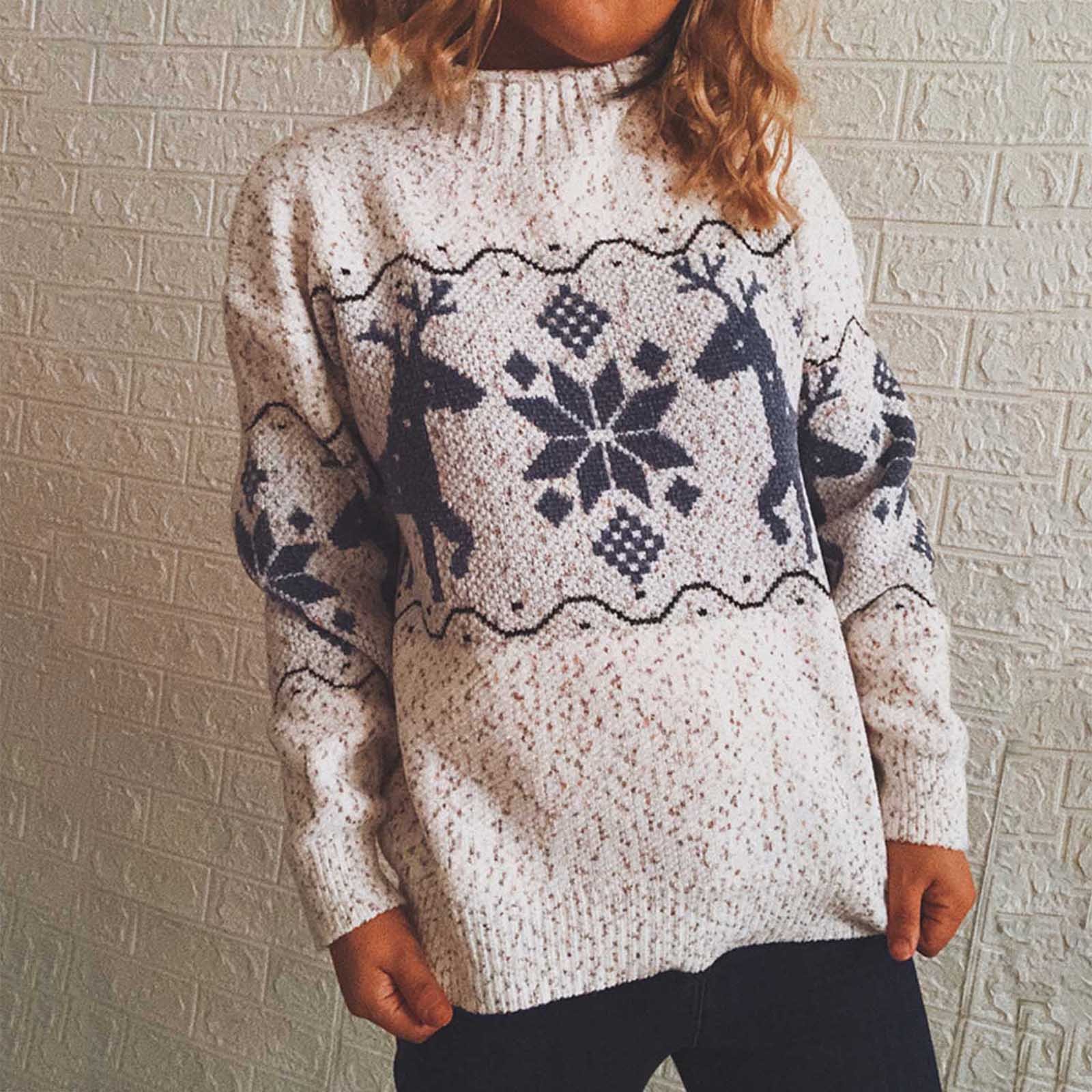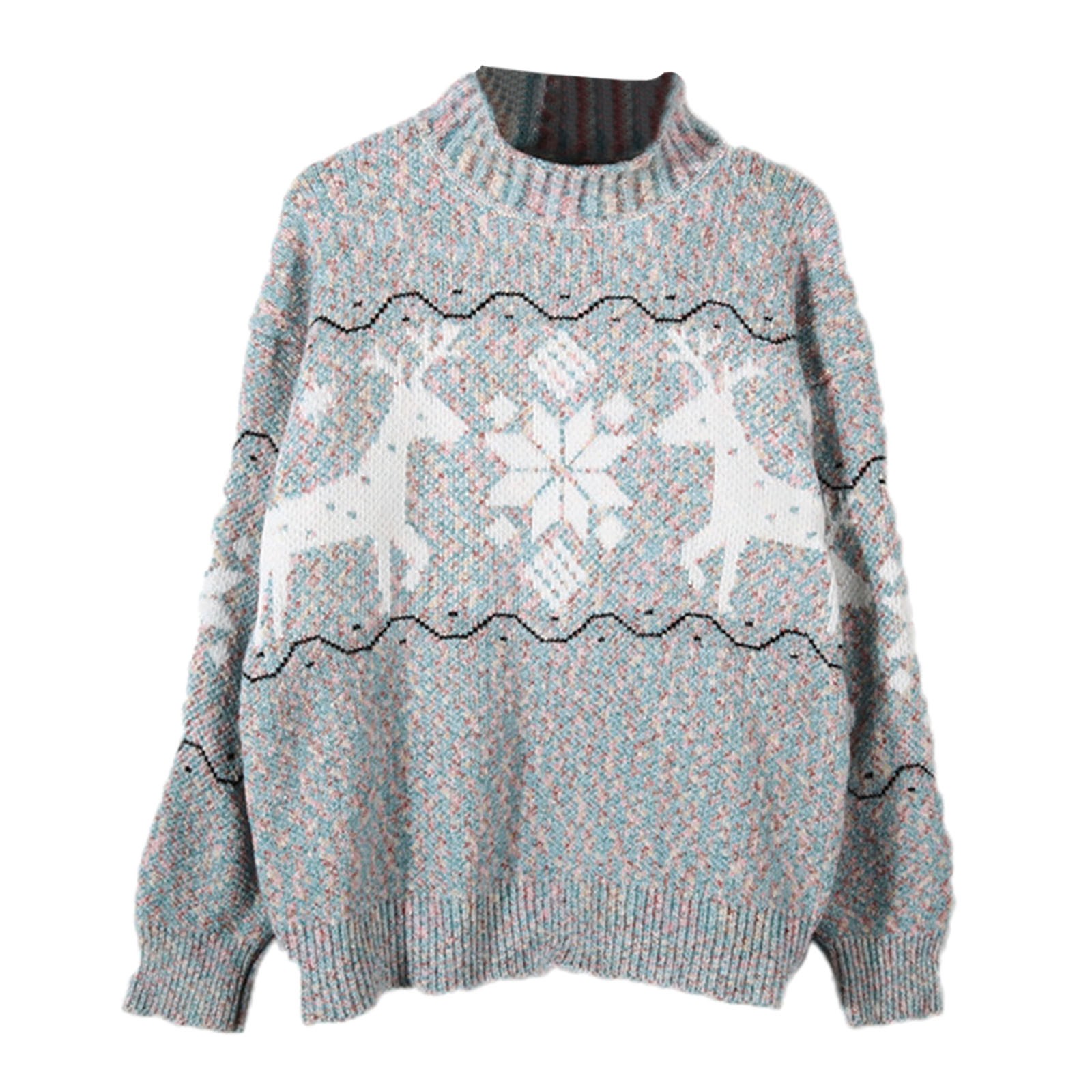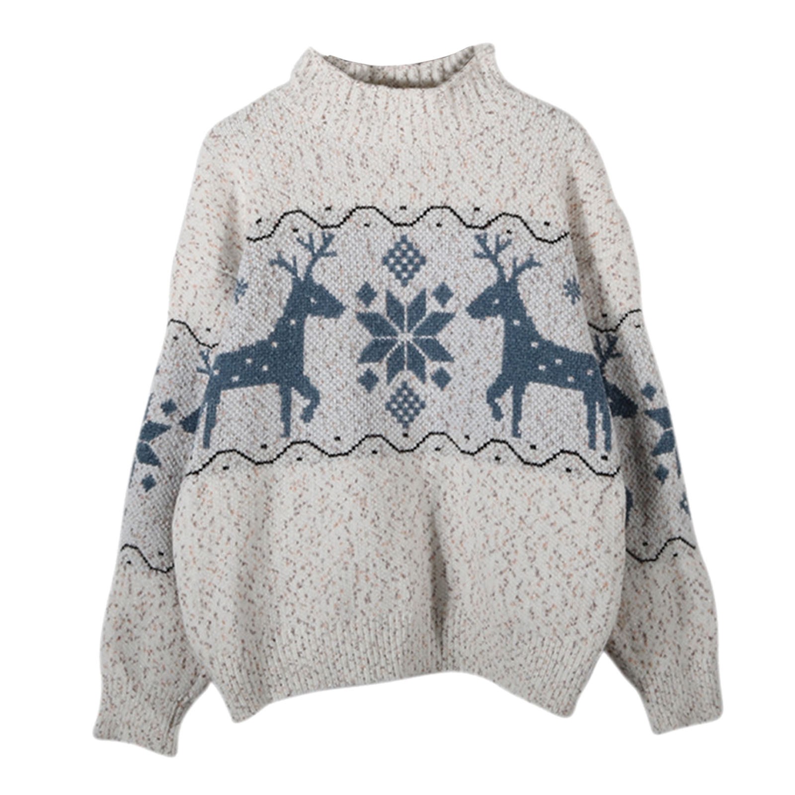 Ladies Christmas Wool Knit Round Neck Print Long-Sleeved Sweater Women