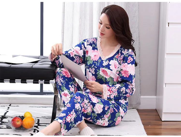Autumn Winter Women Pajamas Beautiful Flower Print Pajama Sets Cotton Long Sleeve Sleepwear Women Homewear Pyjama Suit