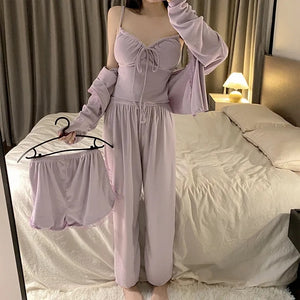 Pajamas For Women Sexy Bras Sleepwear Modal Suspender Trousers With Pajamas Four-Piece Set Sweet Bow Drawstring Loungewear